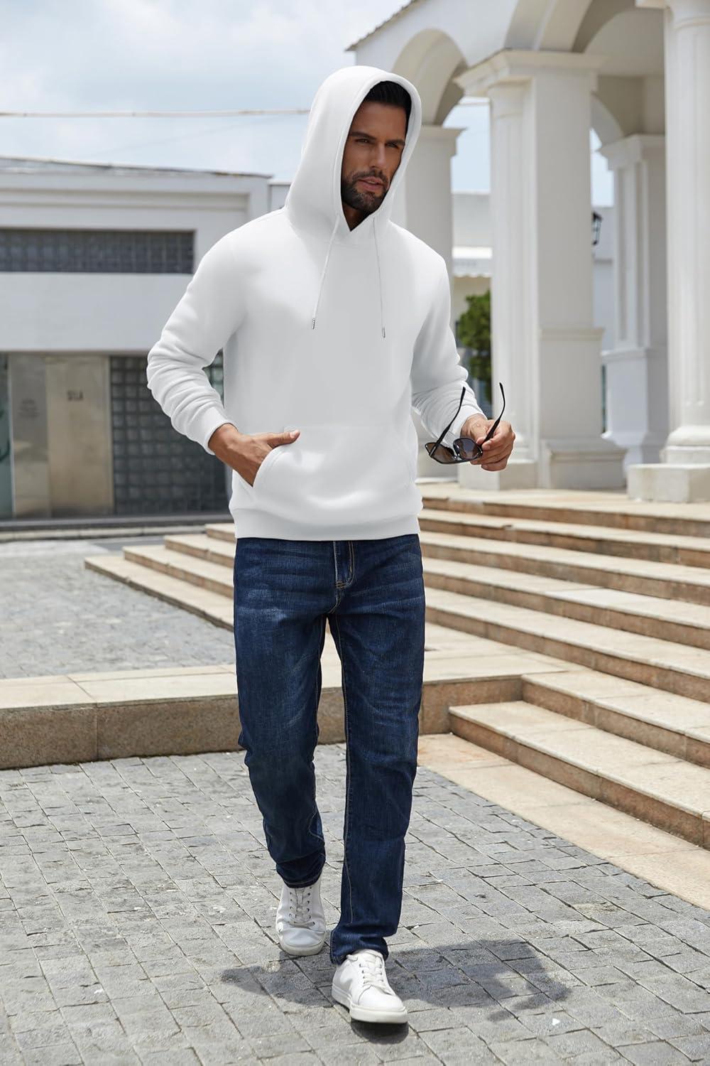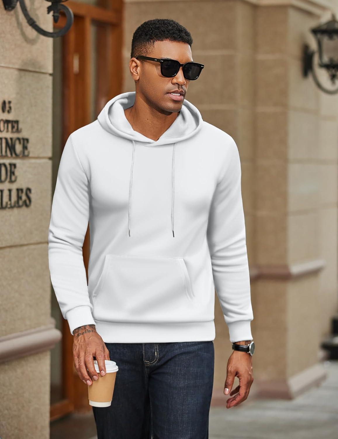 COOFANDY Men's Hoodies Pullover Fleece Lined Hoodie Casual Long Sleeve Drawstring Hooded Sweatshirts with Kanga Pocket(White)