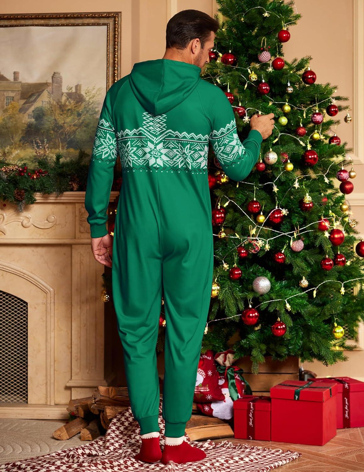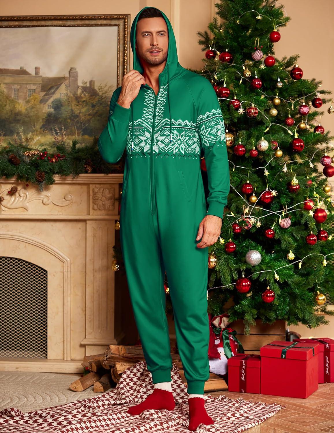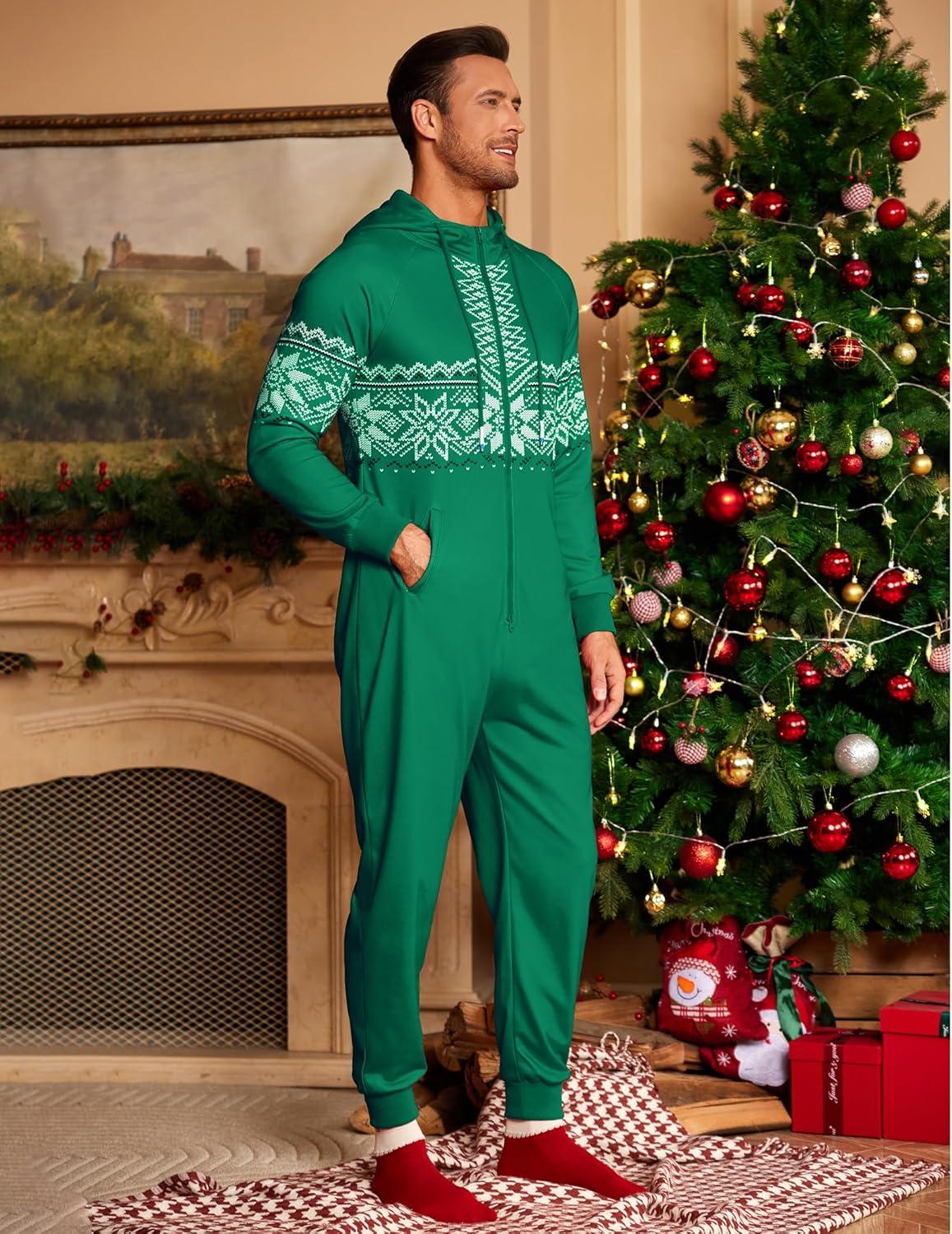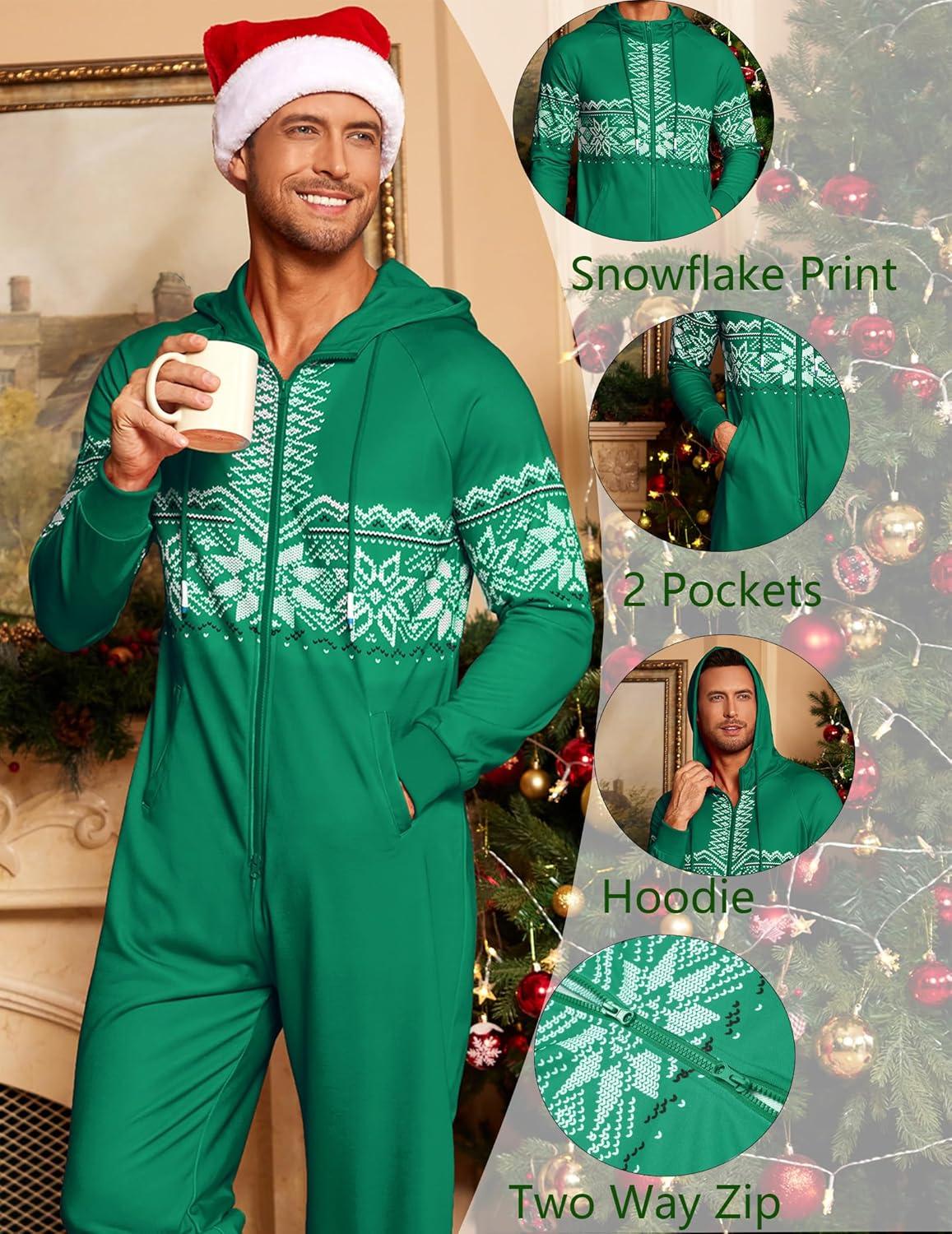 COOFANDY Mens Jumpsuit Onesie Rompers Drawtsring Hooded Full Zip One Piece Tracksuit with Pockets(Green Christmas)