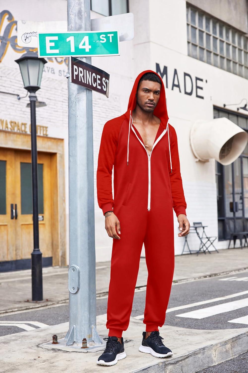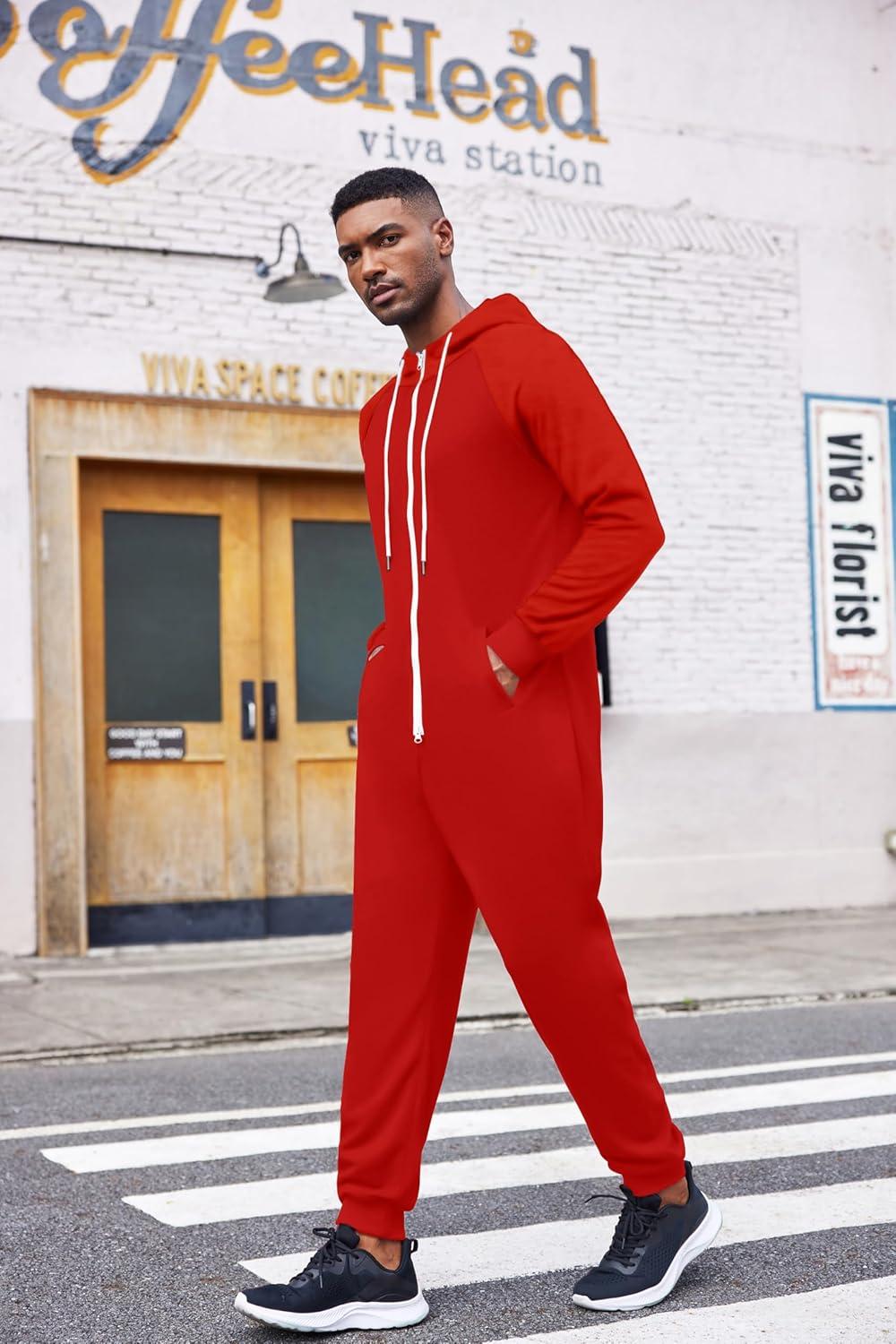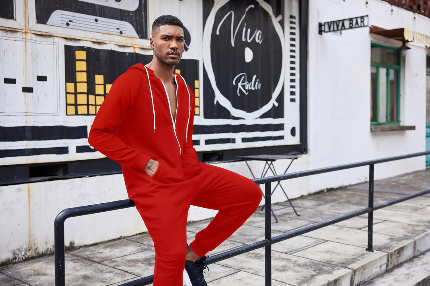 COOFANDY Mens Jumpsuit Onesie Rompers Drawtsring Hooded Full Zip One Piece Tracksuit with Pockets(Solid Red)