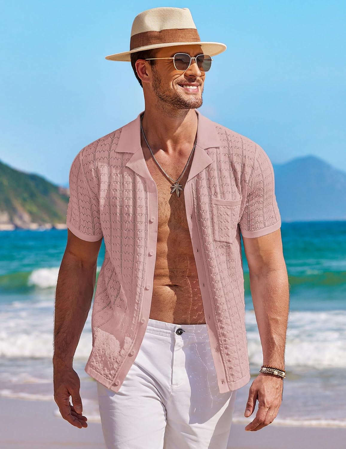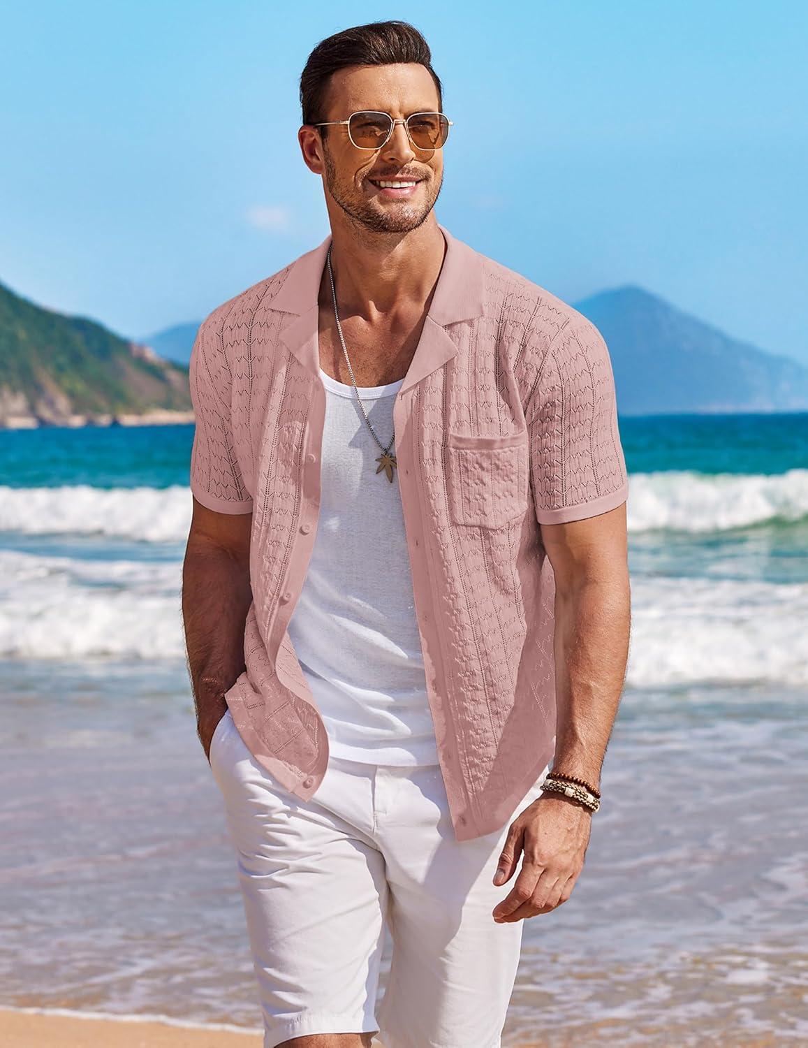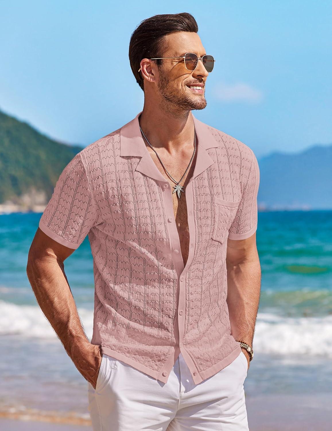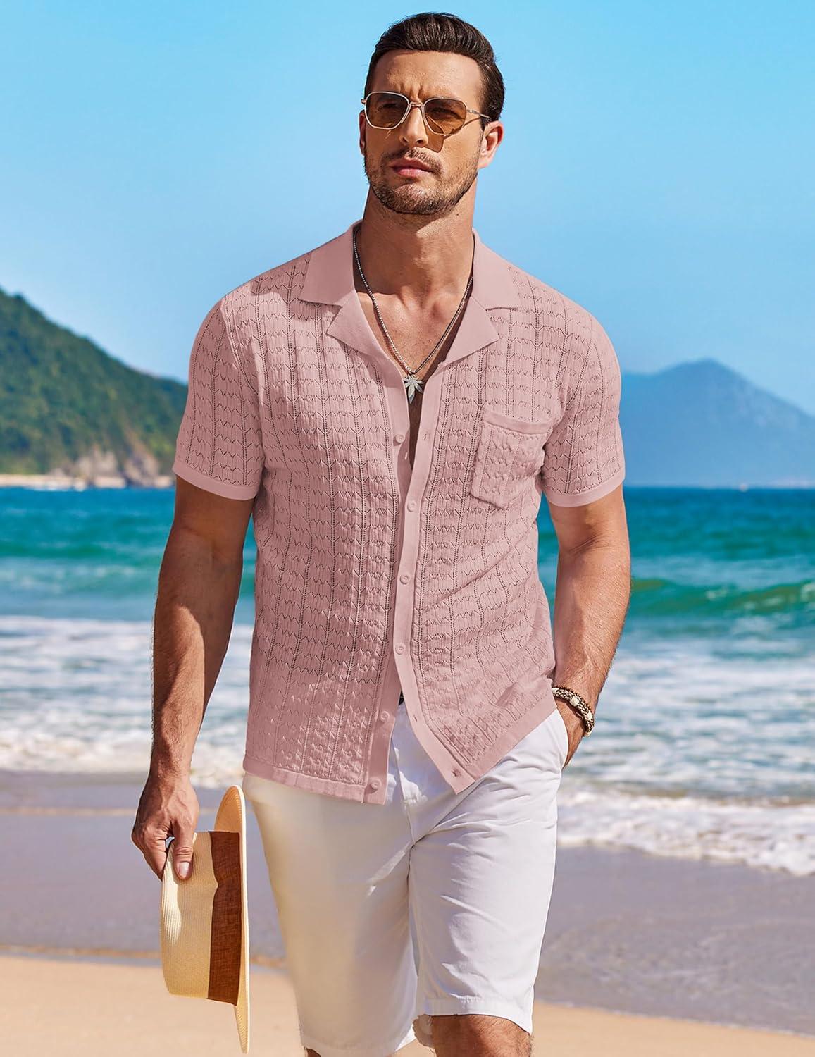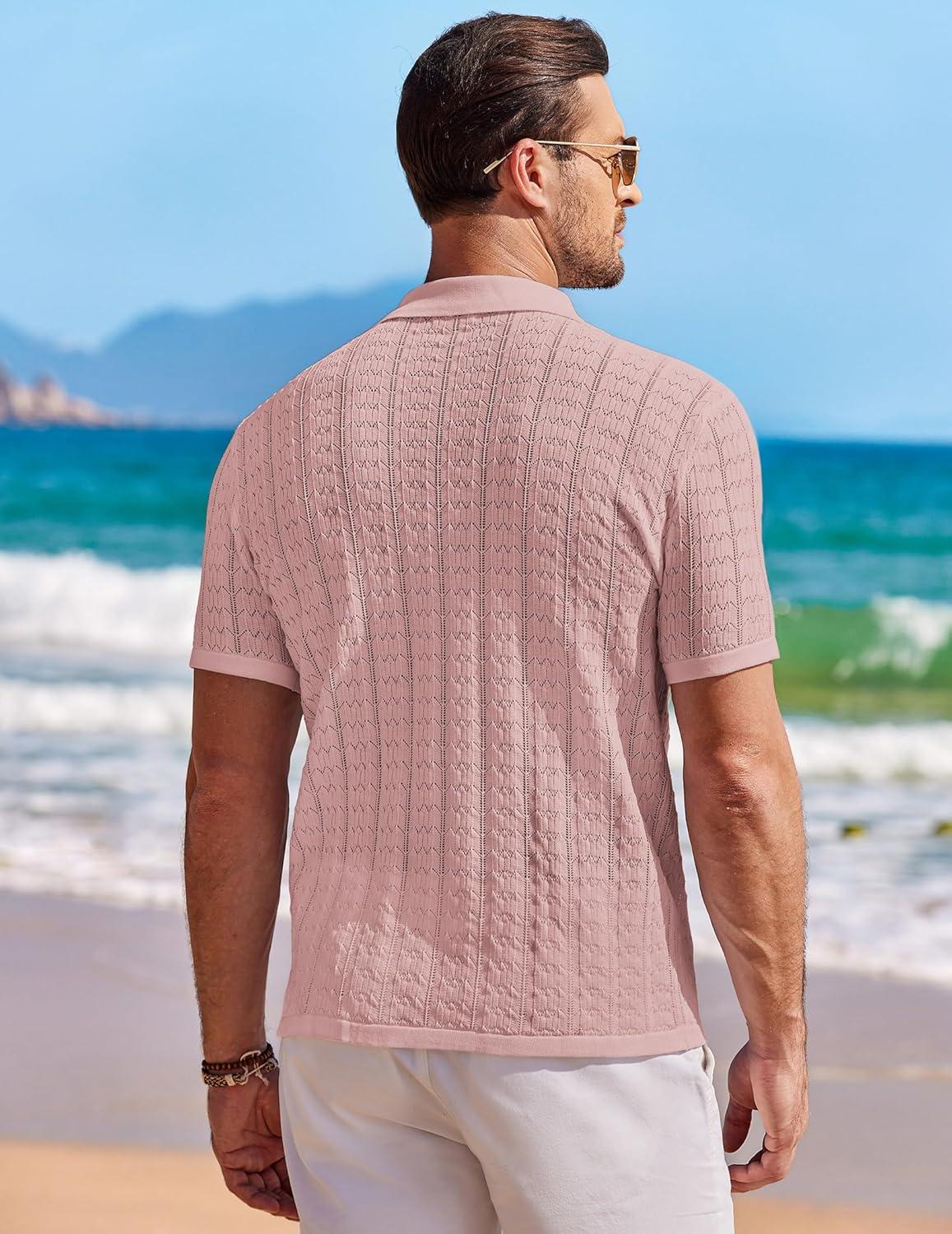 COOFANDY Men's Knit Button Down Shirt Short Sleeve Vintage Polo Shirts Summer Casual Beach Tops(Dusty Pink)
