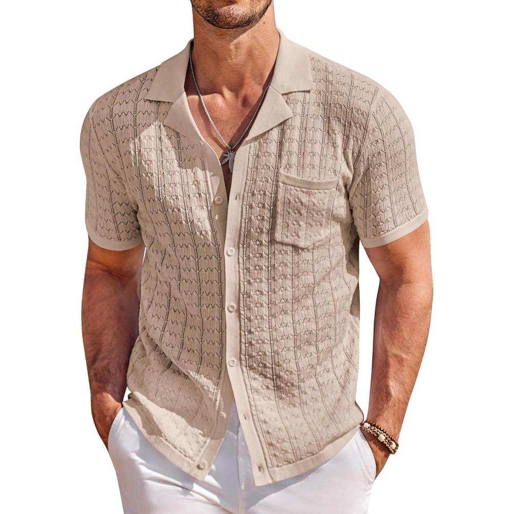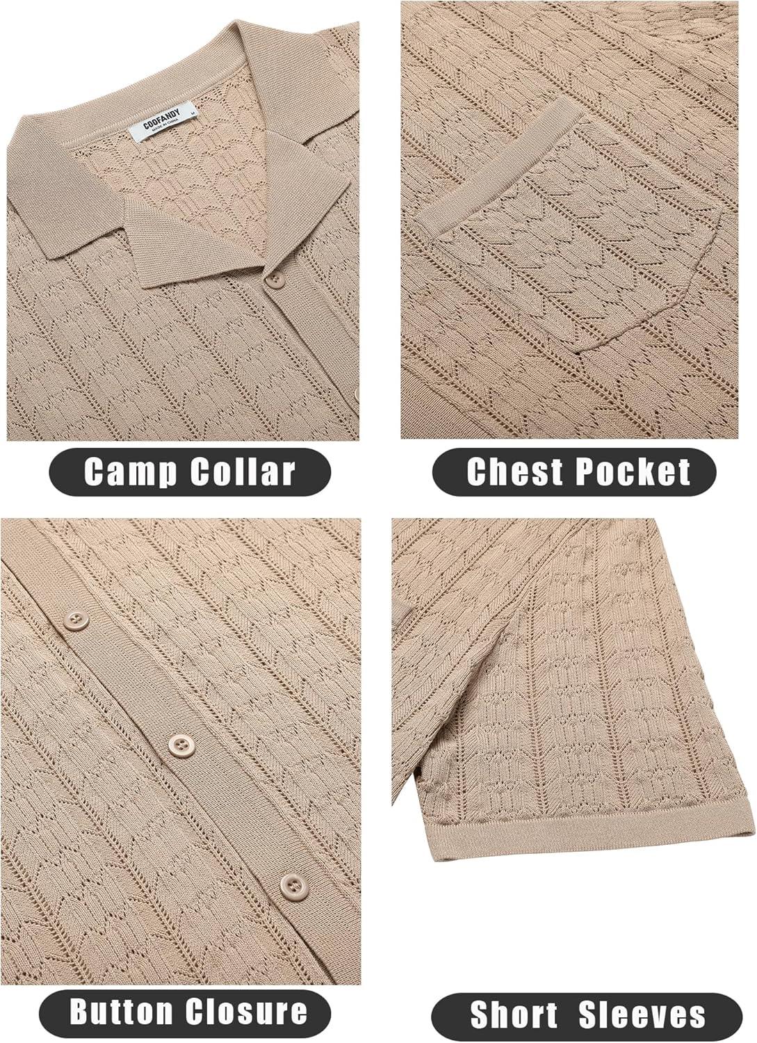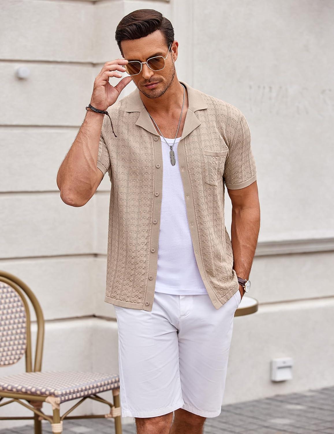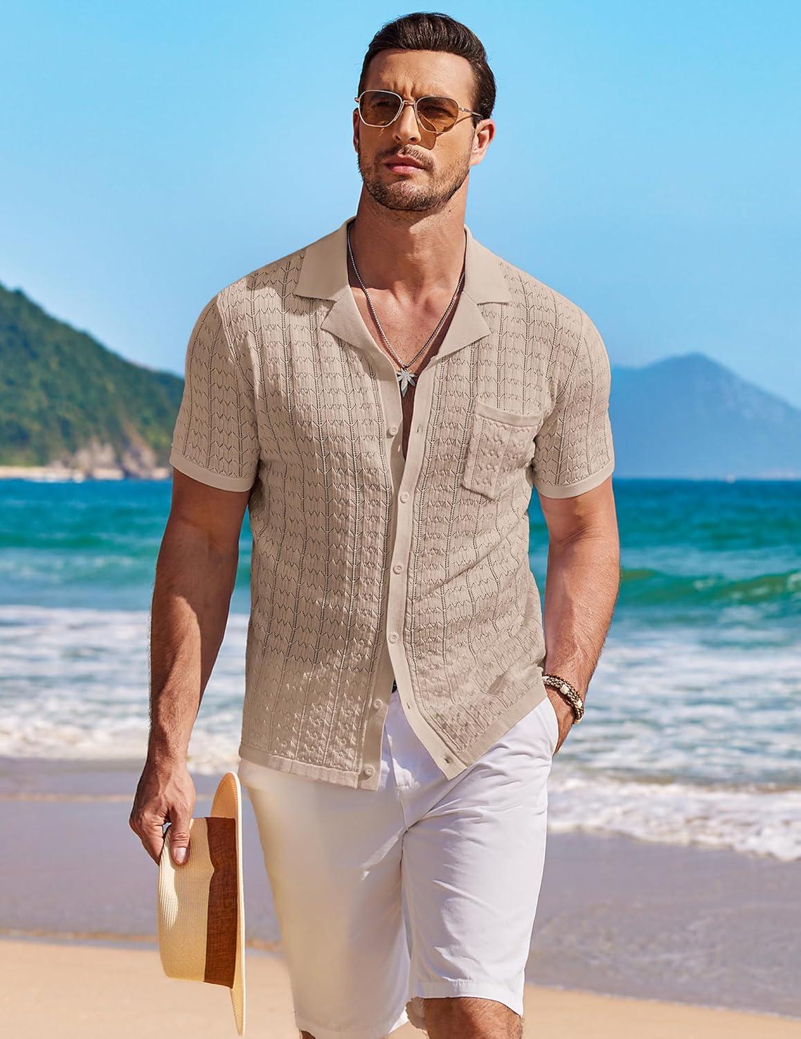 COOFANDY Men's Knit Button Down Shirt Short Sleeve Vintage Polo Shirts Summer Casual Beach Tops(Khaki)
