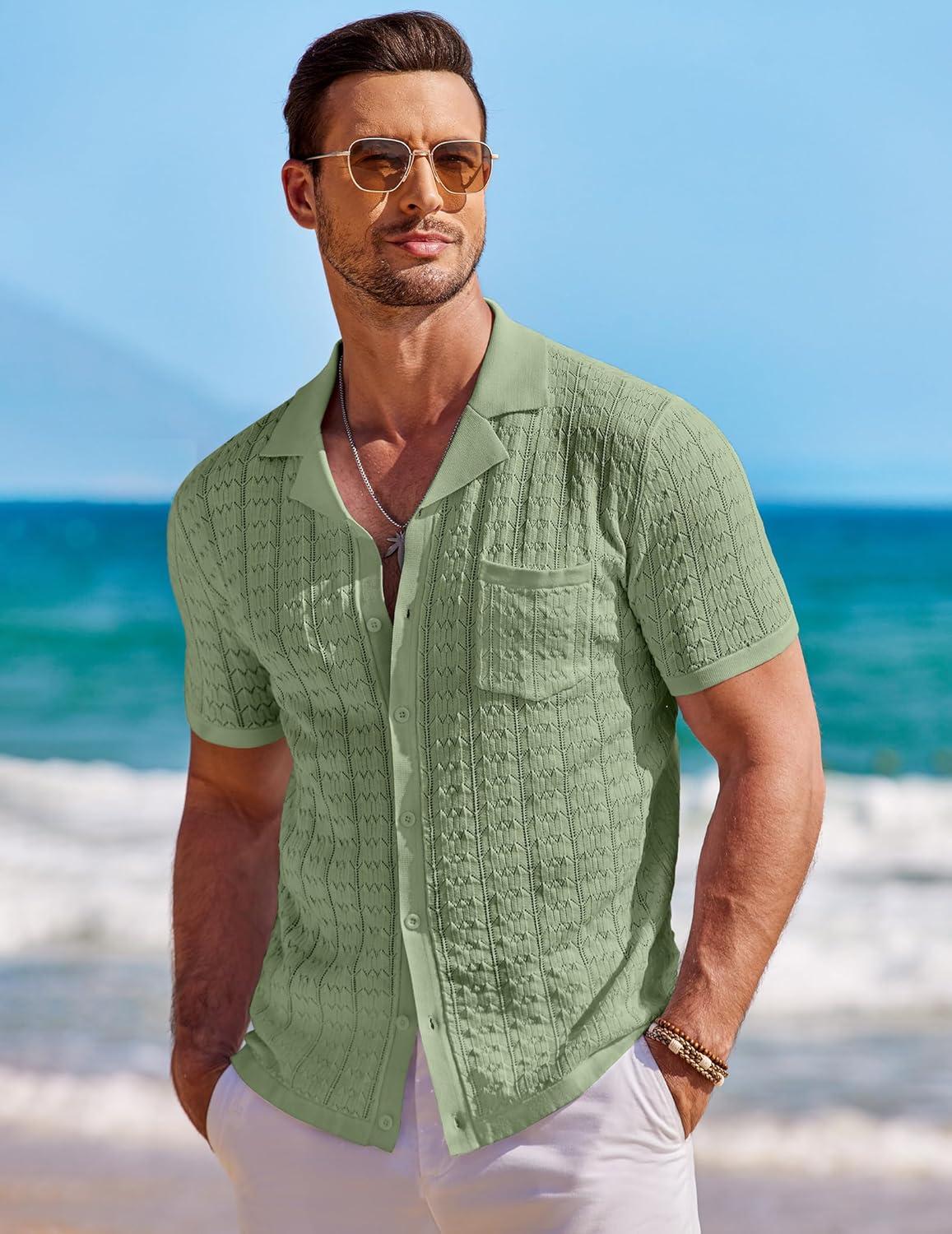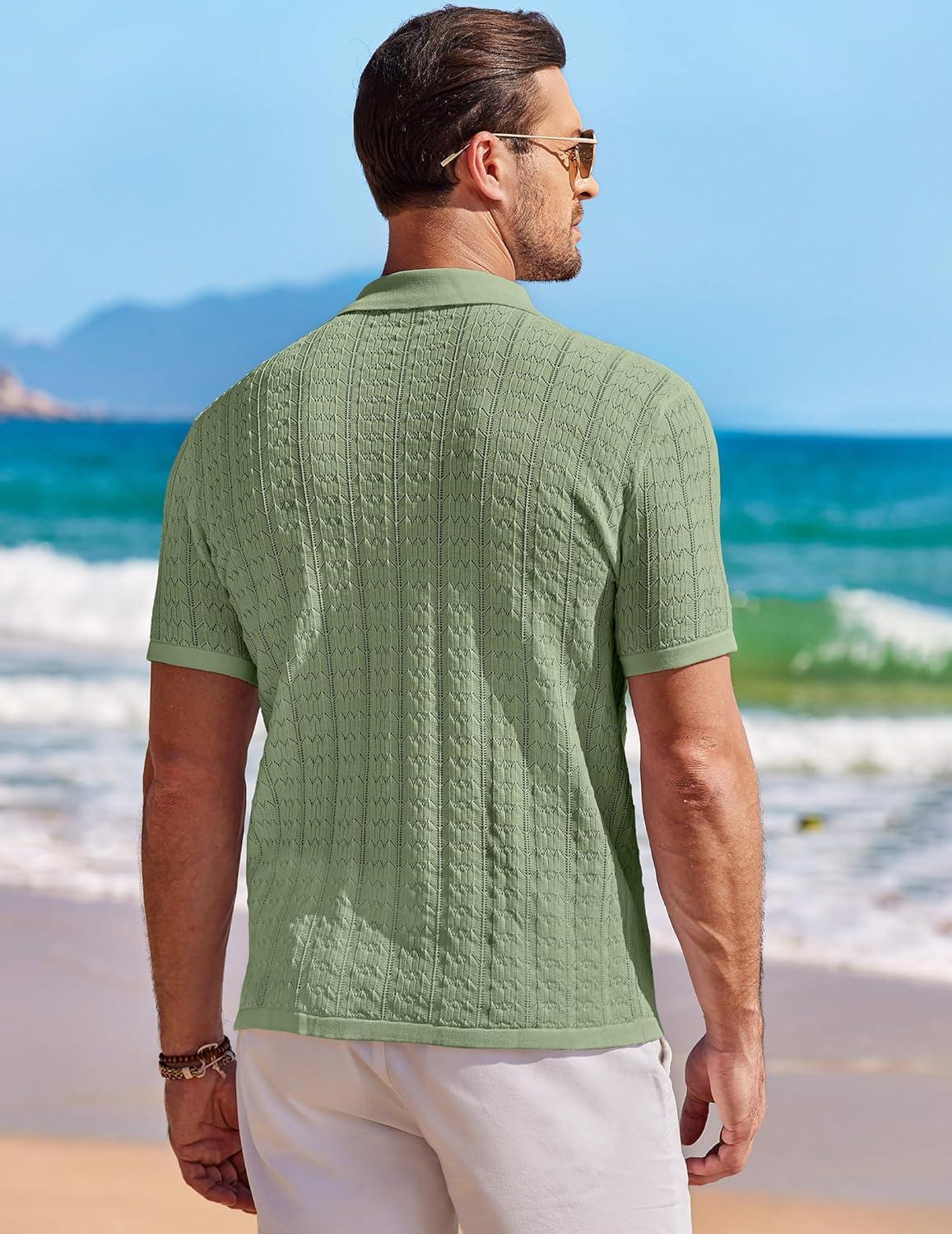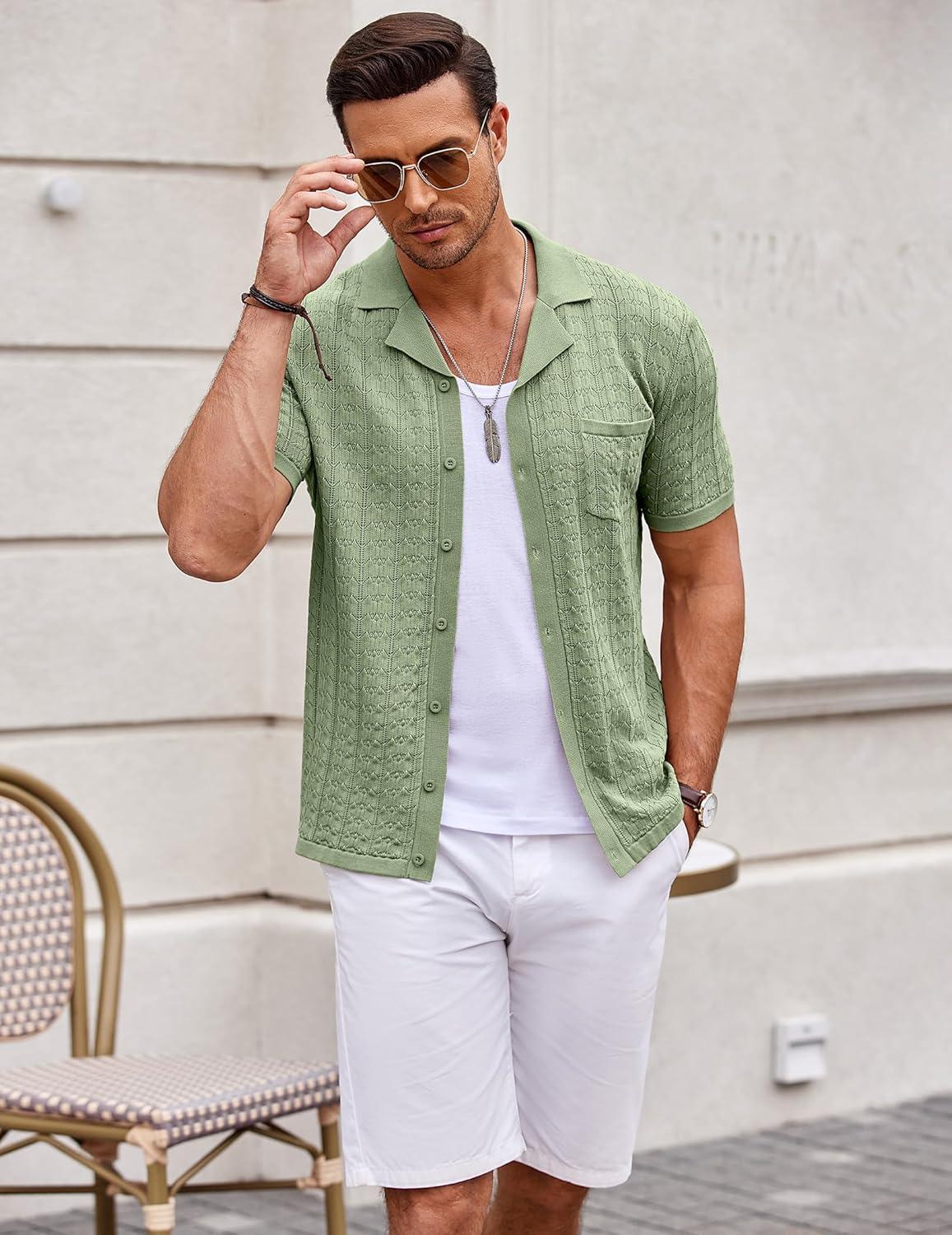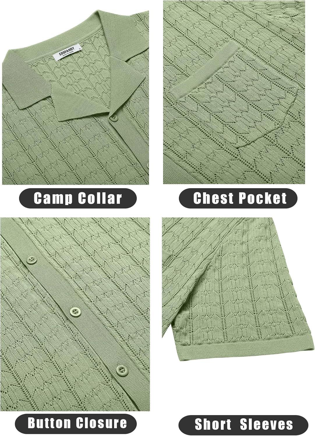 COOFANDY Men's Knit Button Down Shirt Short Sleeve Vintage Polo Shirts Summer Casual Beach Tops(Light Green)