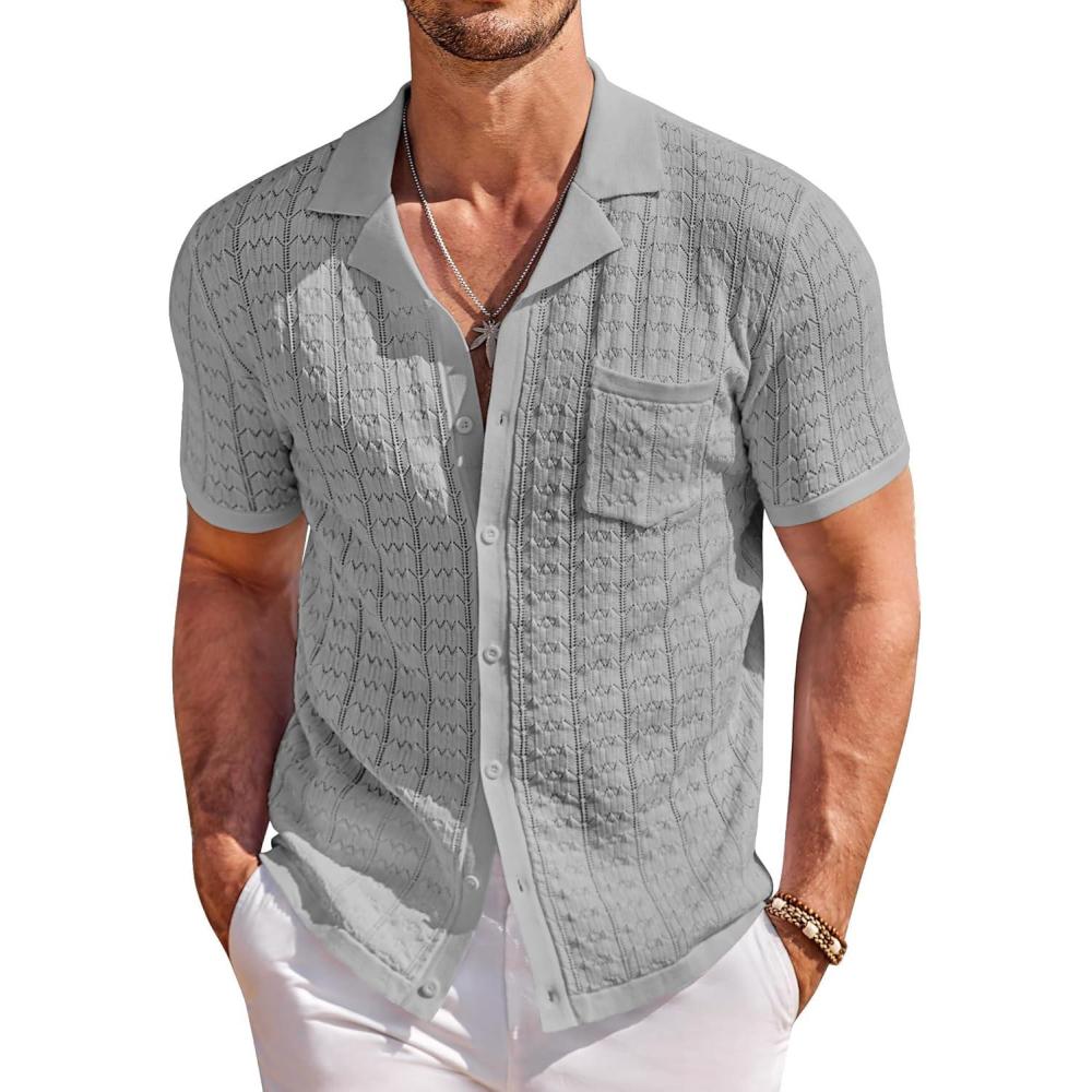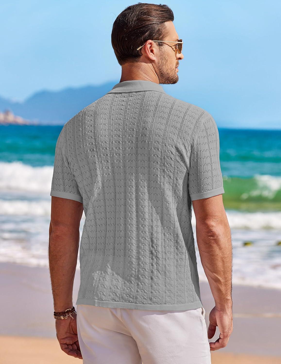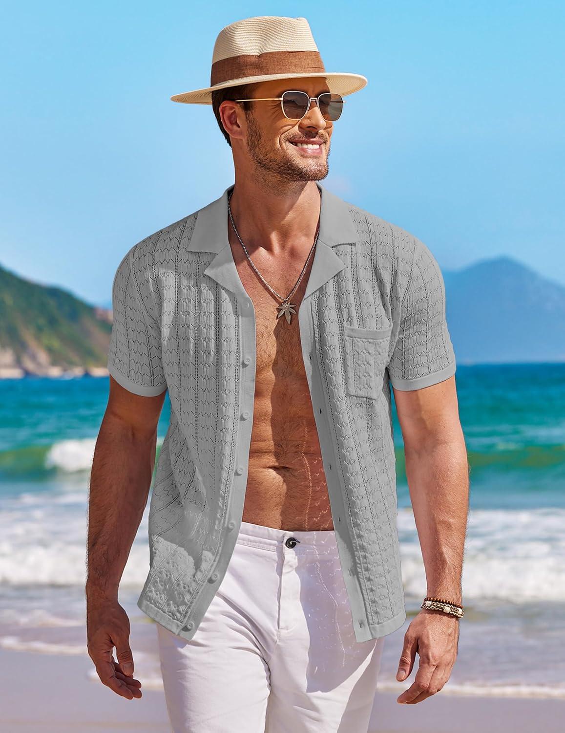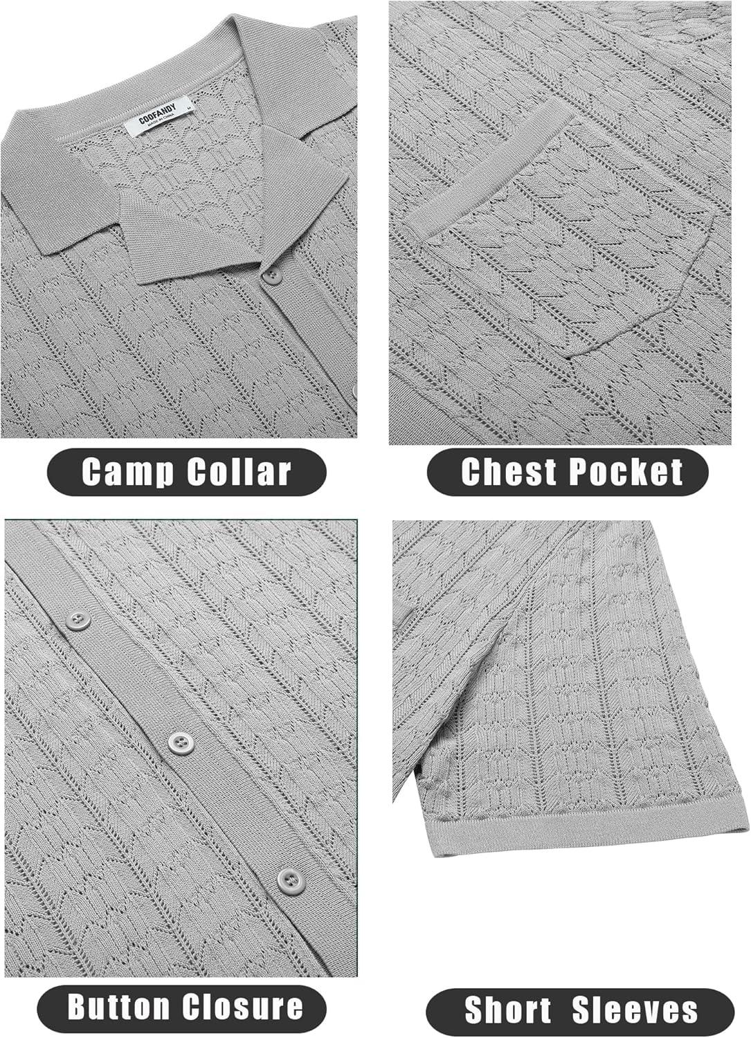 COOFANDY Men's Knit Button Down Shirt Short Sleeve Vintage Polo Shirts Summer Casual Beach Tops(Light Grey)