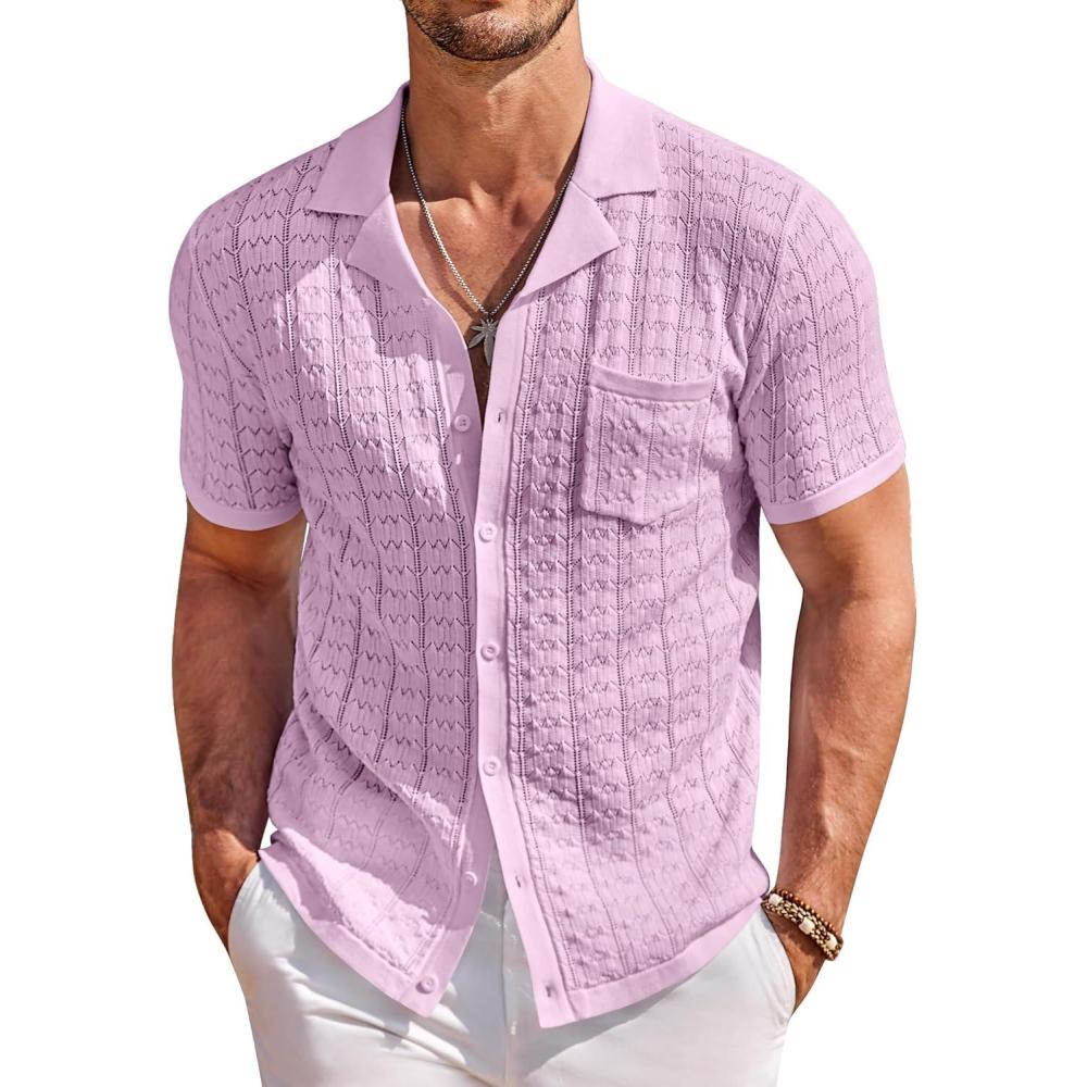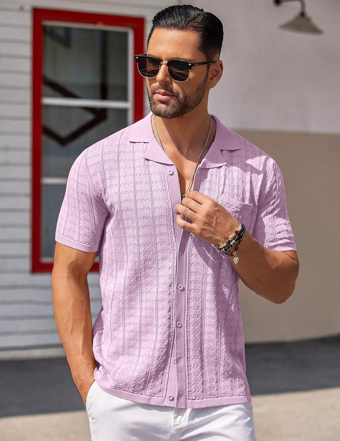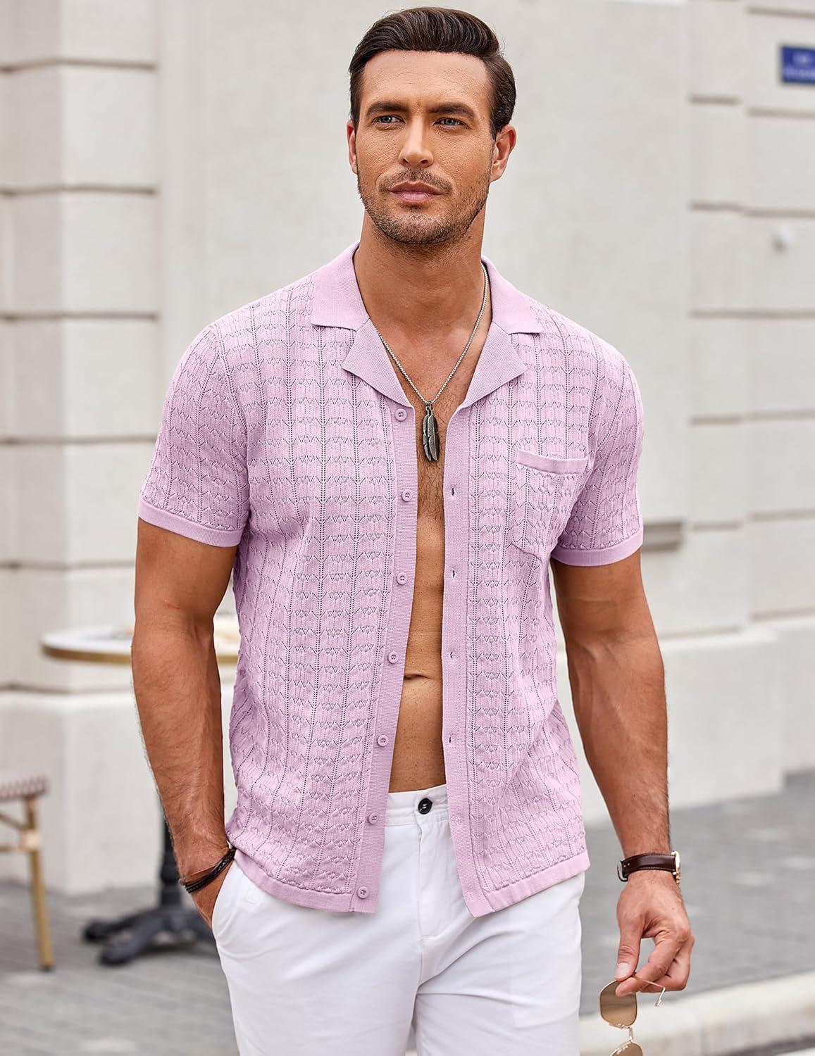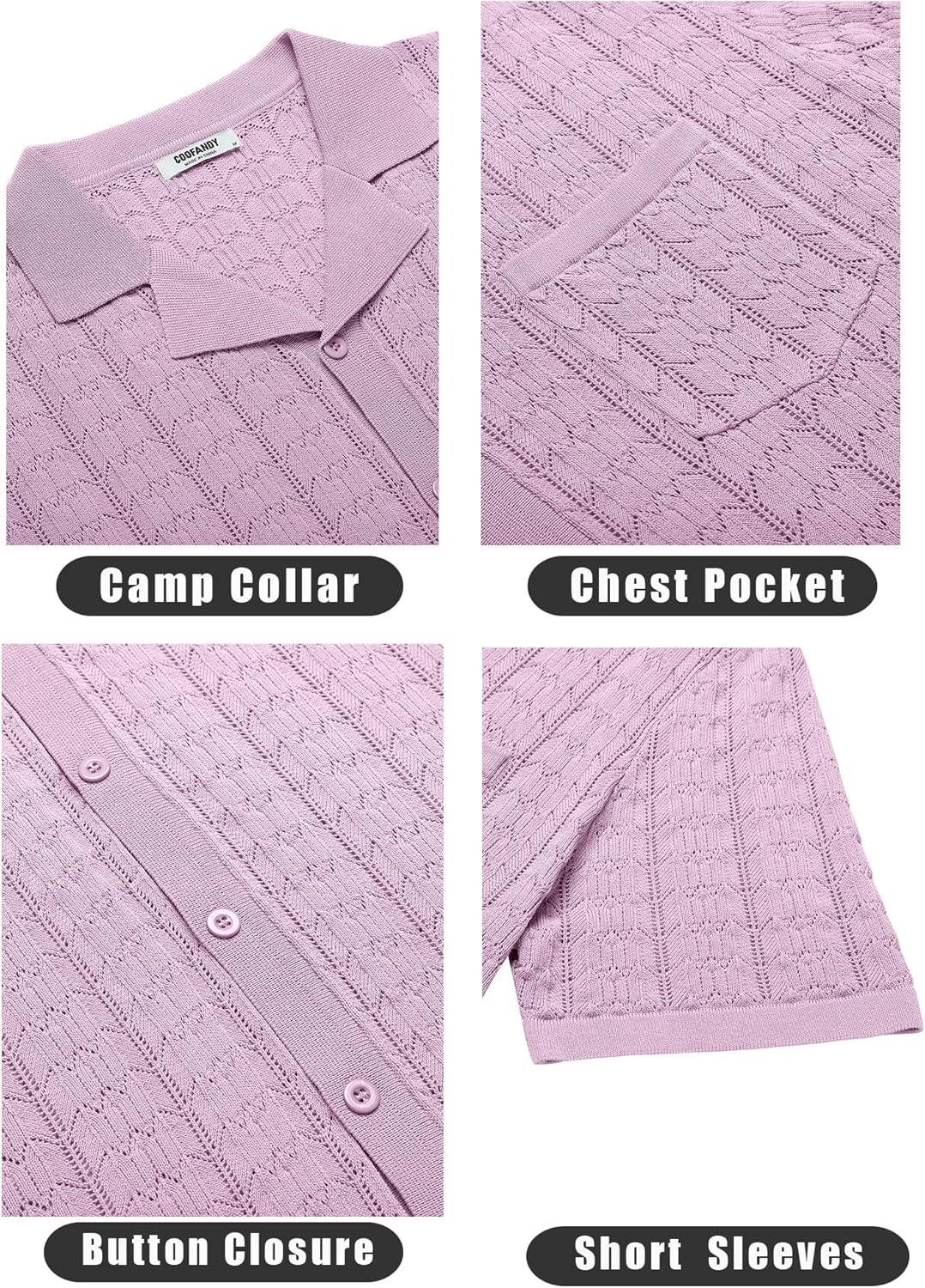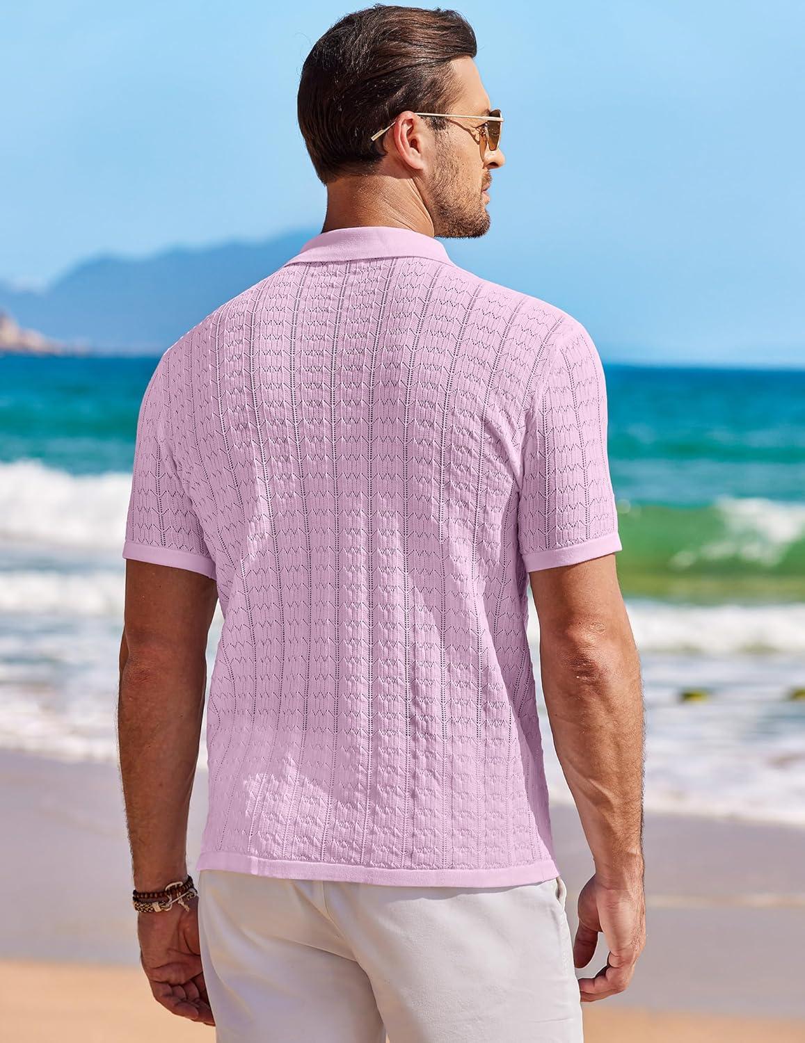 COOFANDY Men's Knit Button Down Shirt Short Sleeve Vintage Polo Shirts Summer Casual Beach Tops(Pink)
