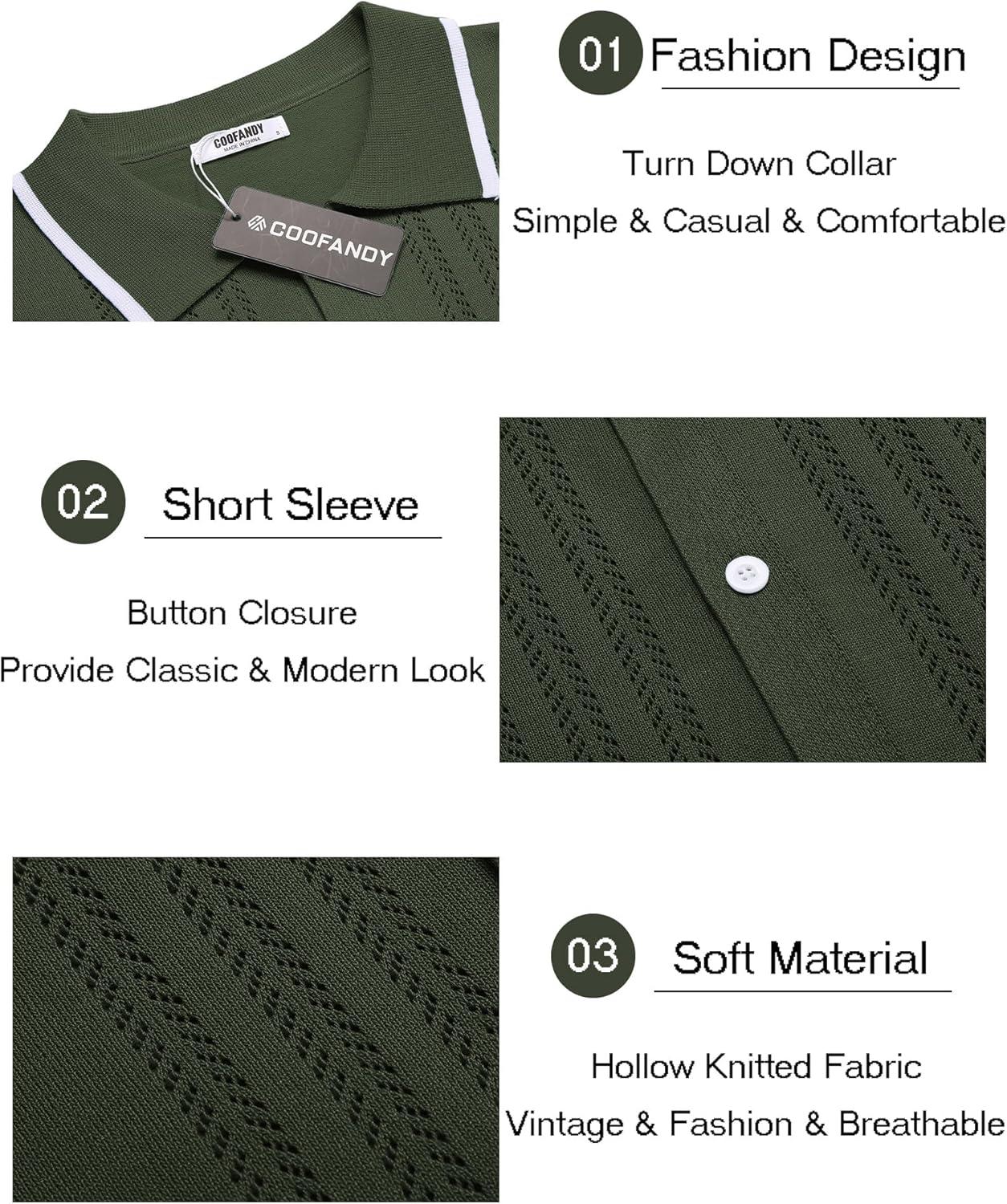 COOFANDY Men's Knit Button Down Shirt Vintage Short Sleeve Polo Shirts Casual Beach Tops(Army Green)