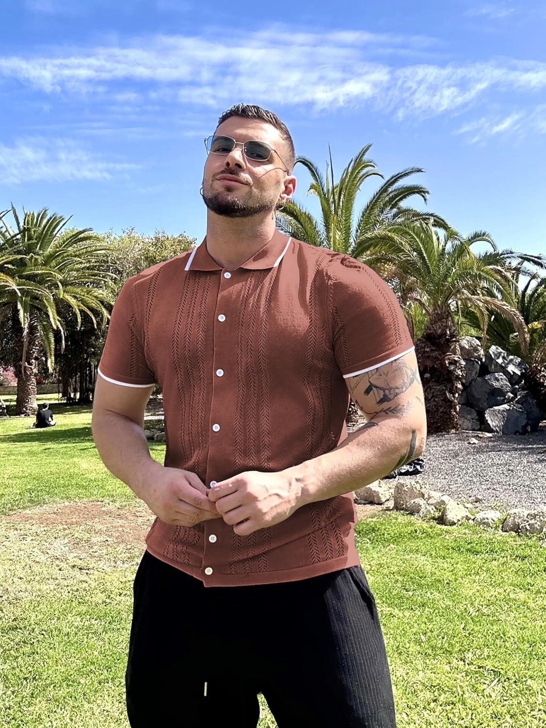 COOFANDY Men’s Knit Button Down Shirt Vintage Short Sleeve Polo Shirts Casual Beach Tops(Dark Brown)