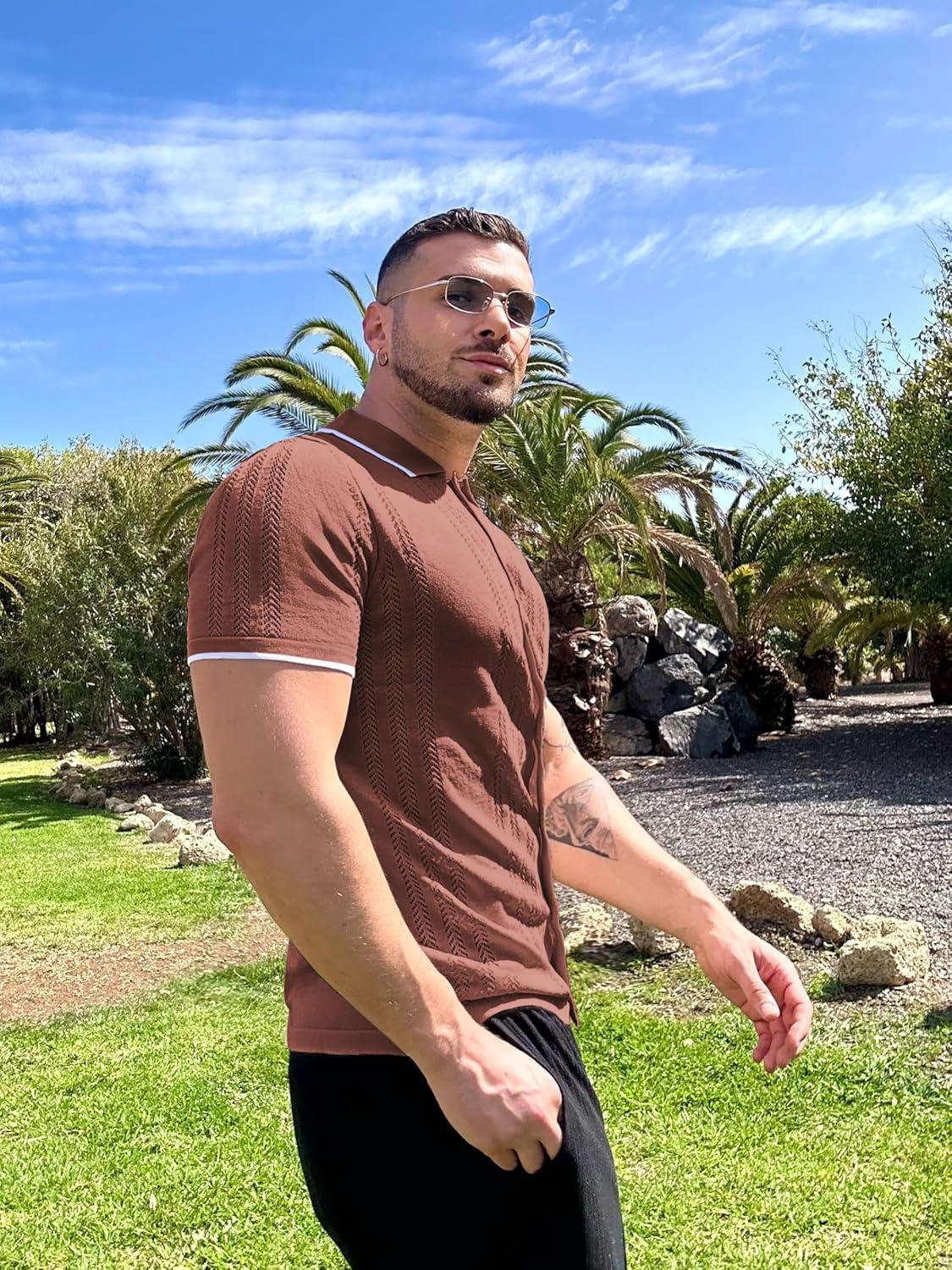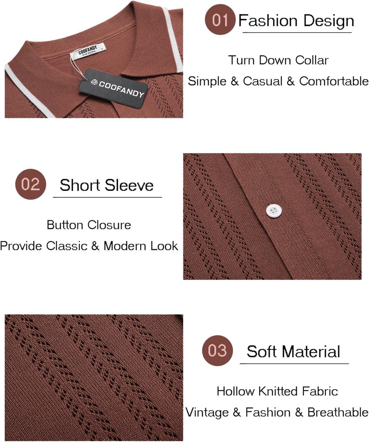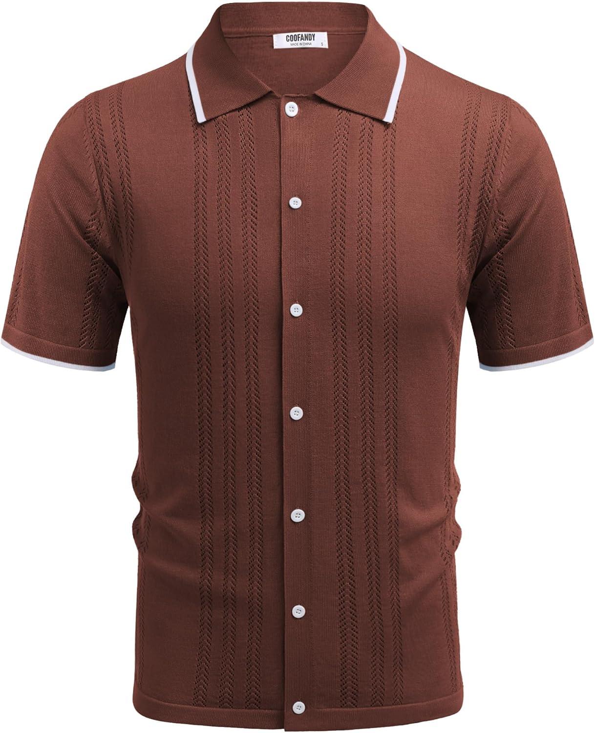 COOFANDY Men's Knit Button Down Shirt Vintage Short Sleeve Polo Shirts Casual Beach Tops(Dark Brown)