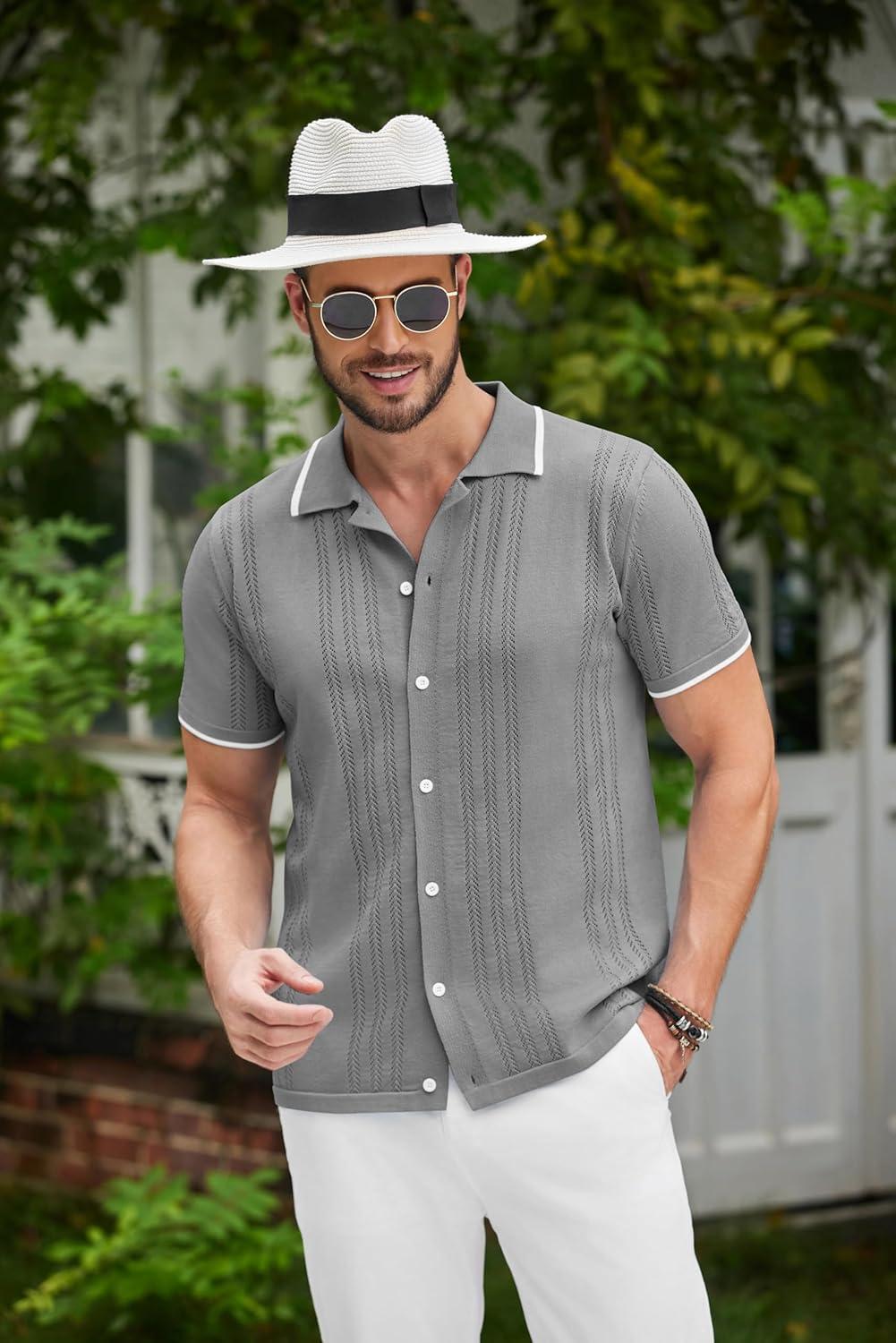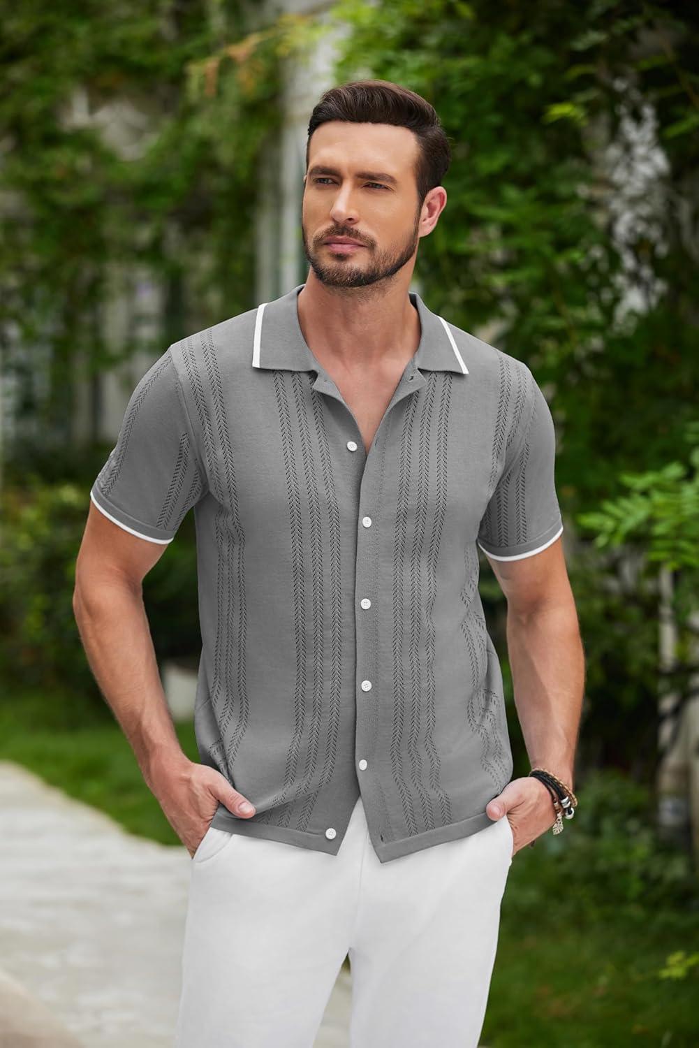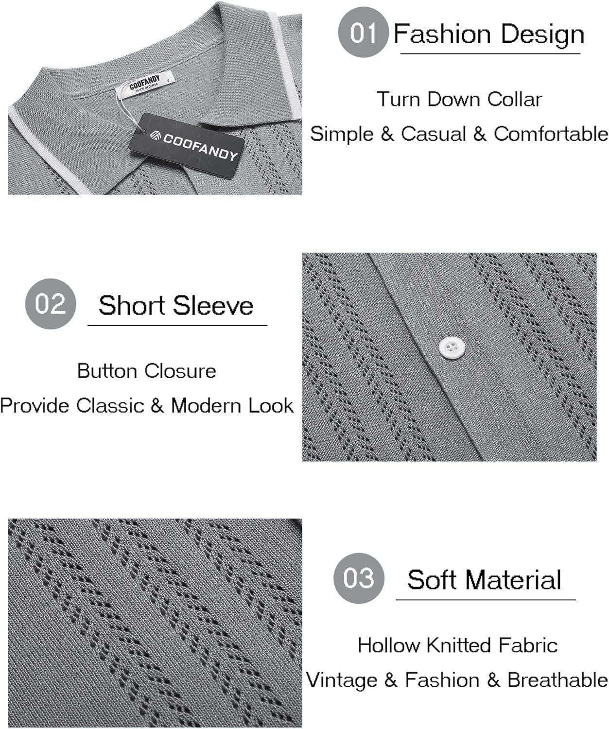 COOFANDY Men's Knit Button Down Shirt Vintage Short Sleeve Polo Shirts Casual Beach Tops(Dark Grey)