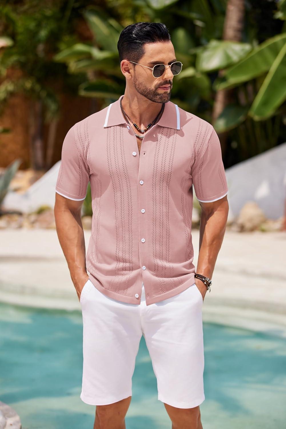 COOFANDY Men's Knit Button Down Shirt Vintage Short Sleeve Polo Shirts Casual Beach Tops(Light Pink)