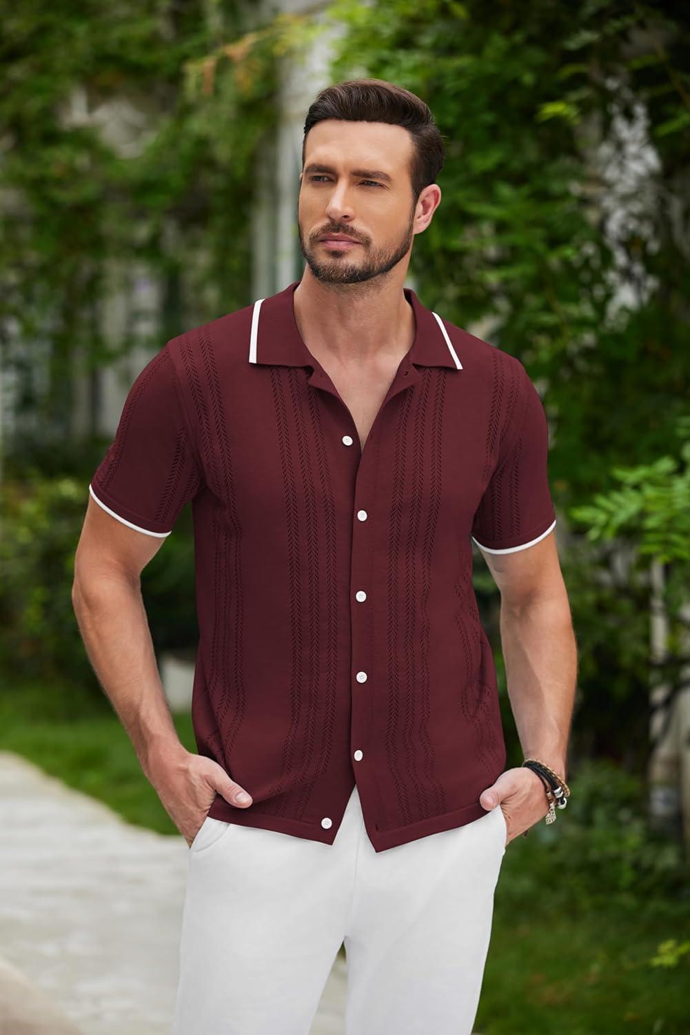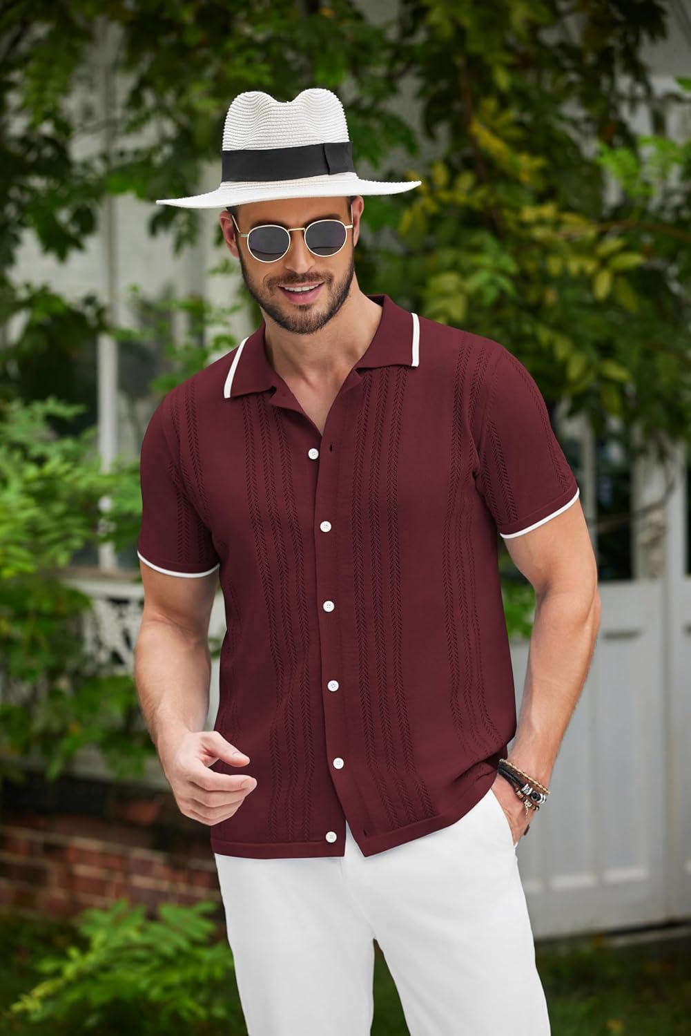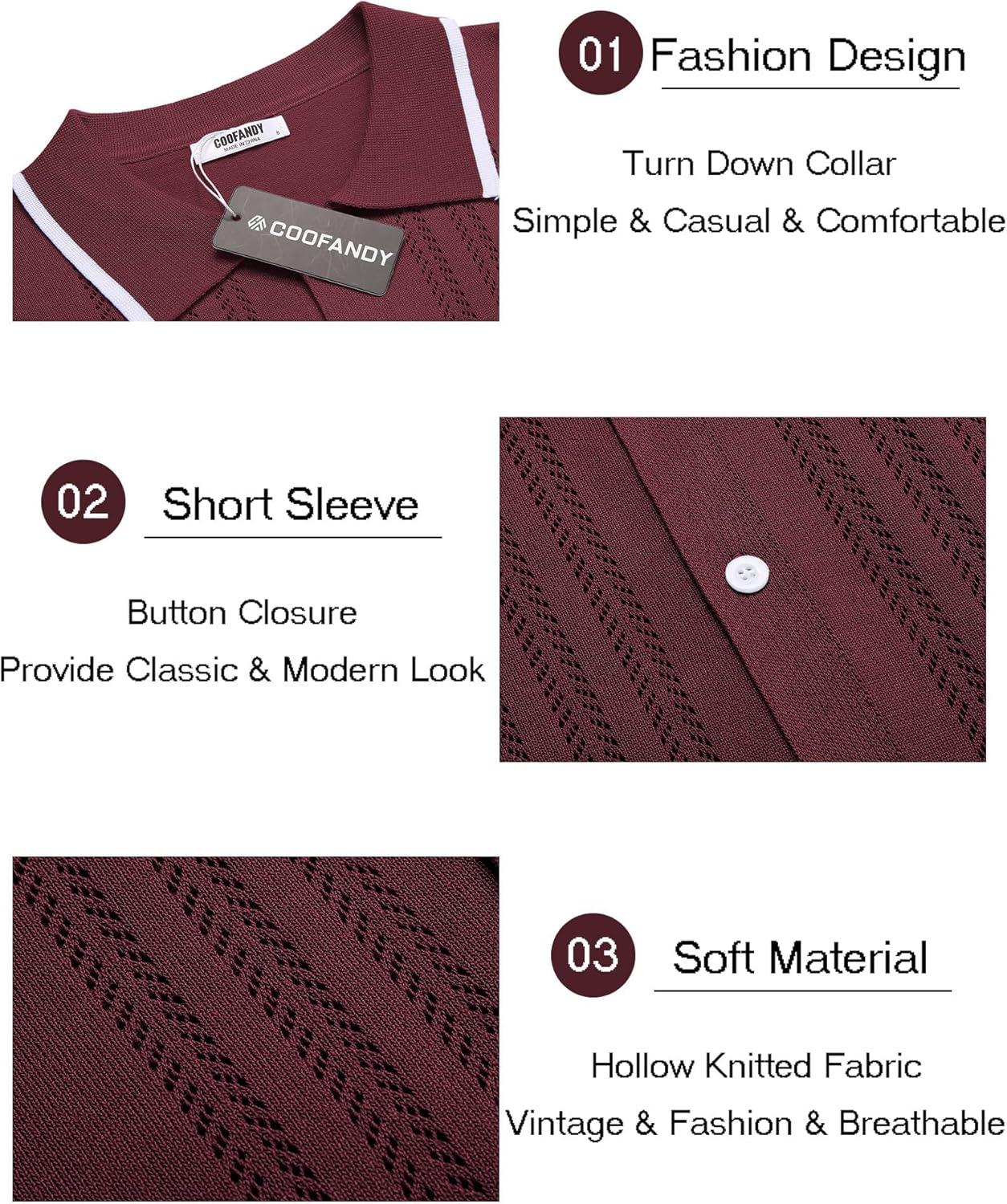 COOFANDY Men's Knit Button Down Shirt Vintage Short Sleeve Polo Shirts Casual Beach Tops(Wine Red)