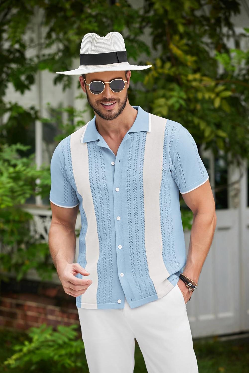 COOFANDY Men's Knit Button Down Shirt Vintage Short Sleeve Polo Shirts Casual Beach Tops(Z Stripe - Blue White)