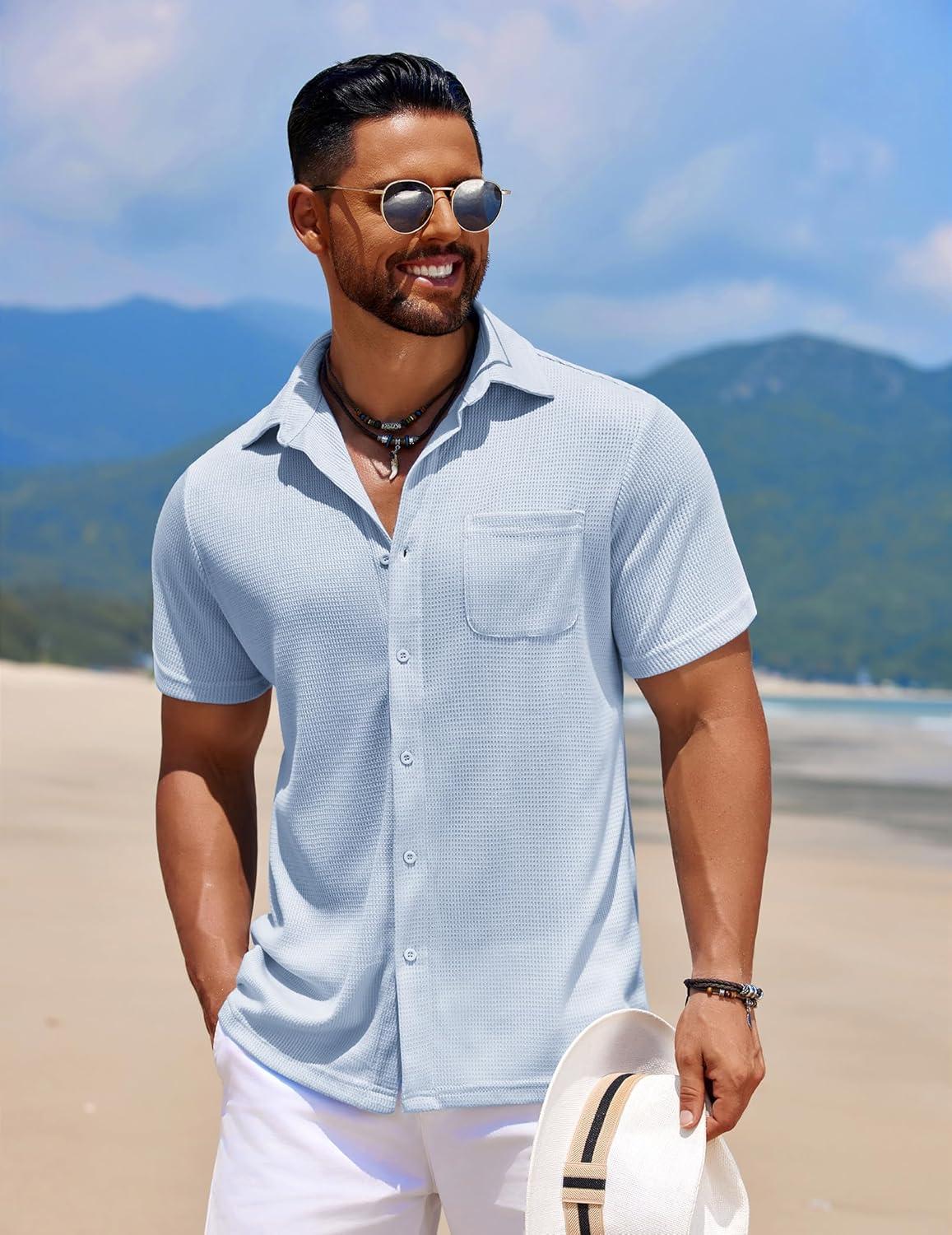 COOFANDY Men’s Knit Button Down Shirts Casual Short Sleeve Polo Shirt Summer Beach Shirts with Pocket(Angel Falls)