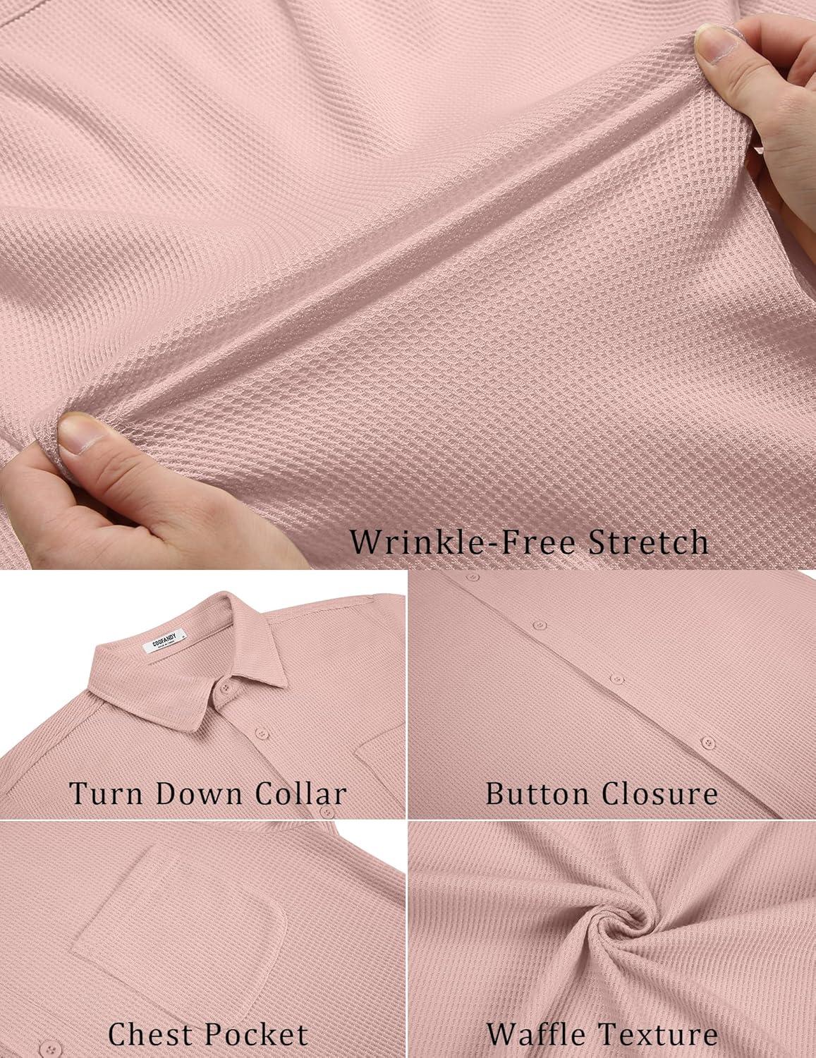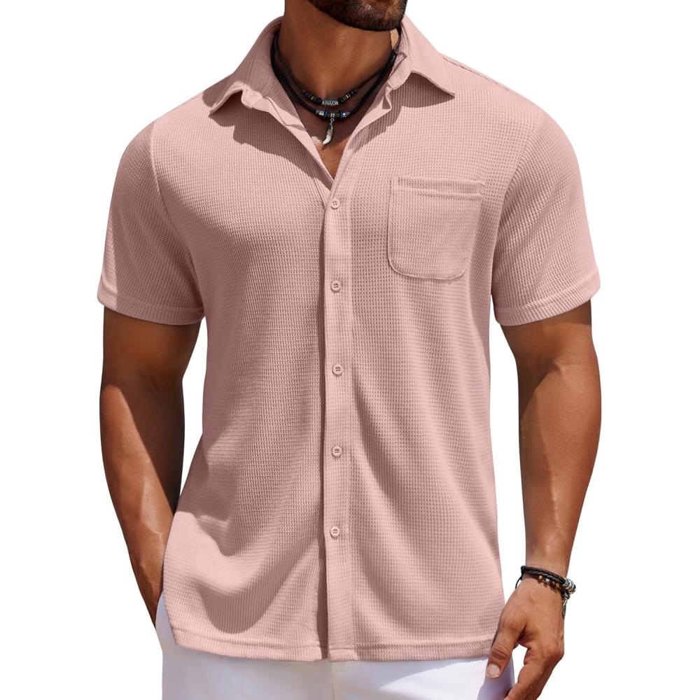 COOFANDY Men's Knit Button Down Shirts Casual Short Sleeve Polo Shirt Summer Beach Shirts with Pocket(Misty Rose)