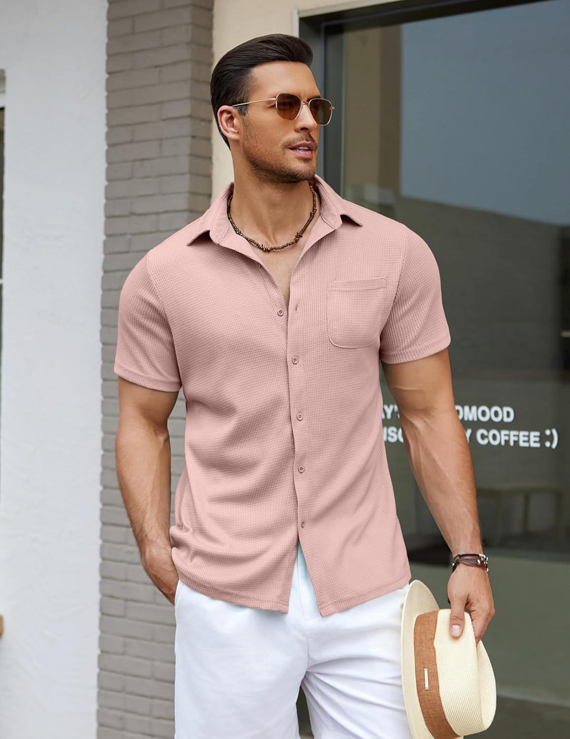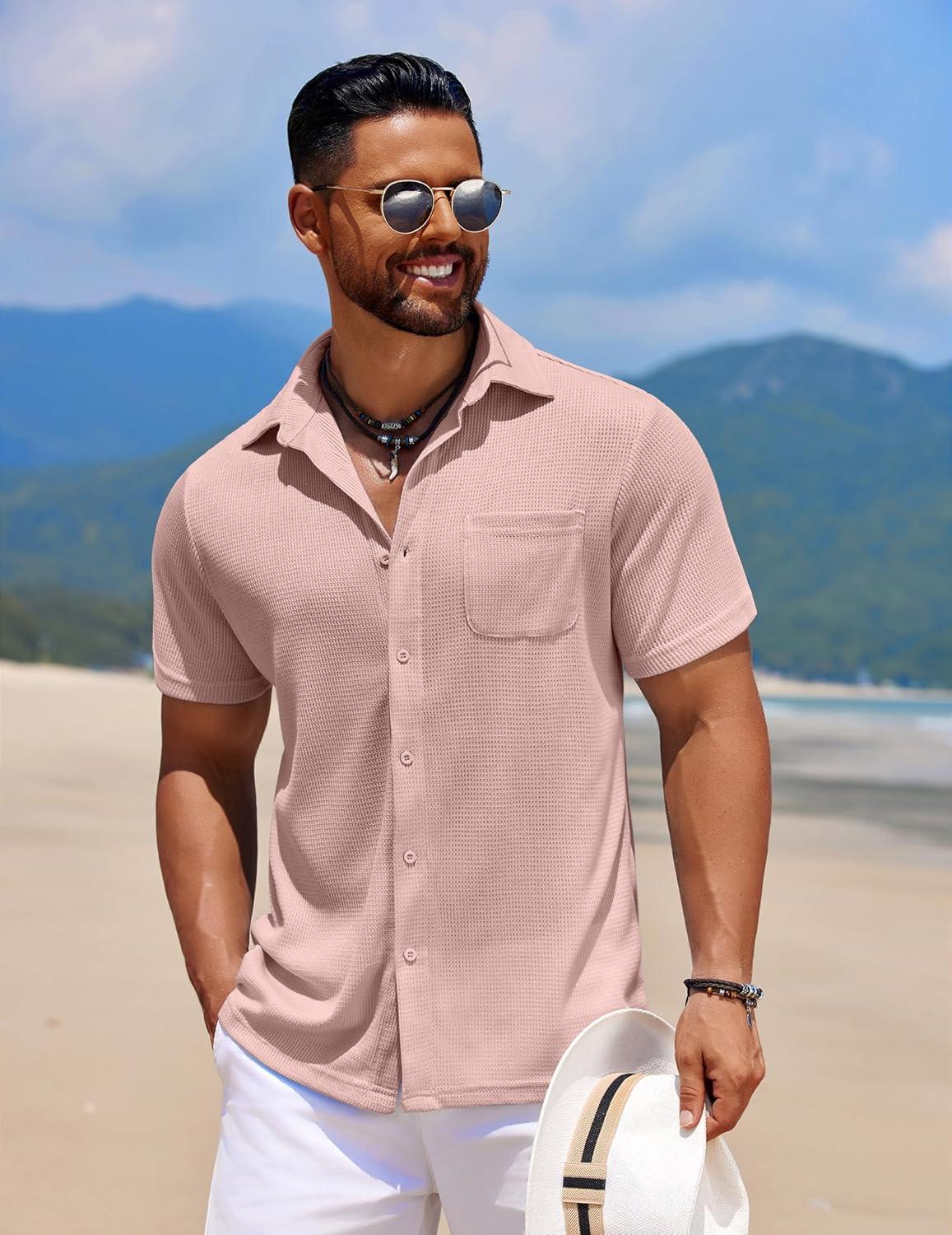 COOFANDY Men’s Knit Button Down Shirts Casual Short Sleeve Polo Shirt Summer Beach Shirts with Pocket(Misty Rose)