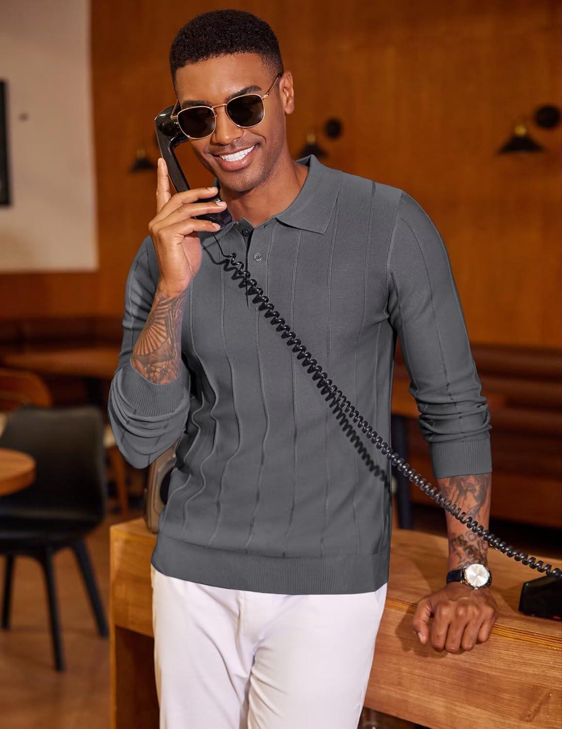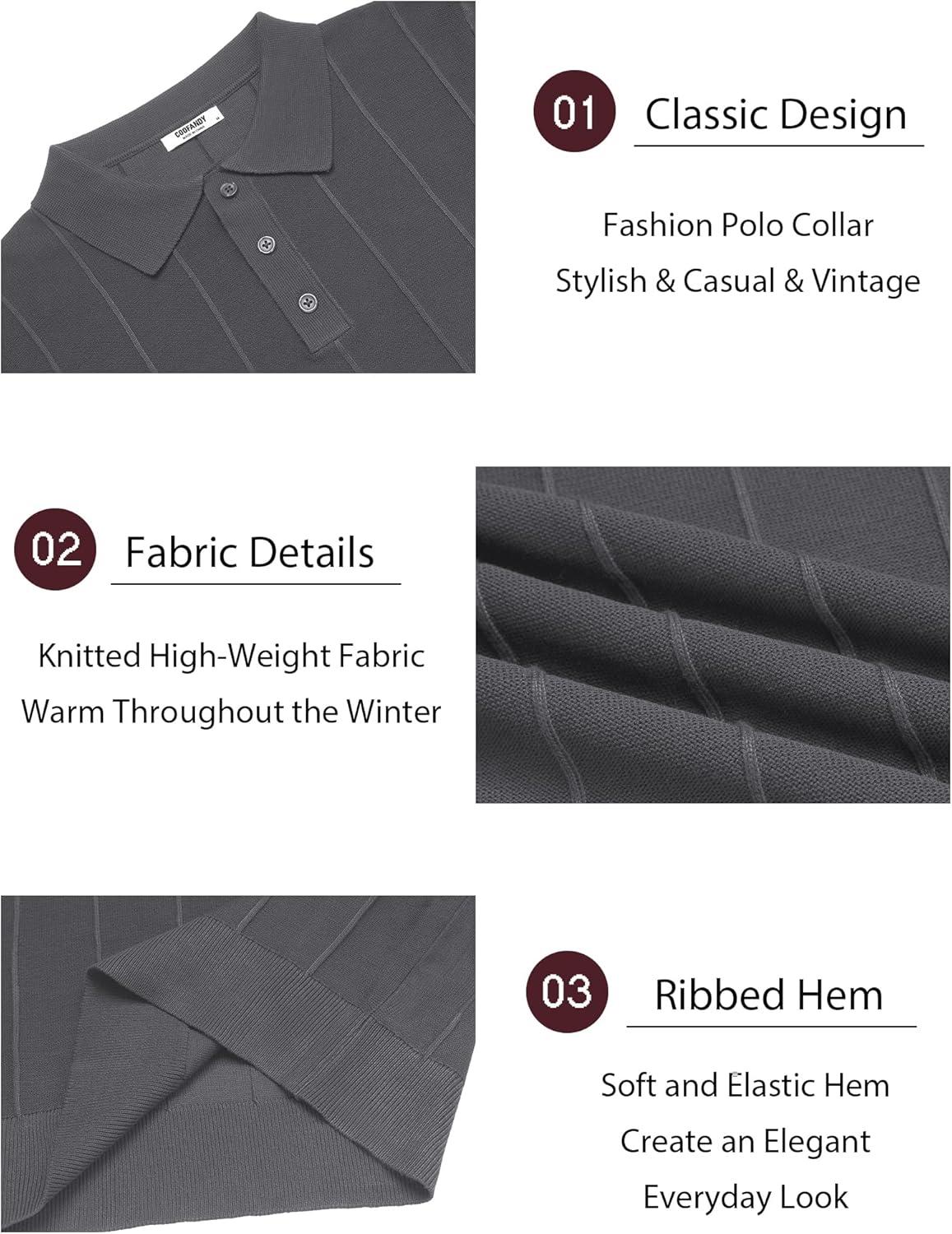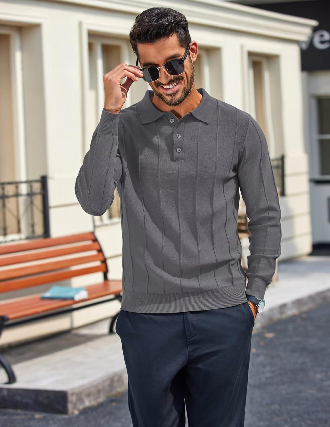 COOFANDY Mens Knit Long Sleeve Polo Sweater Business Casual Collared Golf Sweaters Ribbed Textured Activewear Polos(Dark Gray)