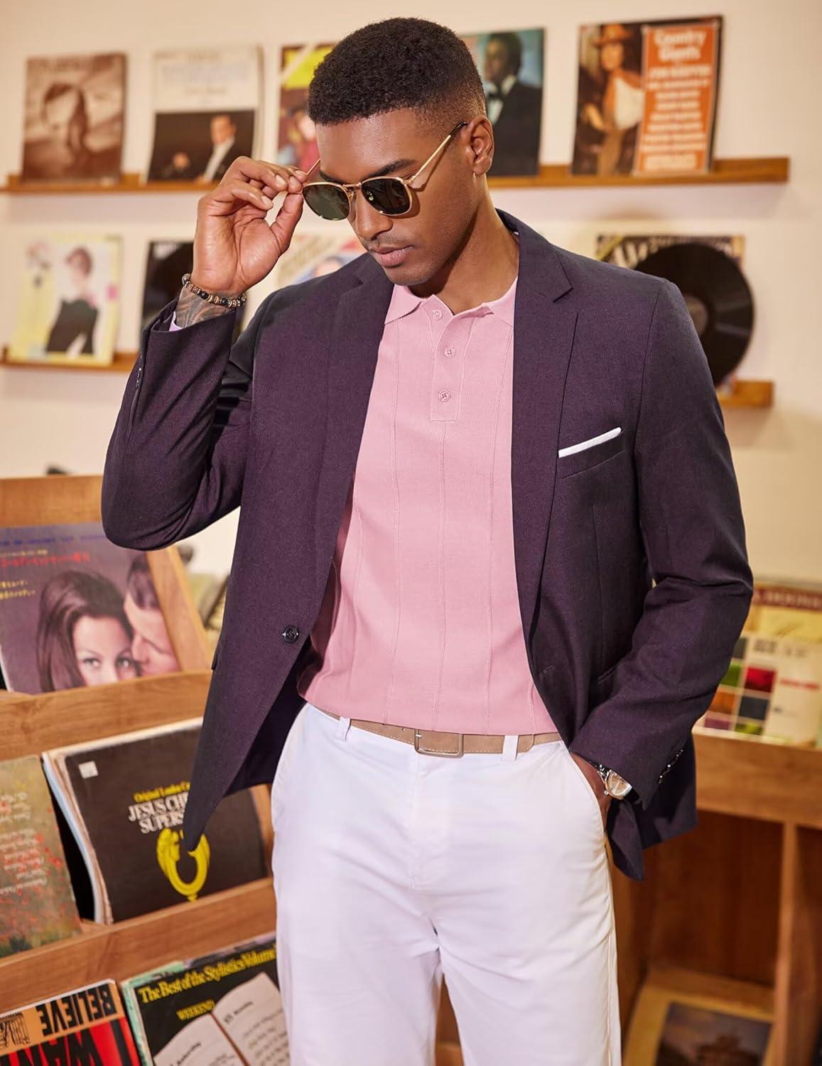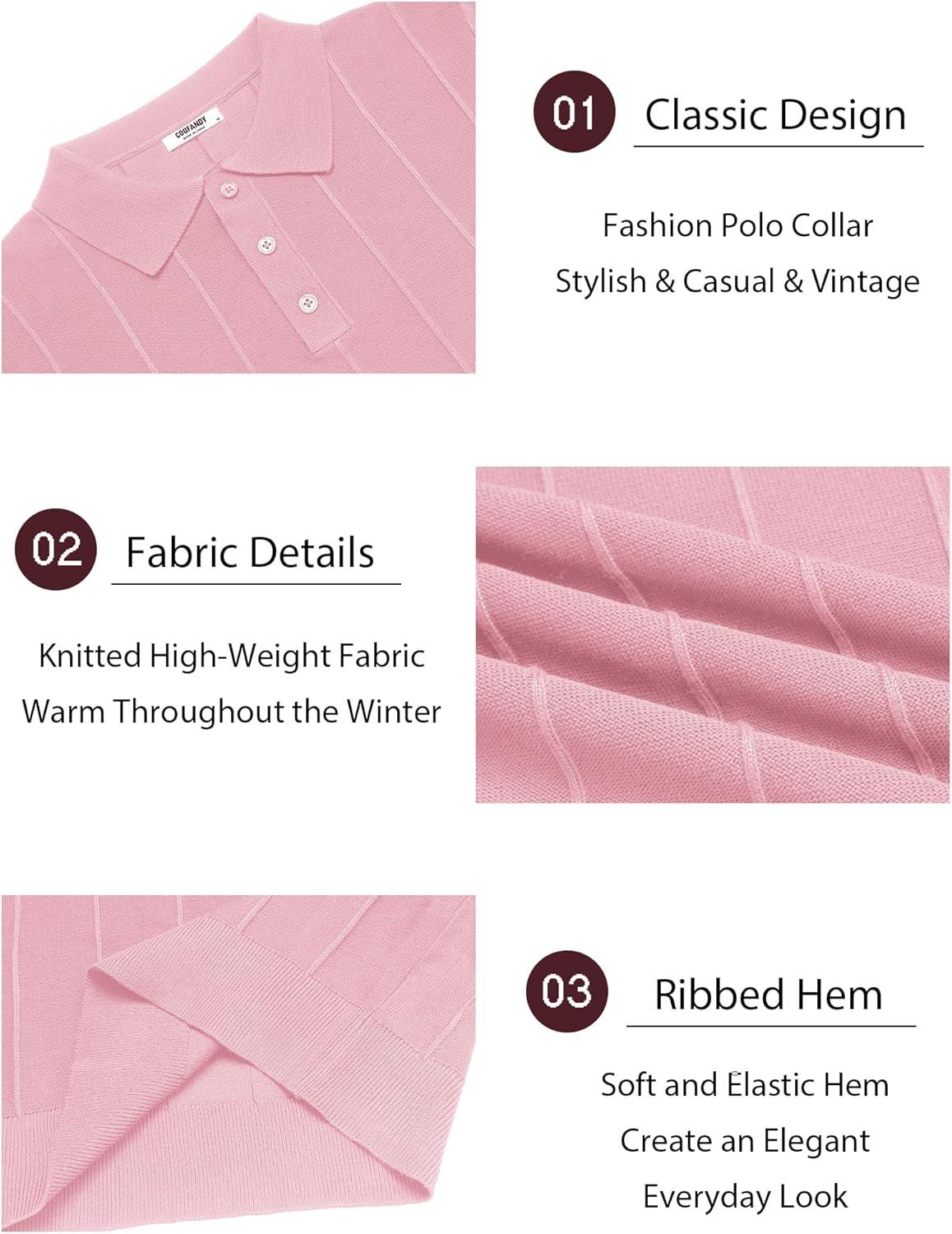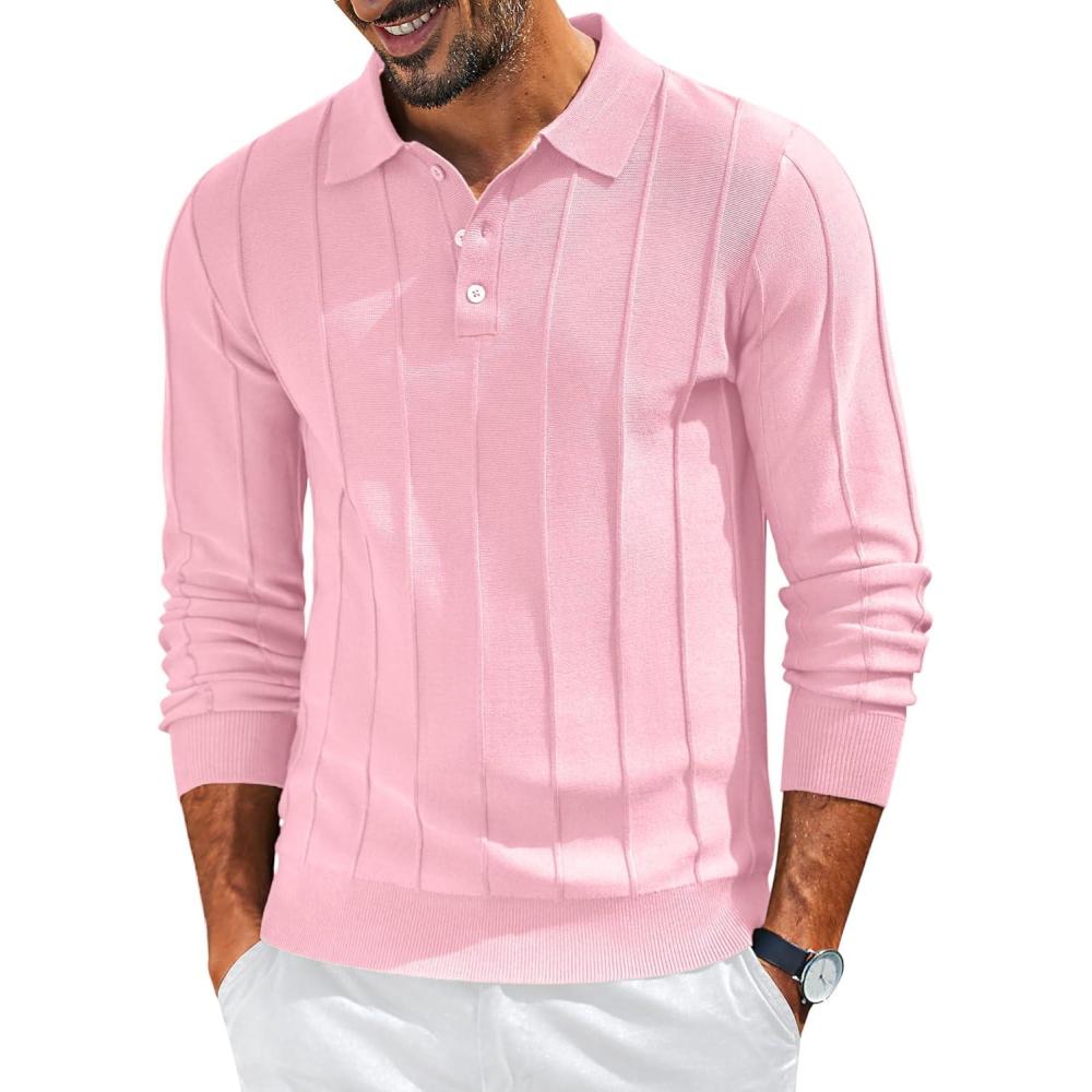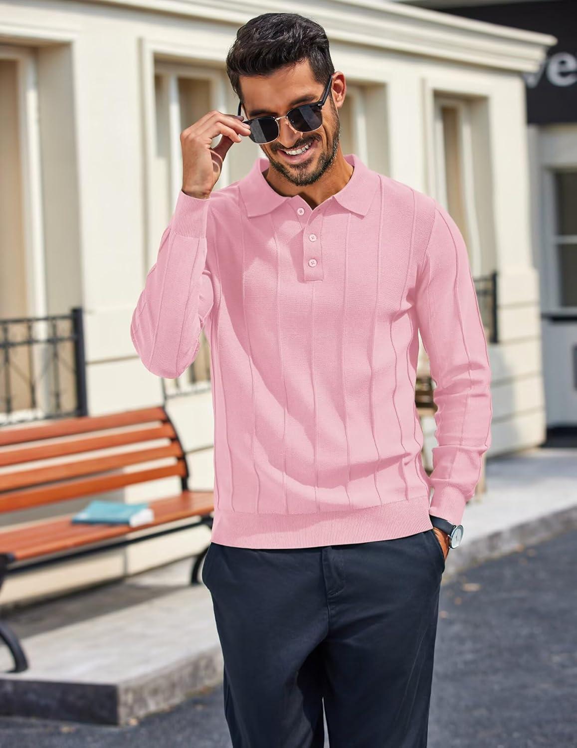 COOFANDY Mens Knit Long Sleeve Polo Sweater Business Casual Collared Golf Sweaters Ribbed Textured Activewear Polos(Pink)