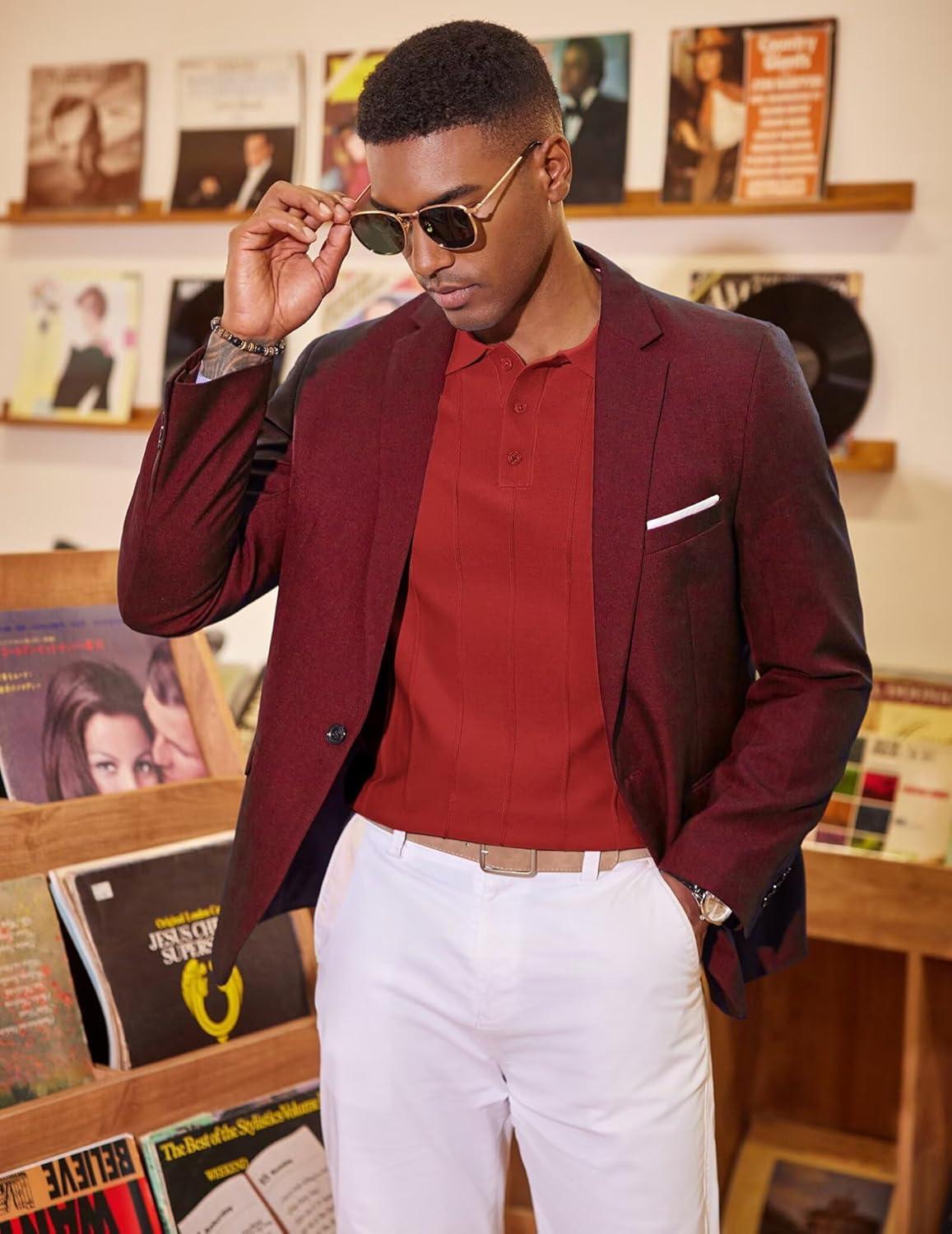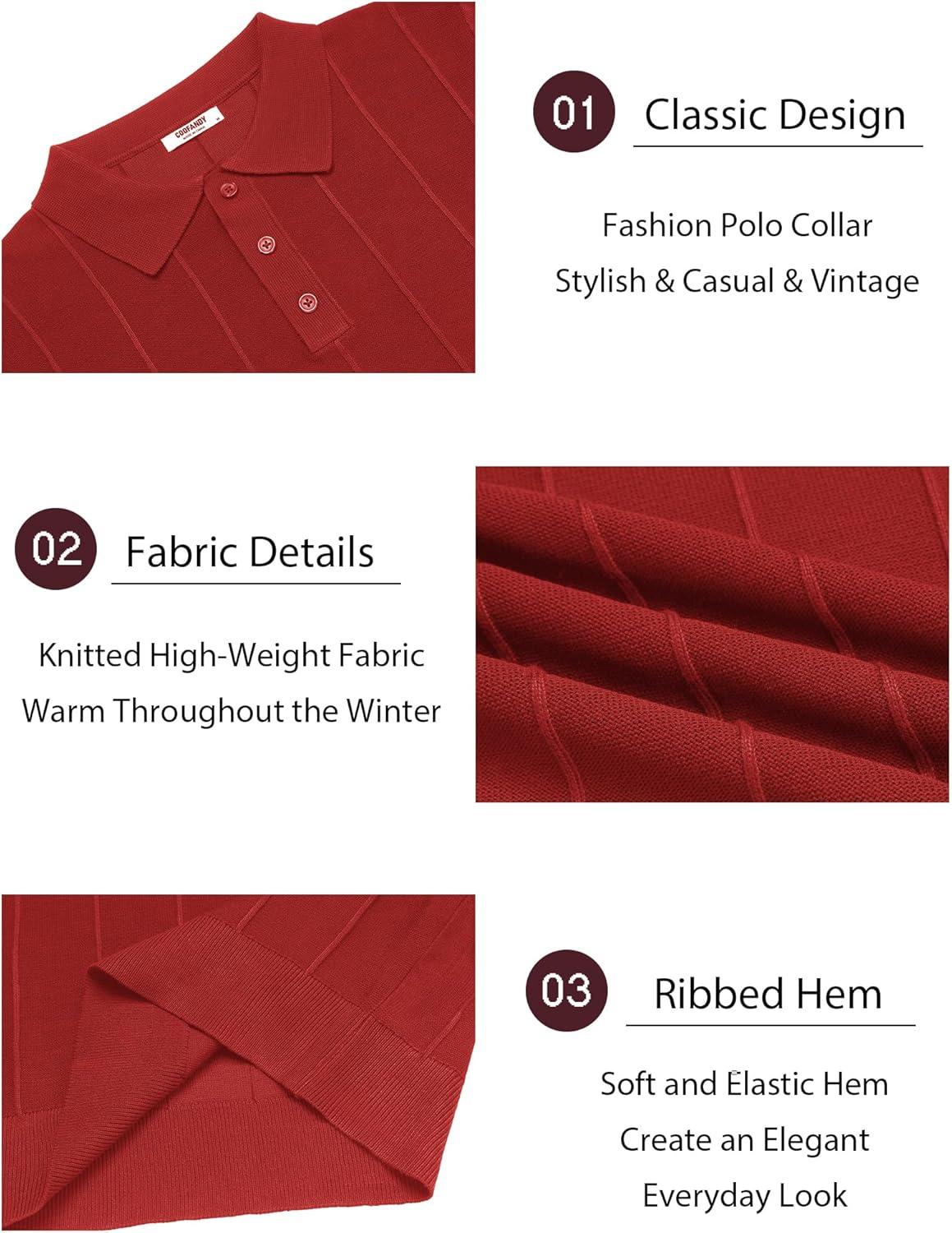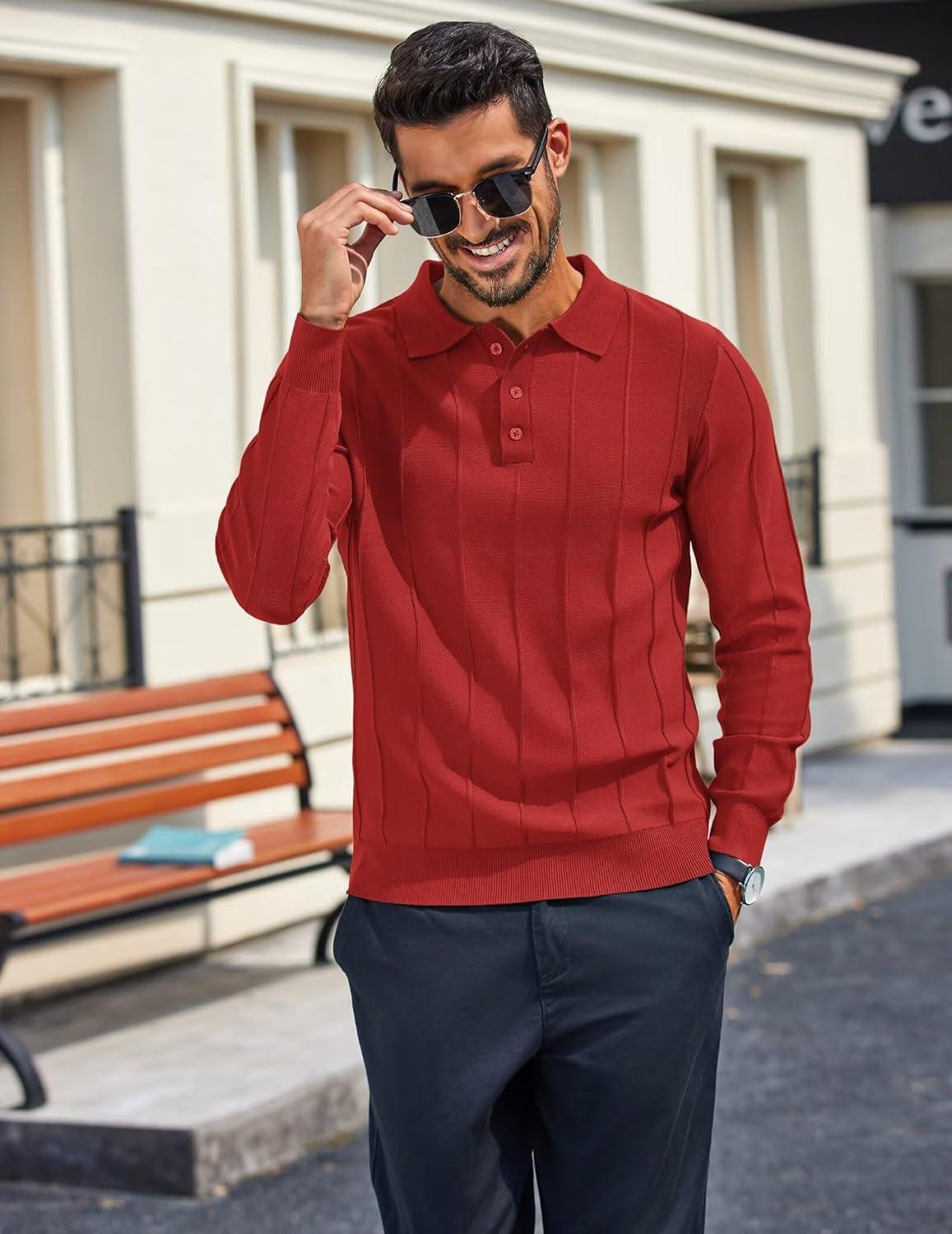 COOFANDY Mens Knit Long Sleeve Polo Sweater Business Casual Collared Golf Sweaters Ribbed Textured Activewear Polos(Wine Red)