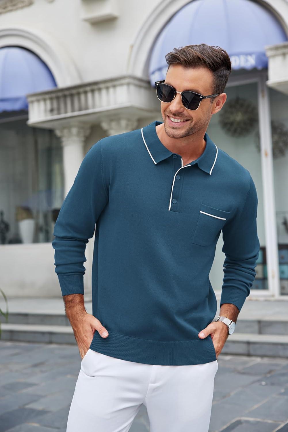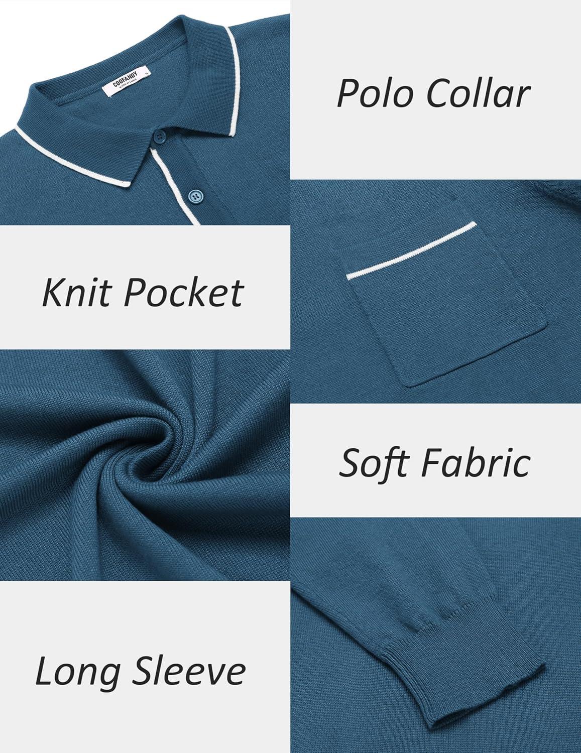 COOFANDY Mens Knit Polo Long Sleeve Collared Sweater Polo Business Casual Polos with Pocket(Dark Blue)