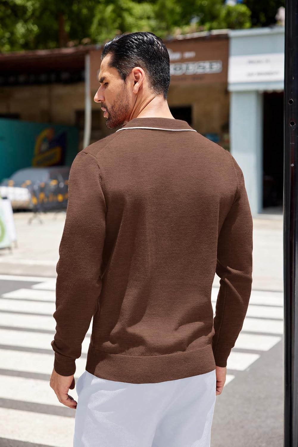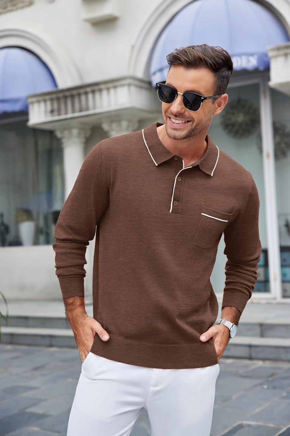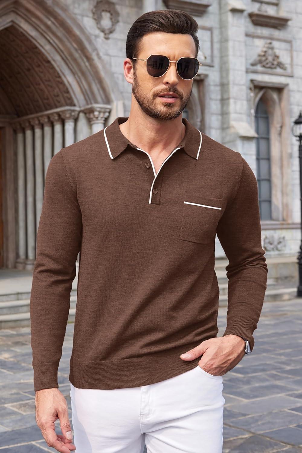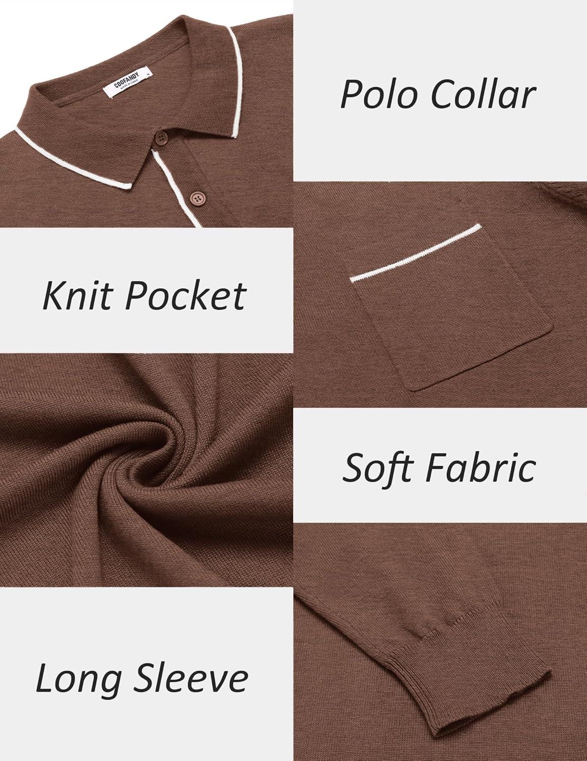 COOFANDY Mens Knit Polo Long Sleeve Collared Sweater Polo Business Casual Polos with Pocket(Dark Brown)