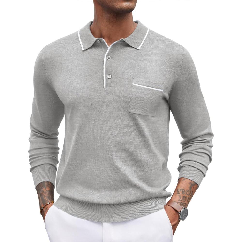 COOFANDY Mens Knit Polo Long Sleeve Collared Sweater Polo Business Casual Polos with Pocket(Light Gray)