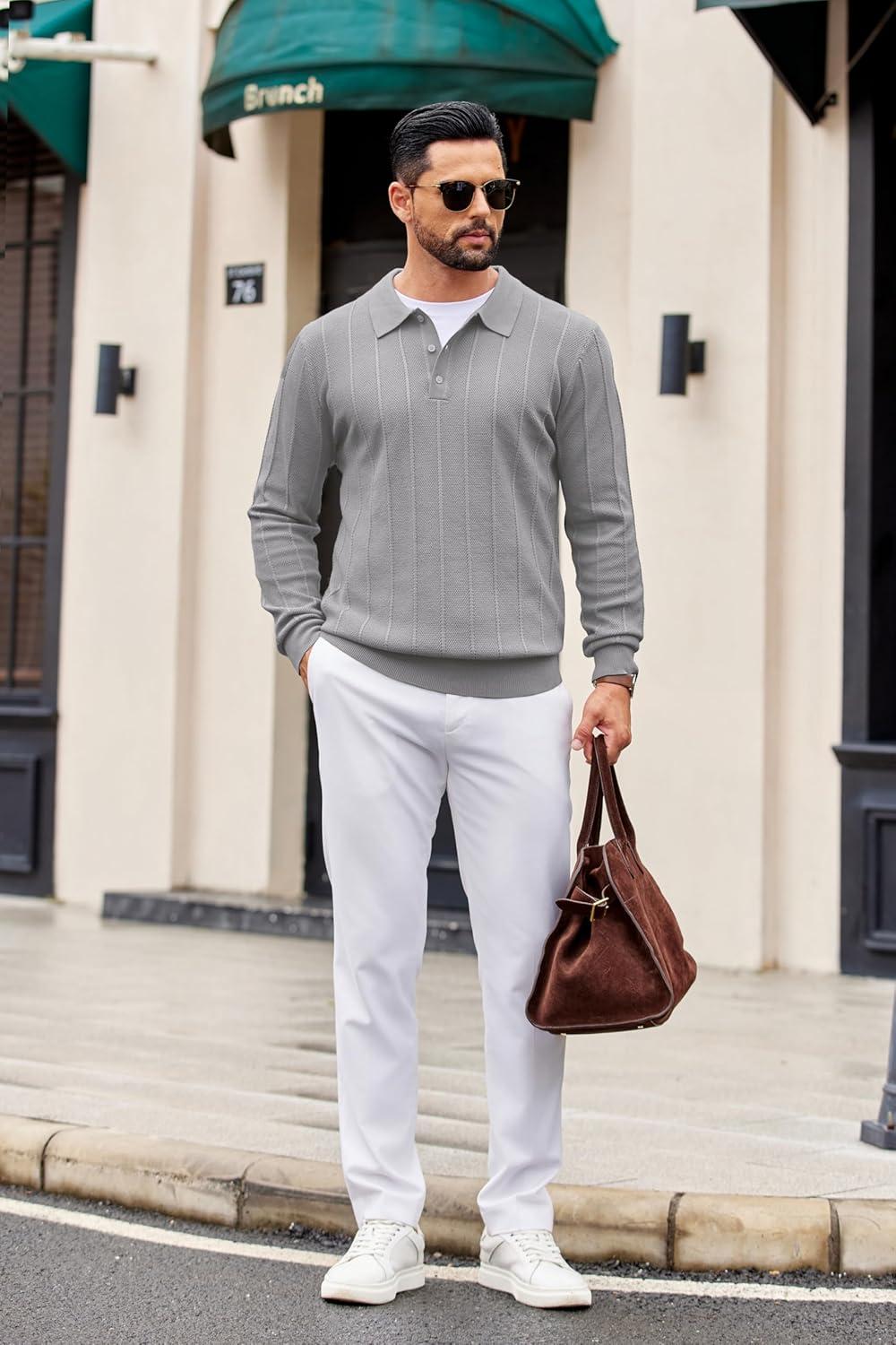 COOFANDY Mens Knit Polo Long Sleeve Polos Sweater Causal Collared Golf Sweaters Fashion Business Dress Pullover(Light Grey)