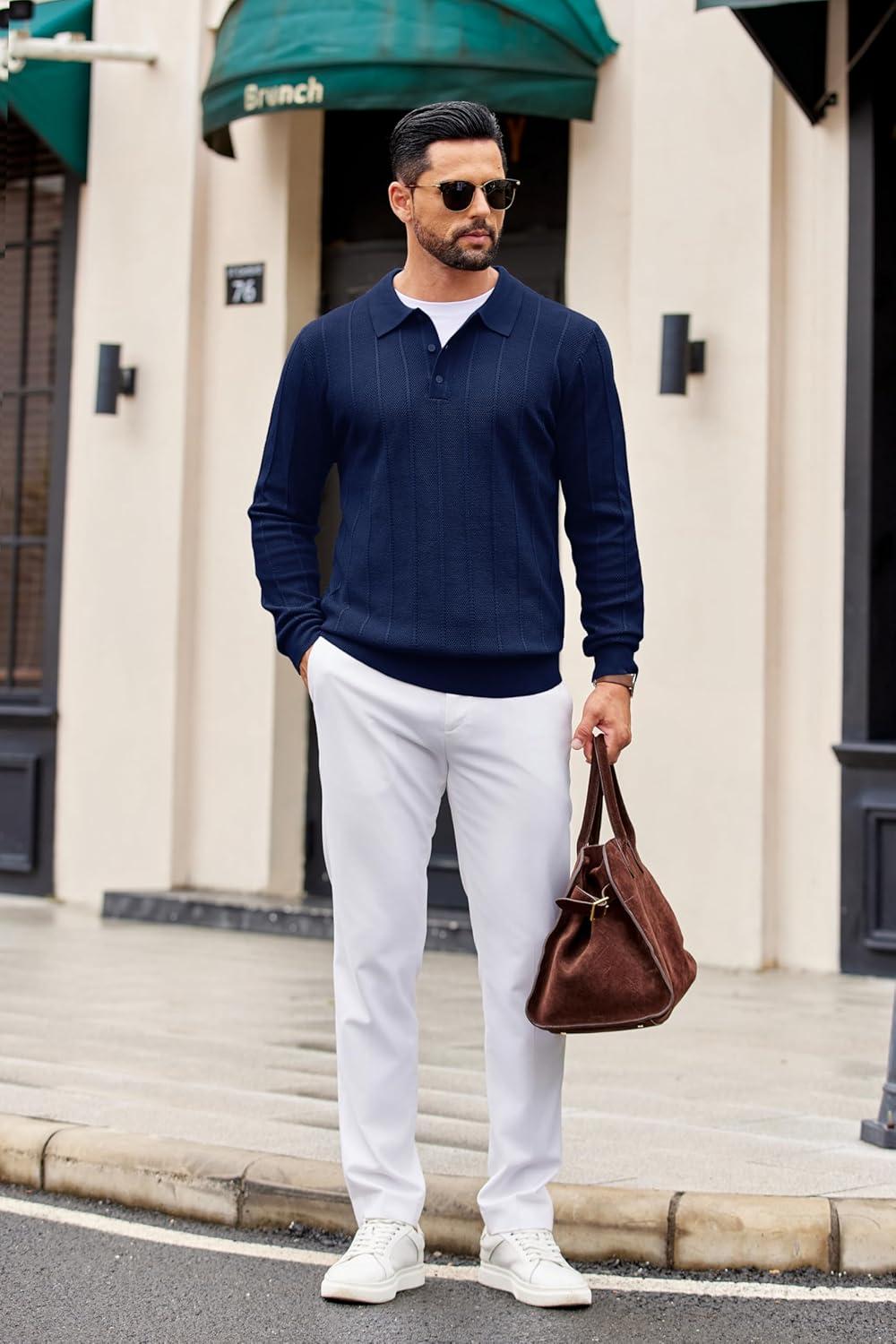 COOFANDY Mens Knit Polo Long Sleeve Polos Sweater Causal Collared Golf Sweaters Fashion Business Dress Pullover(White)