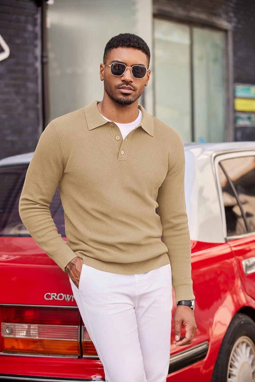 COOFANDY Men’s Knit Polo Long Sleeve Sweaters Collared Polo Sweater Casual Dress Pullover Fashion Golf Sweaters(Khaki)