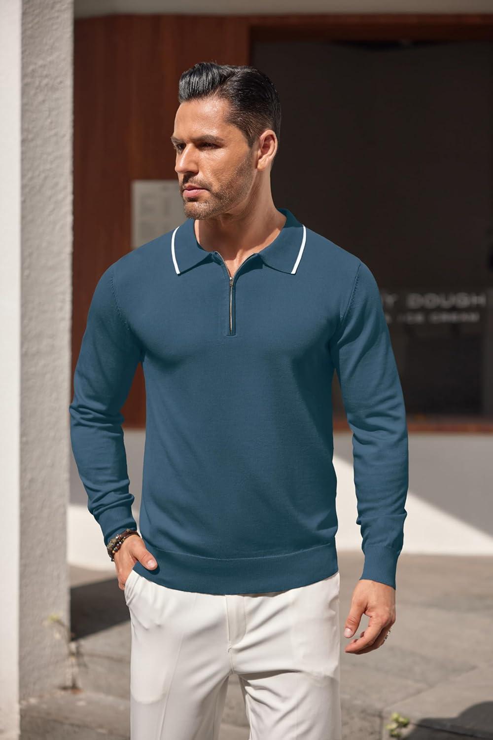 COOFANDY Men's Knit Polo Shirt Long Sleeve Quarter Zip Polo Sweater Casual Golf Shirts Vintage Striped Collar Polo(Dark Blue)