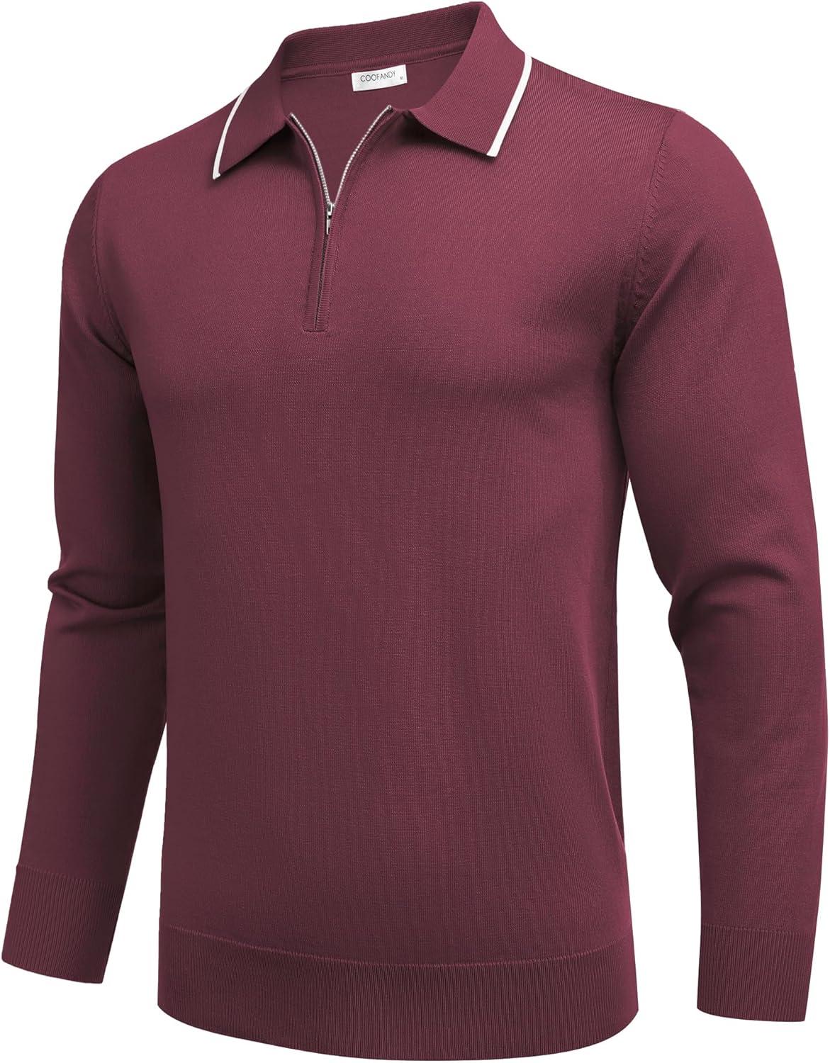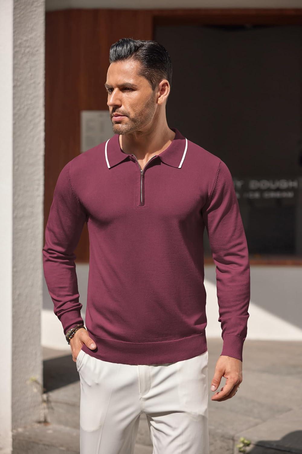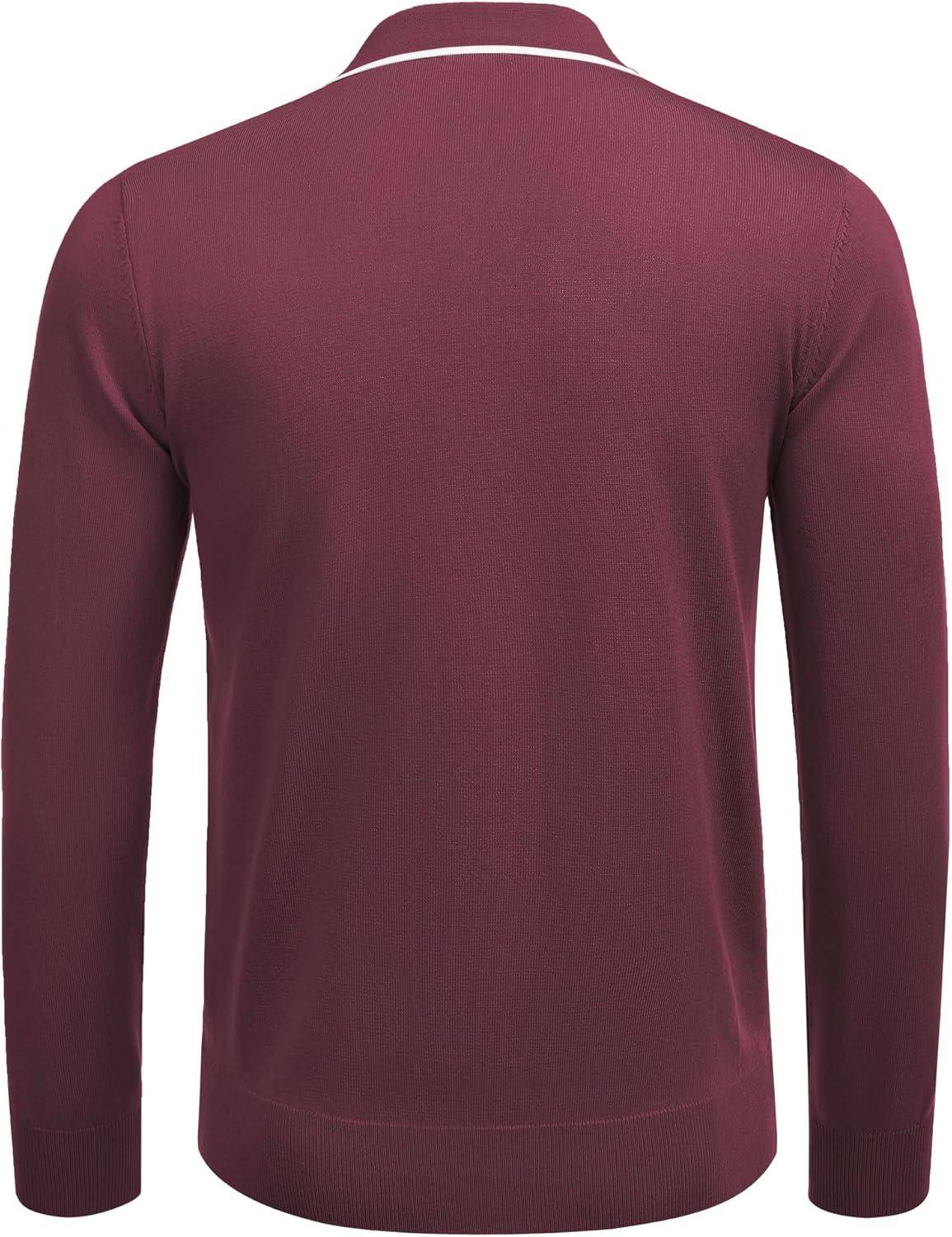 COOFANDY Men’s Knit Polo Shirt Long Sleeve Quarter Zip Polo Sweater Casual Golf Shirts Vintage Striped Collar Polo(Wine Red)