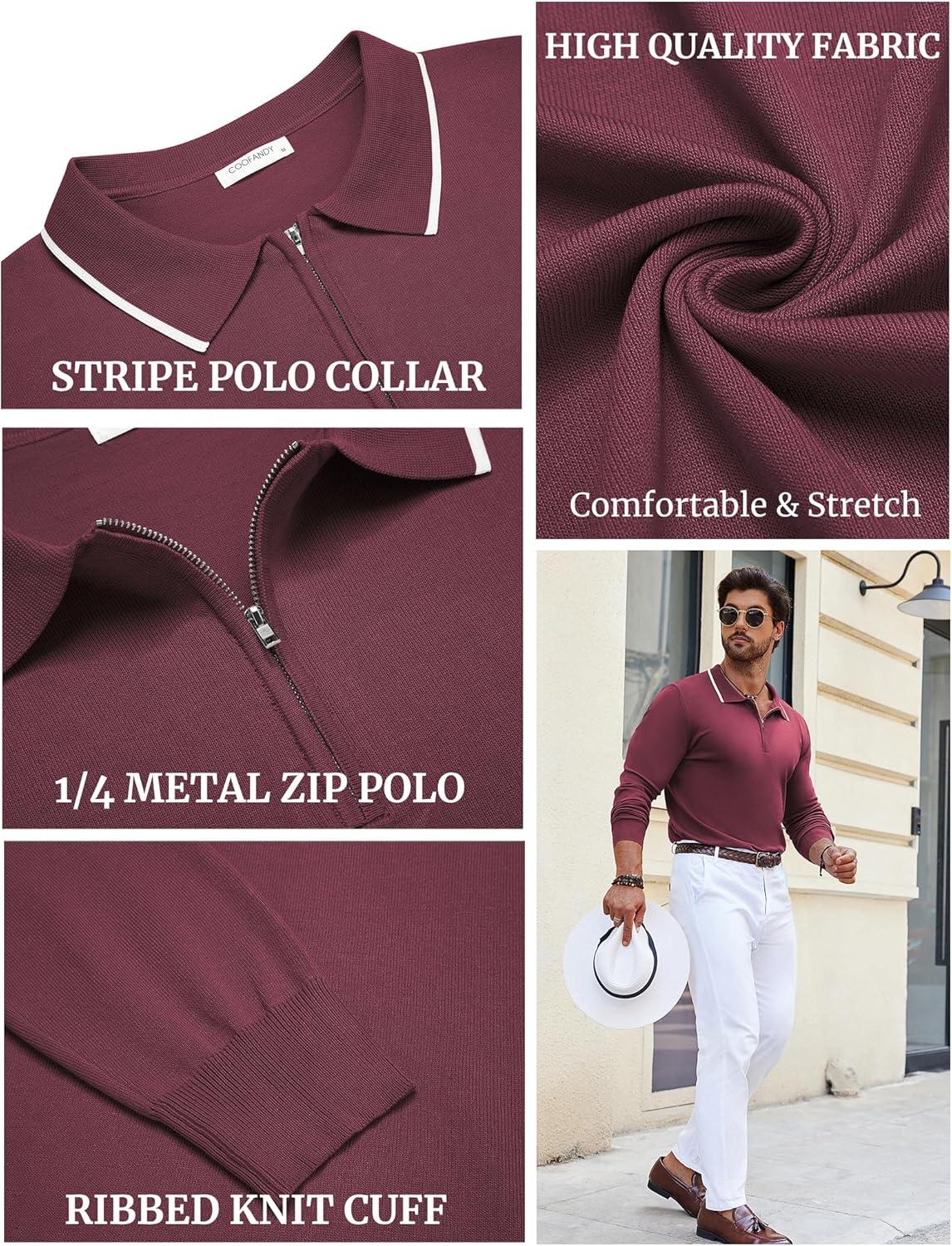 COOFANDY Men's Knit Polo Shirt Long Sleeve Quarter Zip Polo Sweater Casual Golf Shirts Vintage Striped Collar Polo(Wine Red)