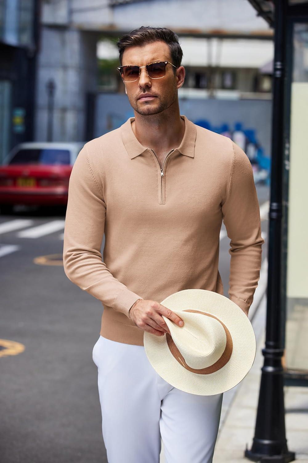 COOFANDY Mens Knit Polo Shirt Quarter Zip Slim Fit Pullover Long Sleeve Sweater Polo(Khaki)