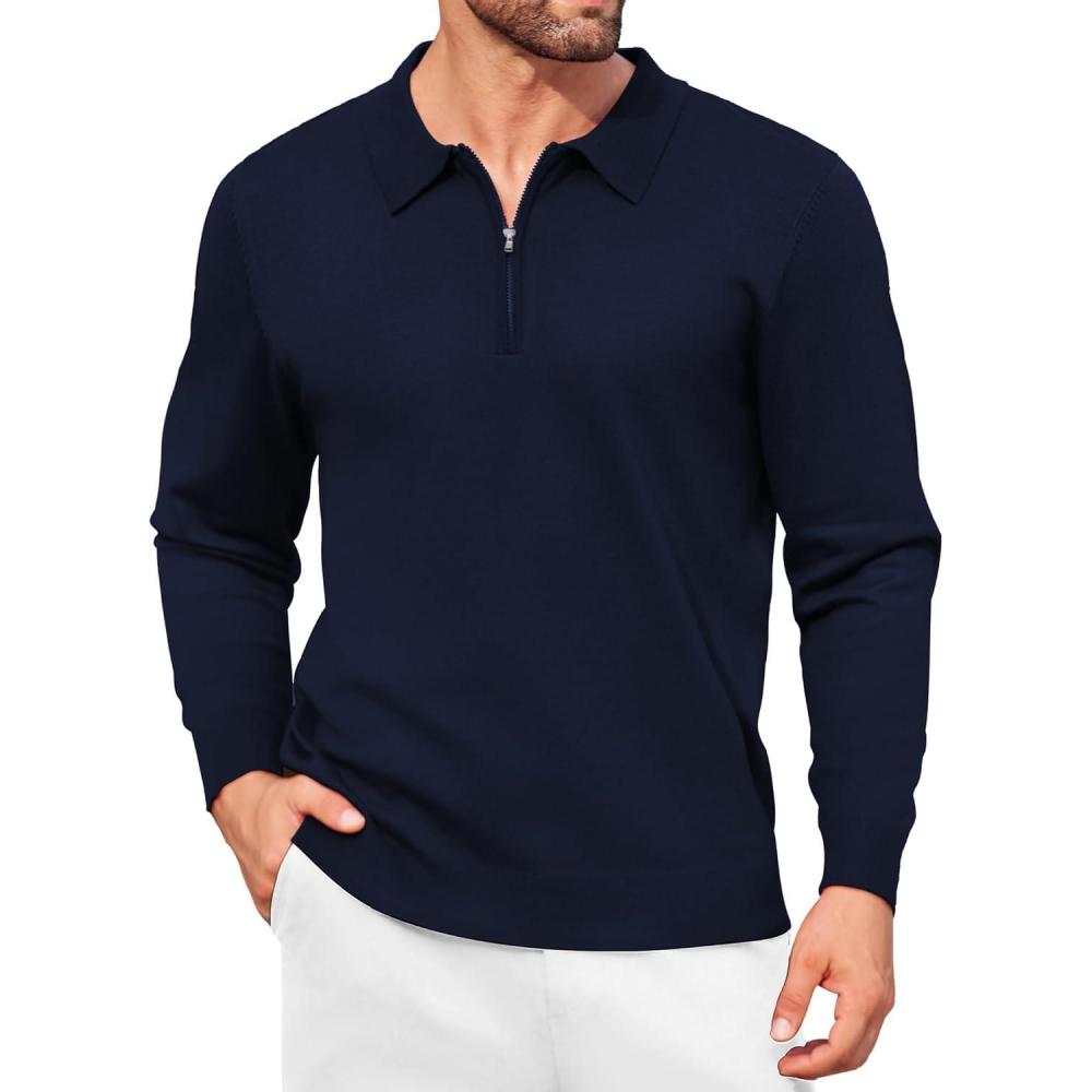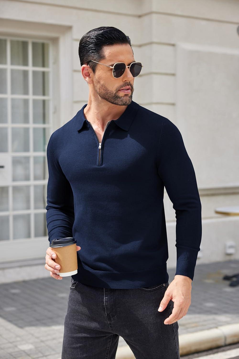 COOFANDY Mens Knit Polo Shirt Quarter Zip Slim Fit Pullover Long Sleeve Sweater Polo(Navy Blue)