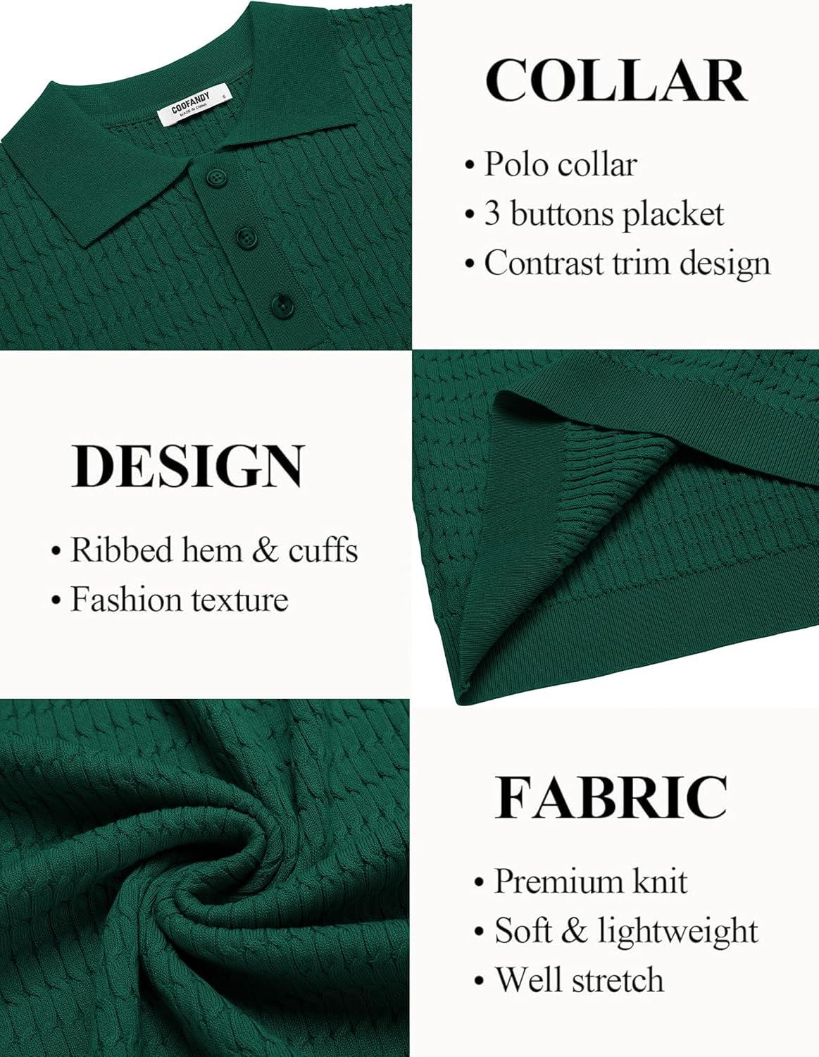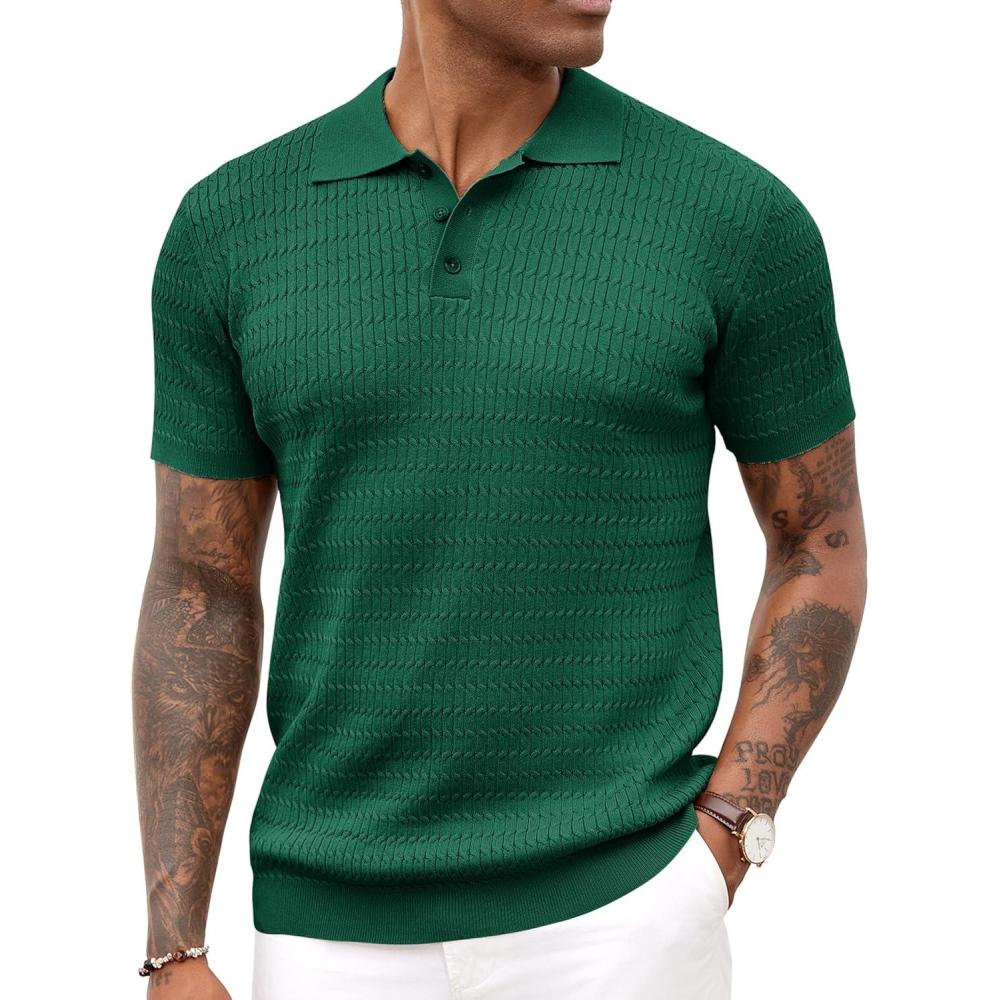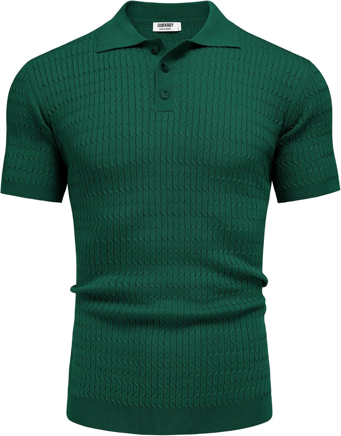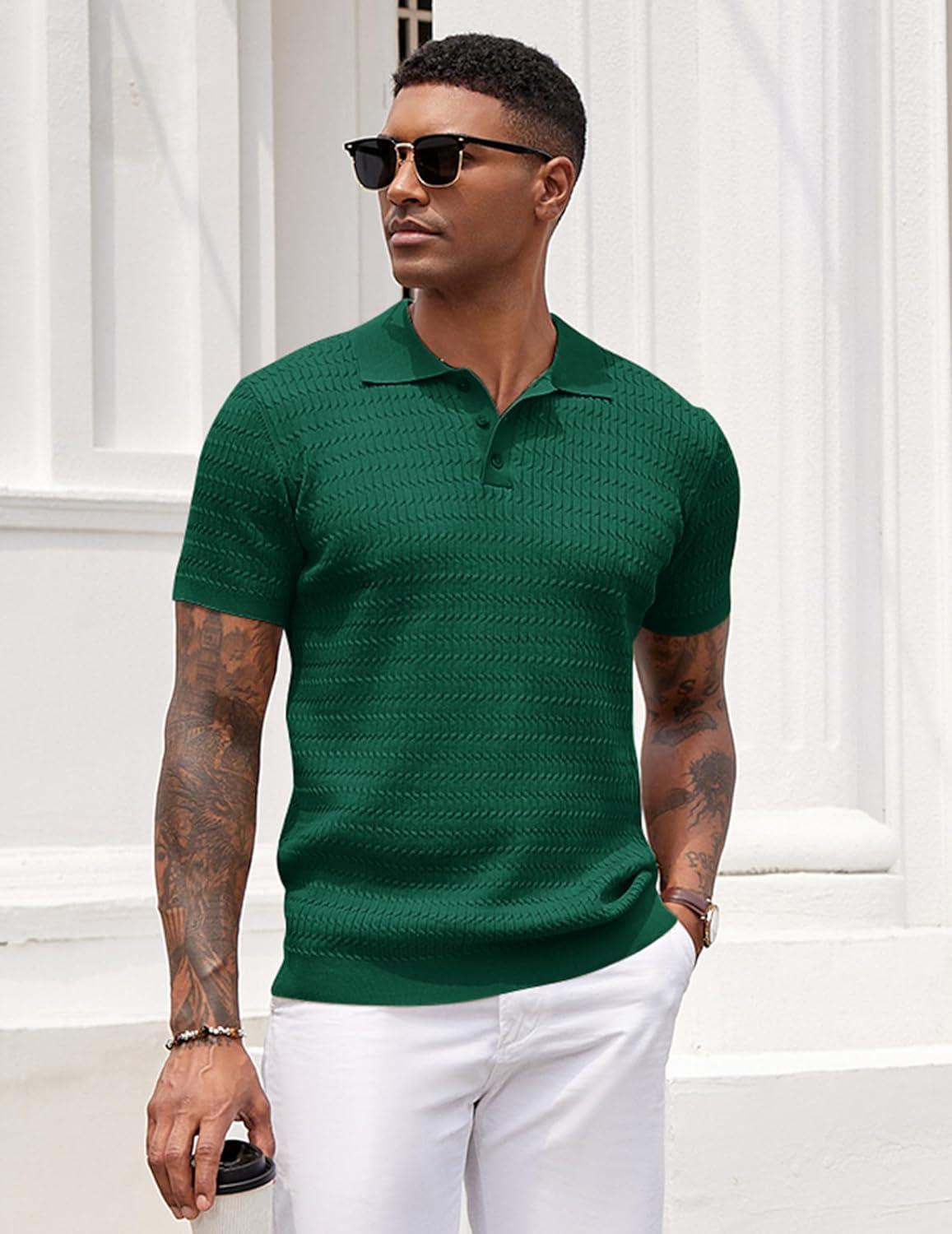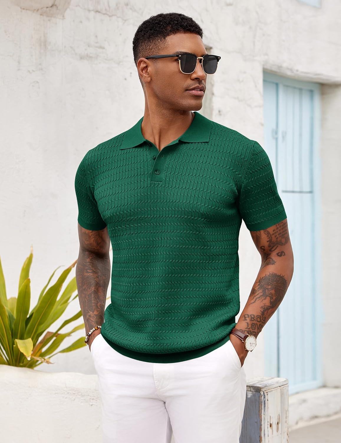 COOFANDY Mens Knit Polo Shirt Short Sleeve Vintage Textured Casual Golf Shirts Summer Beach Top(Dark Green)