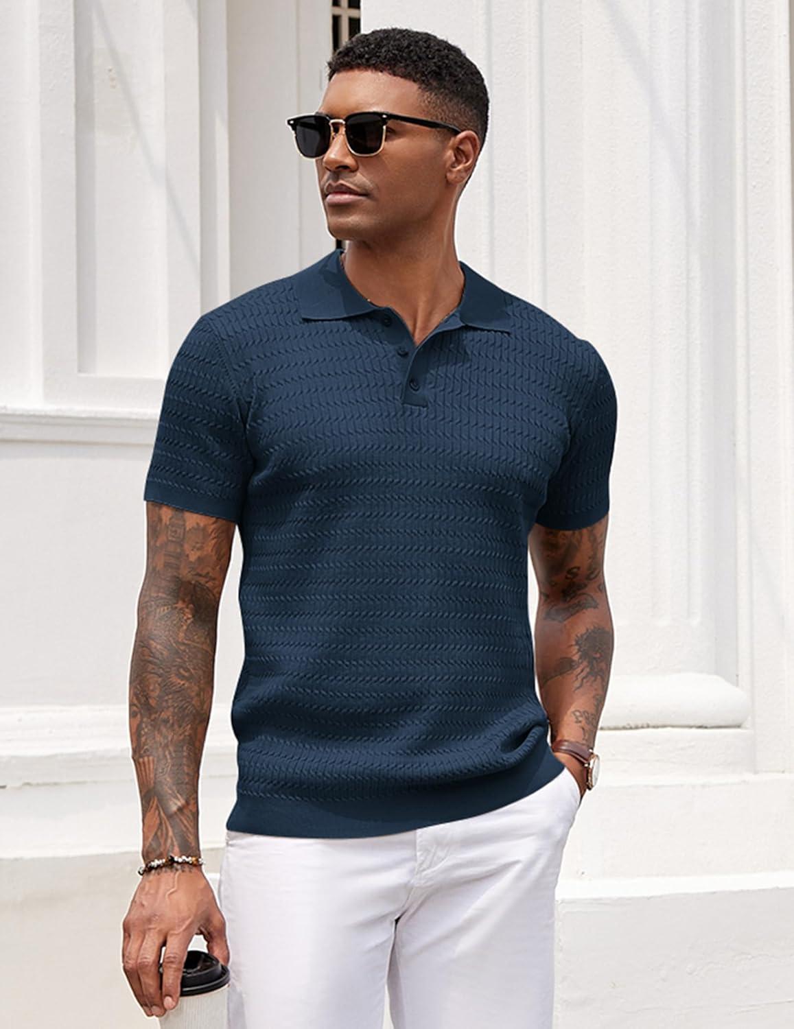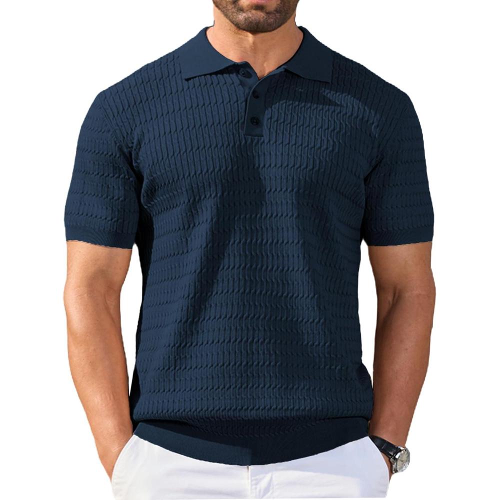 COOFANDY Mens Knit Polo Shirt Short Sleeve Vintage Textured Casual Golf Shirts Summer Beach Top(Navy Blue)