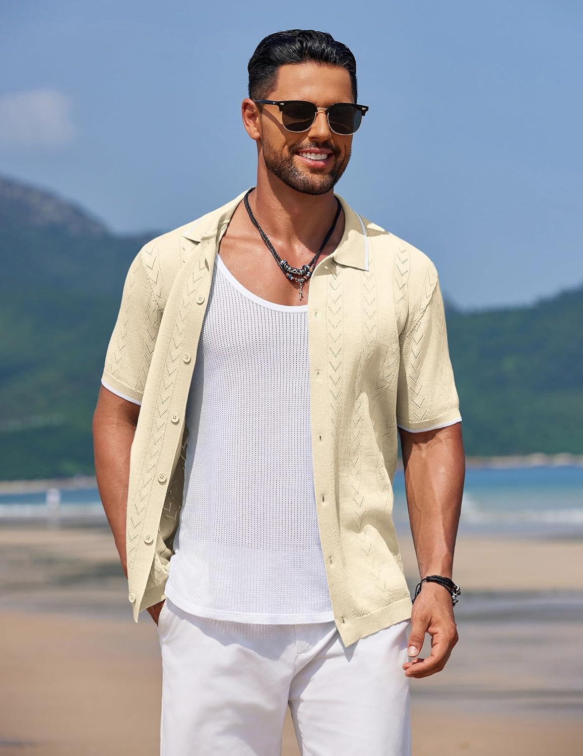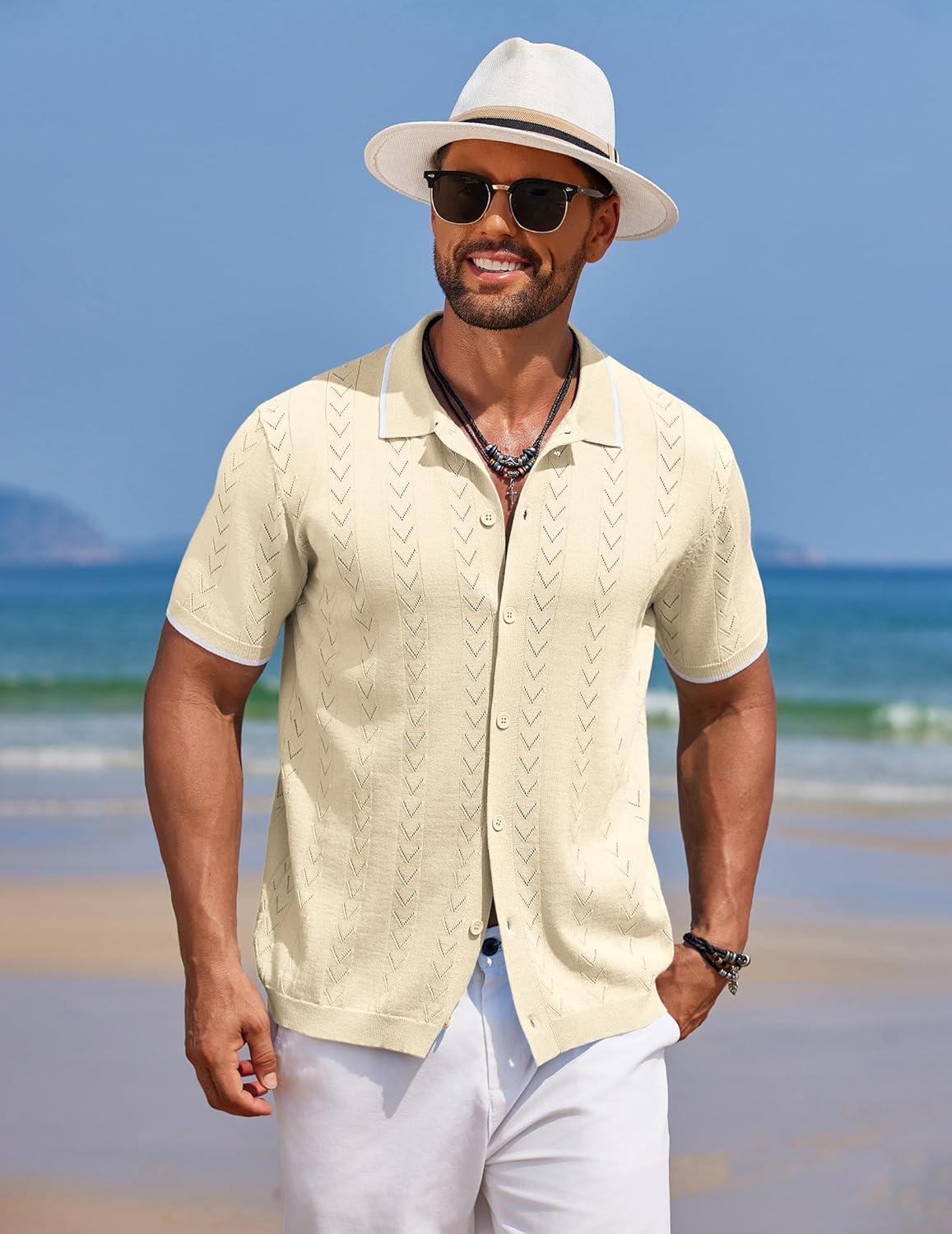 COOFANDY Mens Knit Polo Shirts Button Down Short Sleeve Shirt Summer Casual Beach Vacation Tops(Cream)