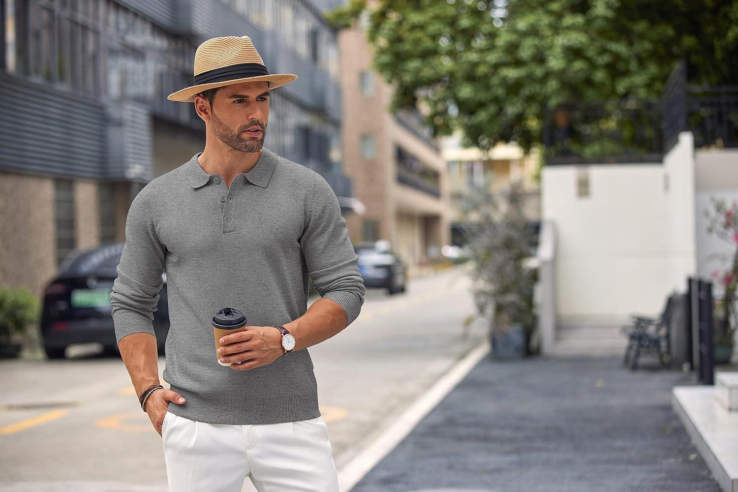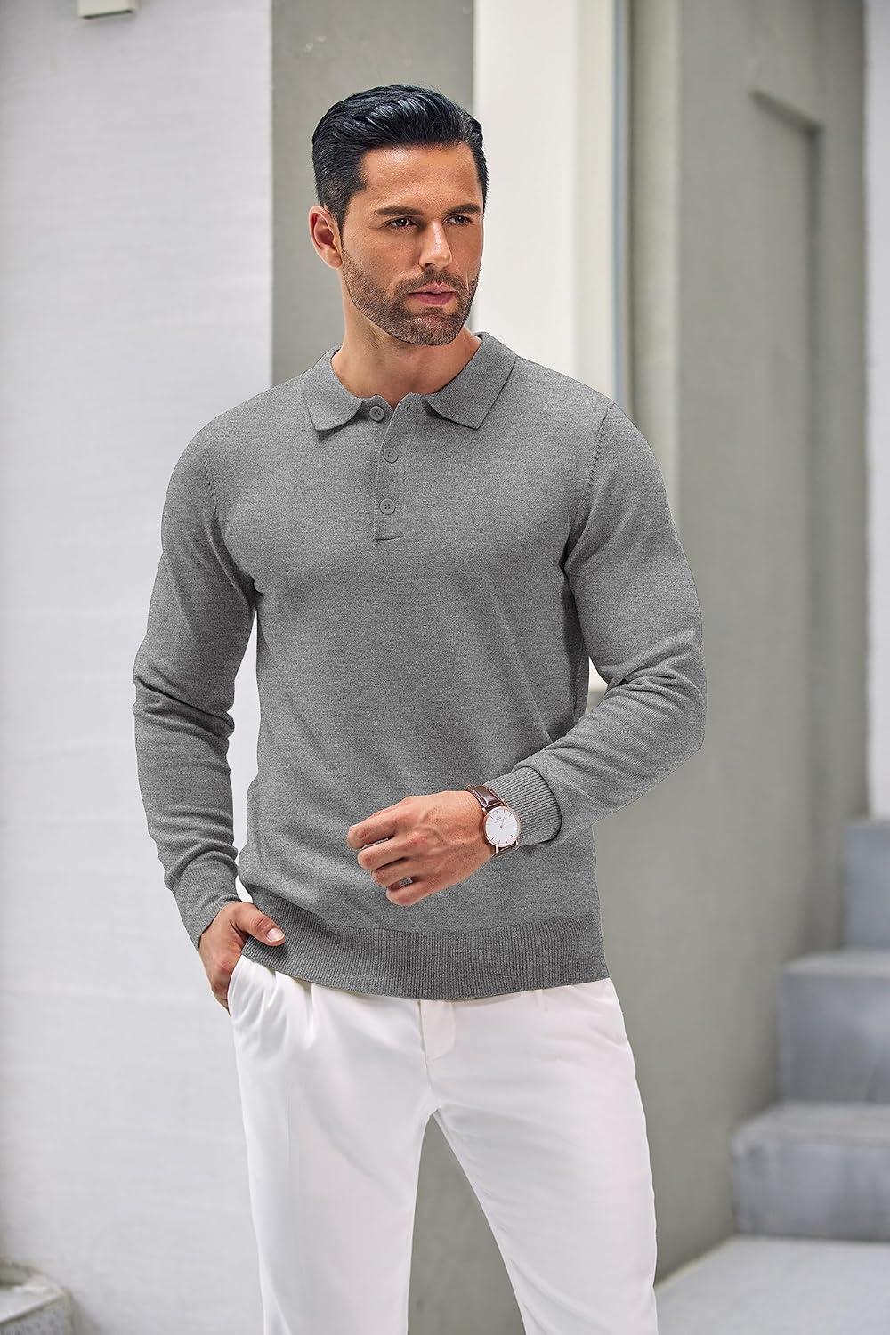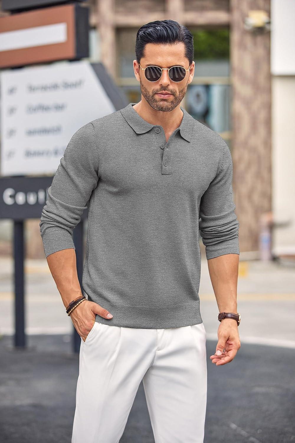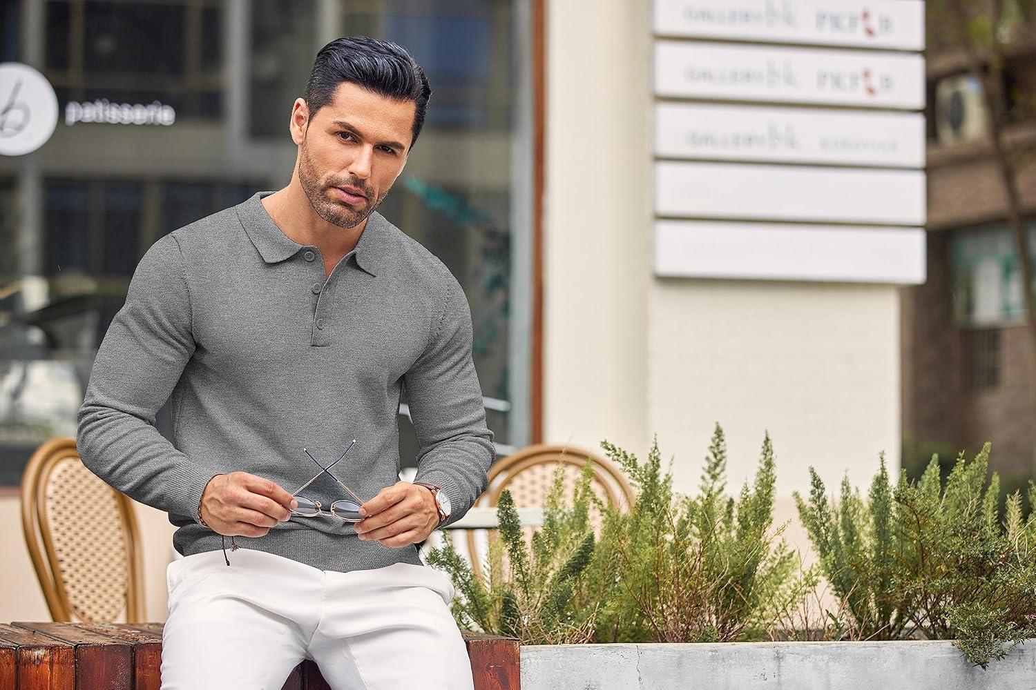 COOFANDY Mens Knit Polo Shirts Casual Long Sleeve Classic Polo Shirts Button Down Golf Shirts(Grey)