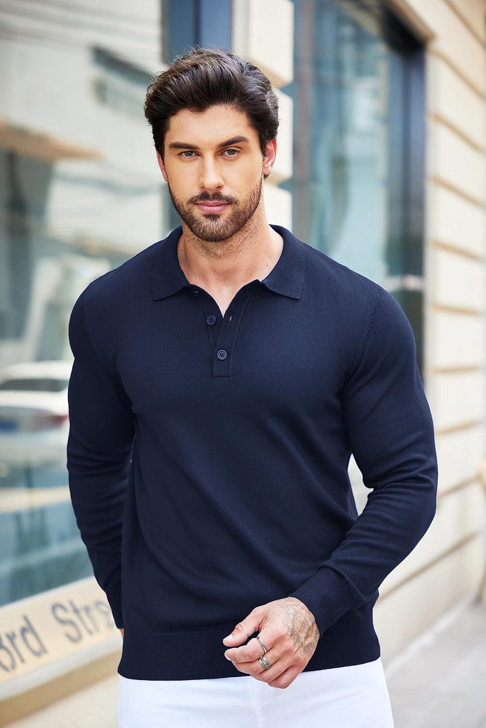 COOFANDY Mens Knit Polo Shirts Casual Long Sleeve Classic Polo Shirts Button Down Golf Shirts(Navy Blue)