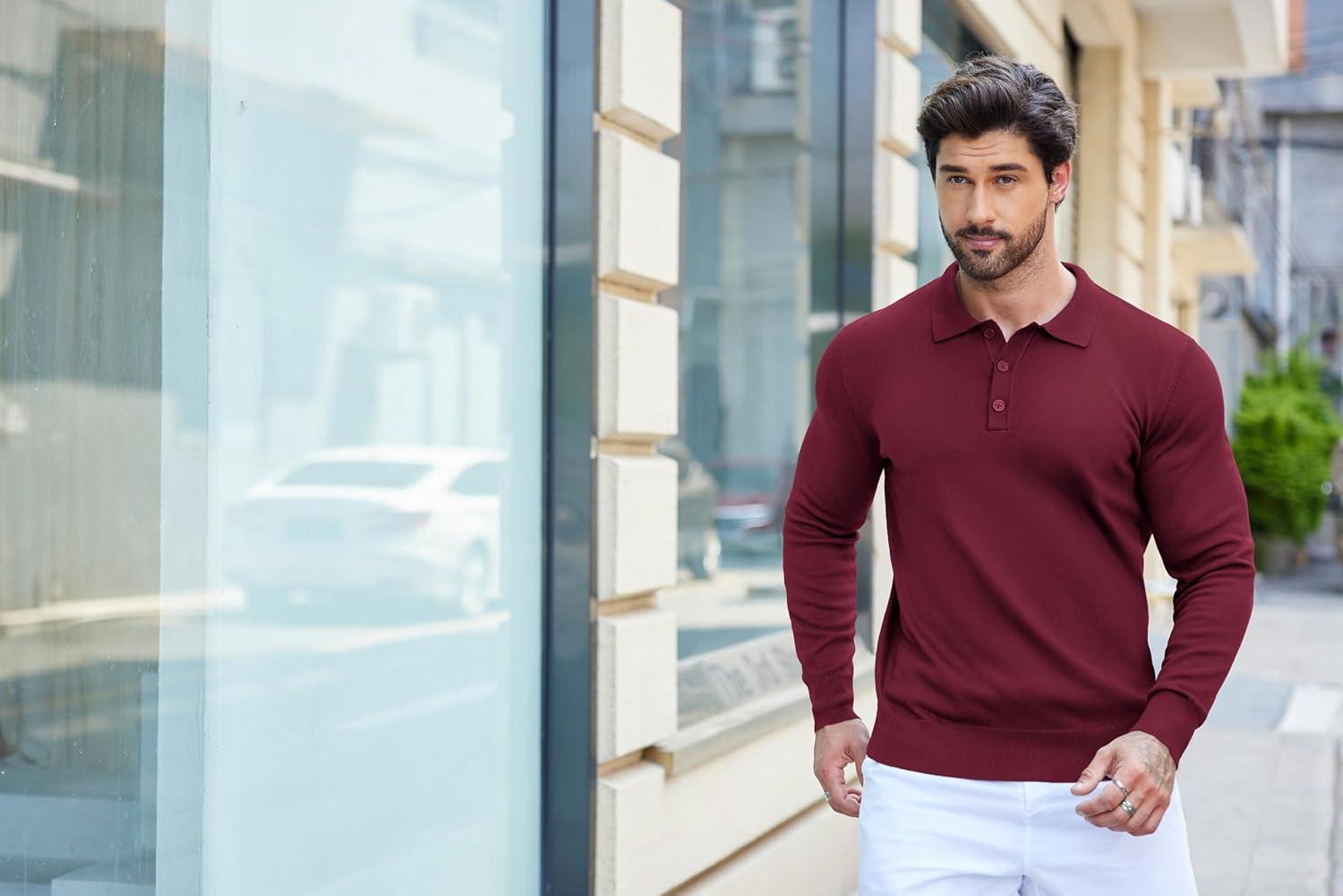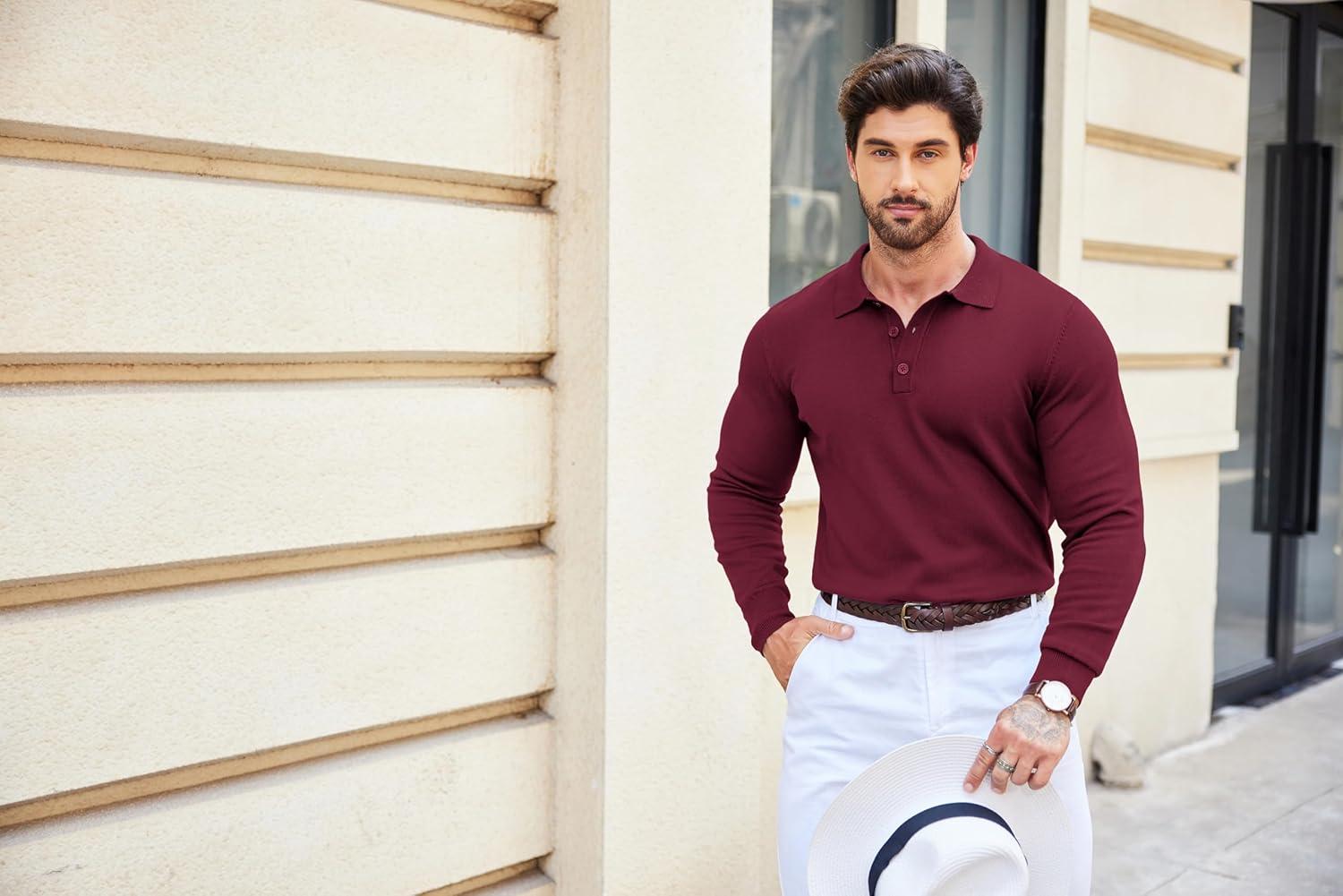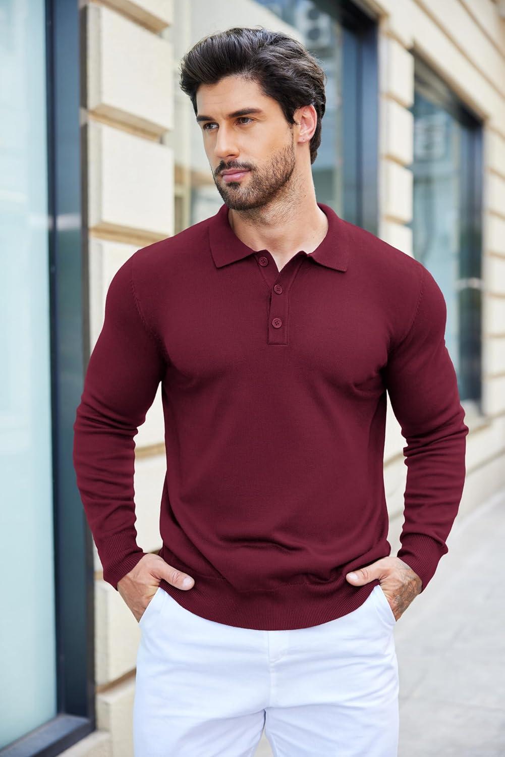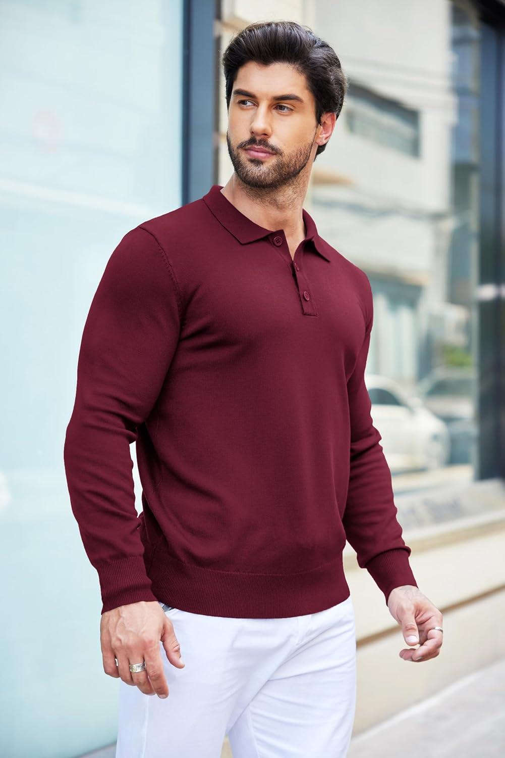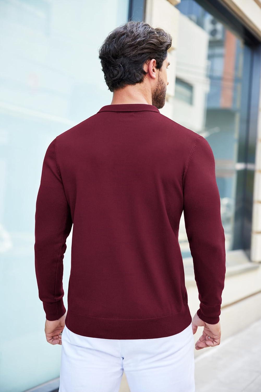 COOFANDY Mens Knit Polo Shirts Casual Long Sleeve Classic Polo Shirts Button Down Golf Shirts(Wine Red)