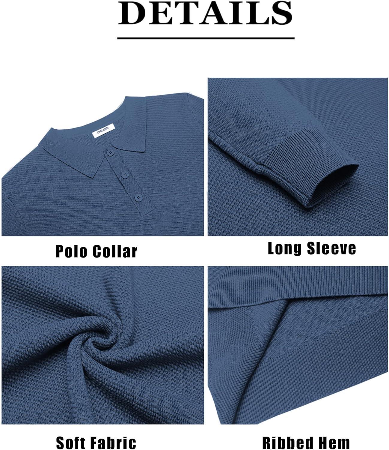 COOFANDY Men's Knit Polo Shirts Casual Long Sleeve Collared Pullover Sweaters Quarter Button Ribbed Vintage Polo Sweater(Blue)