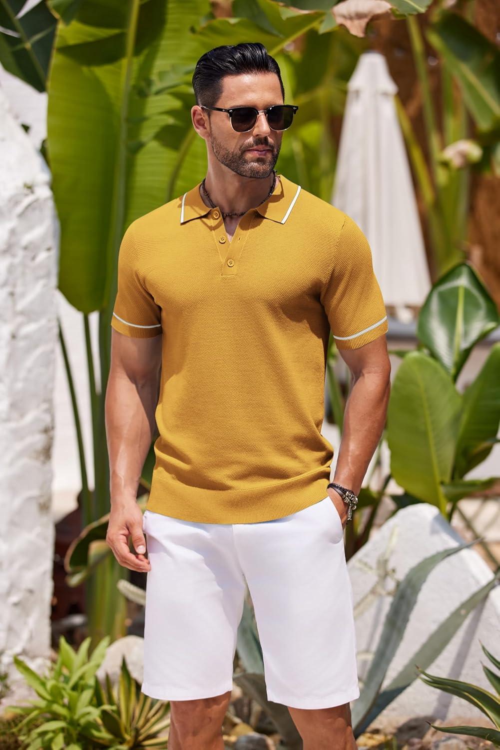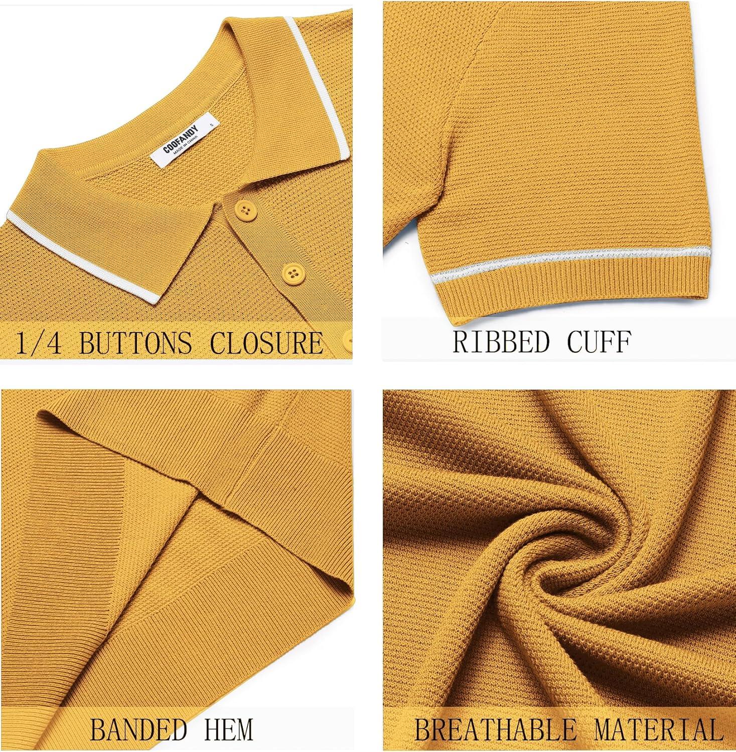 imageCOOFANDY Mens Knit Polo Shirts Casual Short Sleeve Button Down Shirts Crochet Classic Golf Polo Collared ShirtsYellow