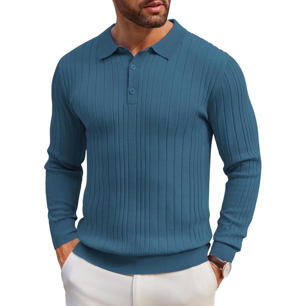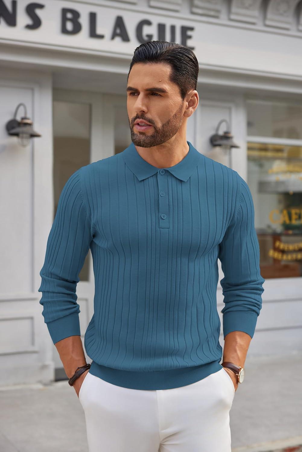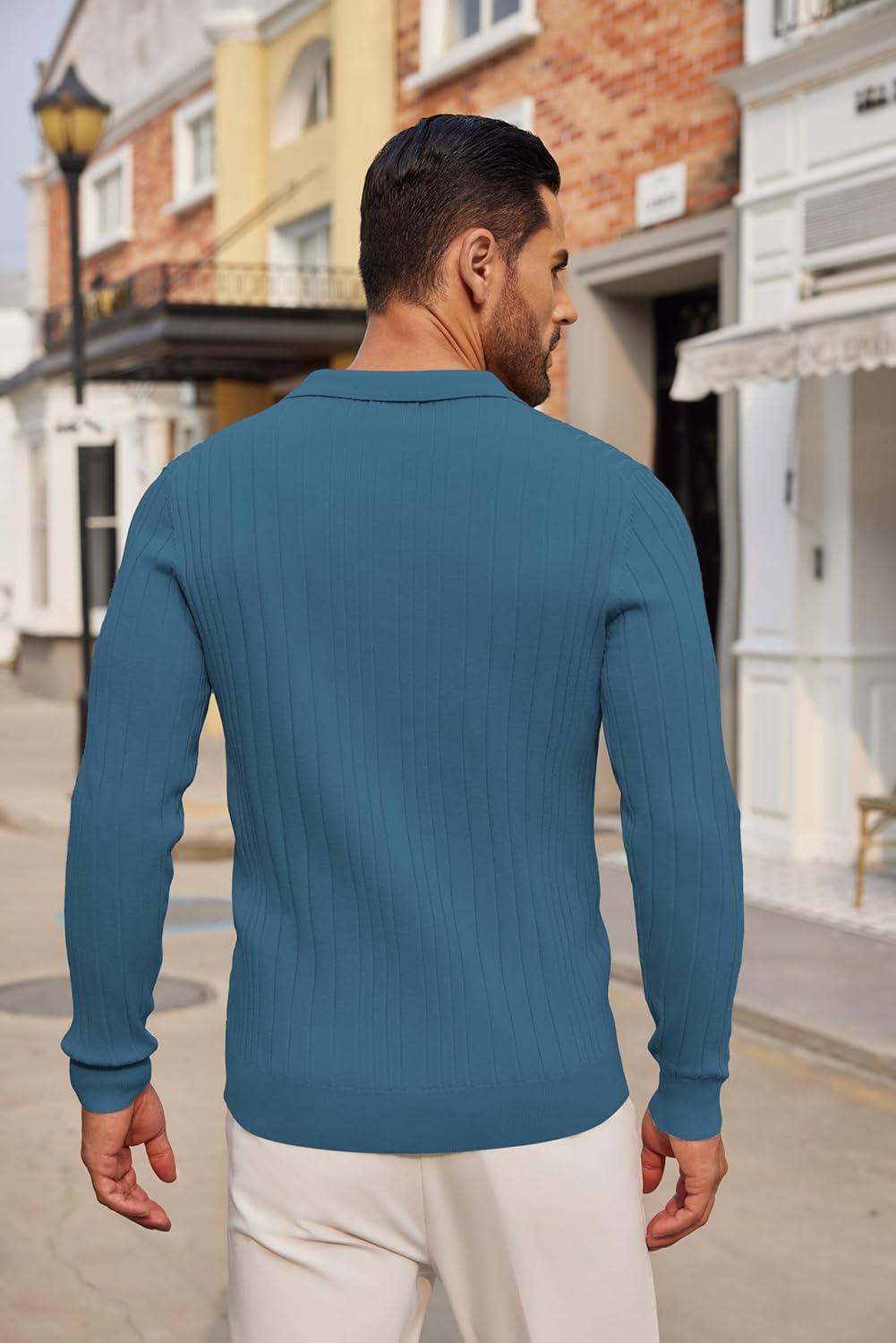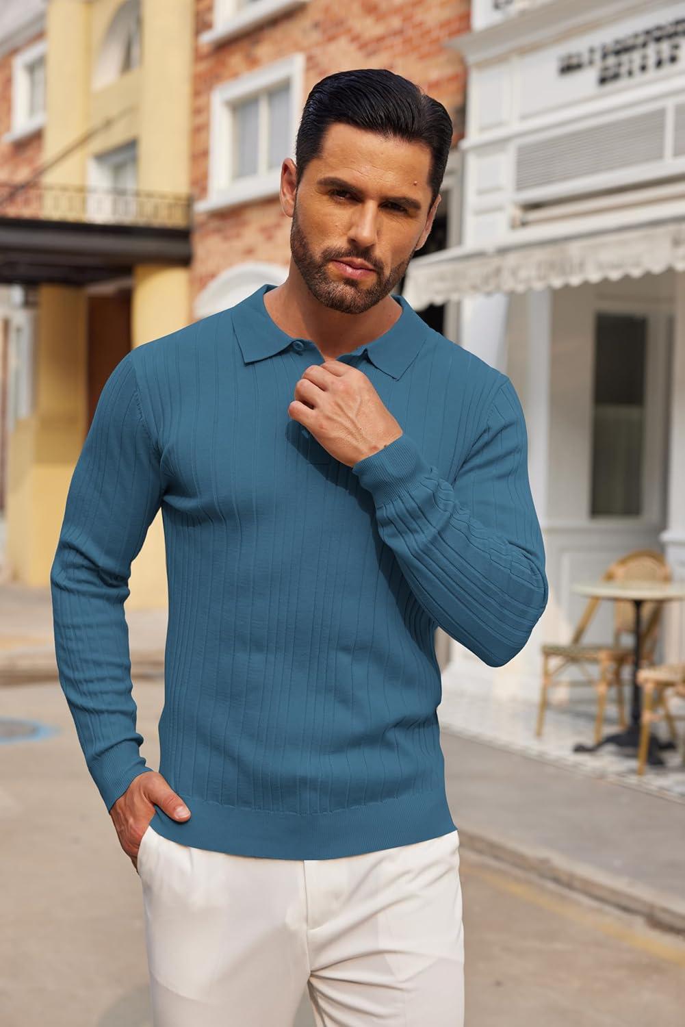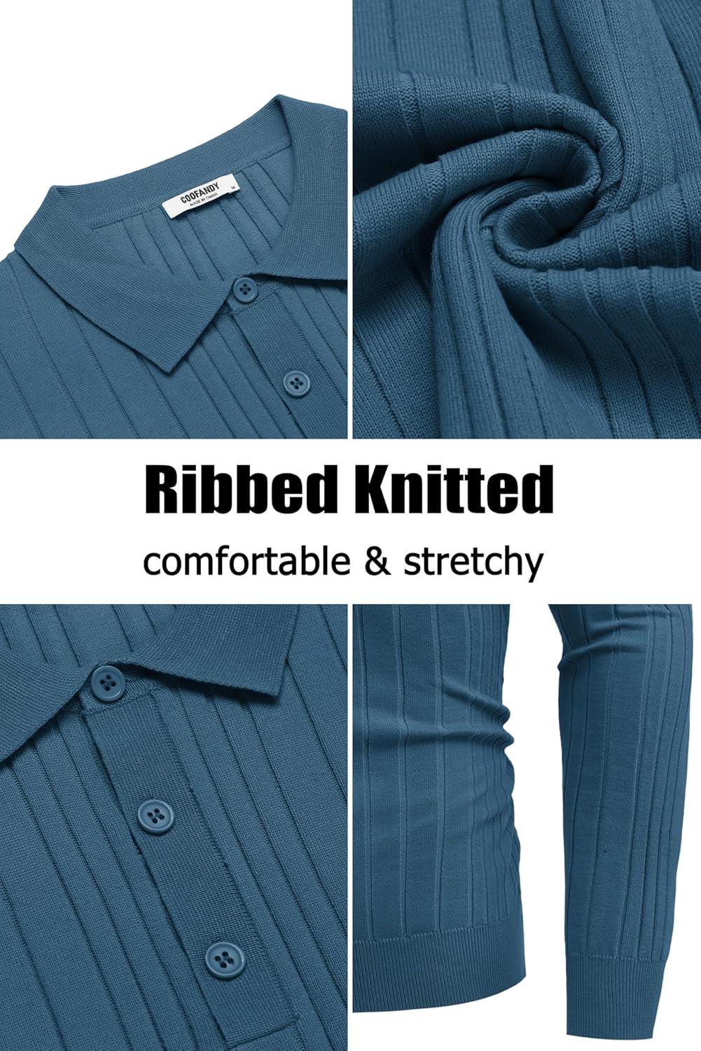 COOFANDY Men's Knit Polo Shirts Long Sleeve Casual Button Down Ribbed Polo Shirt Fashion Golf Shirts(Blue)