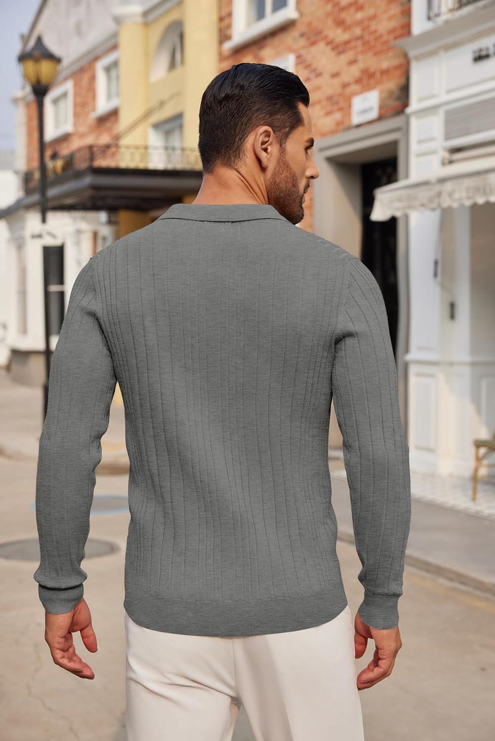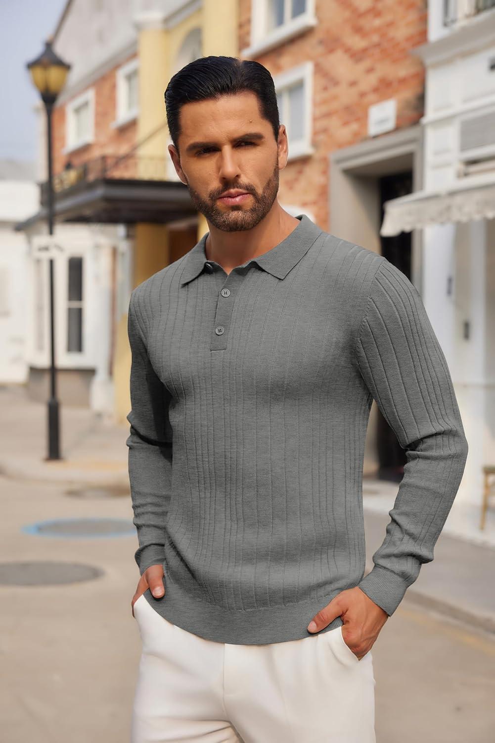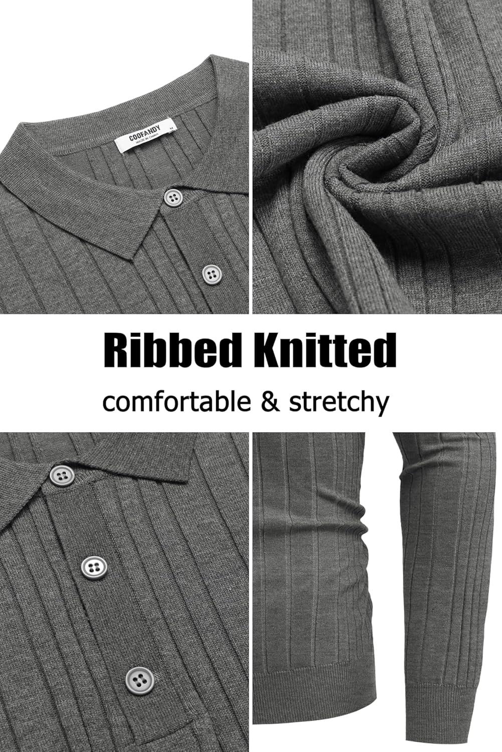 COOFANDY Men's Knit Polo Shirts Long Sleeve Casual Button Down Ribbed Polo Shirt Fashion Golf Shirts(Dark Grey)