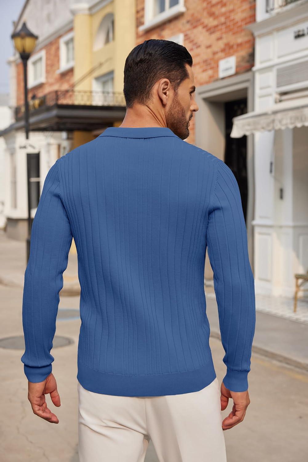 COOFANDY Men's Knit Polo Shirts Long Sleeve Casual Button Down Ribbed Polo Shirt Fashion Golf Shirts(Denim Blue)