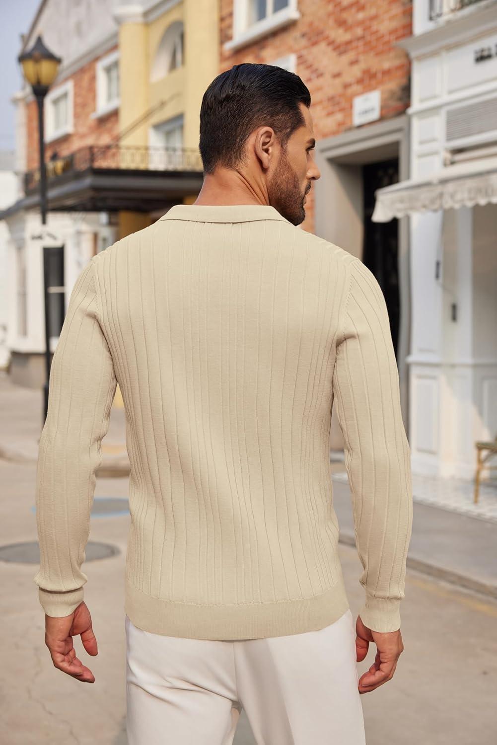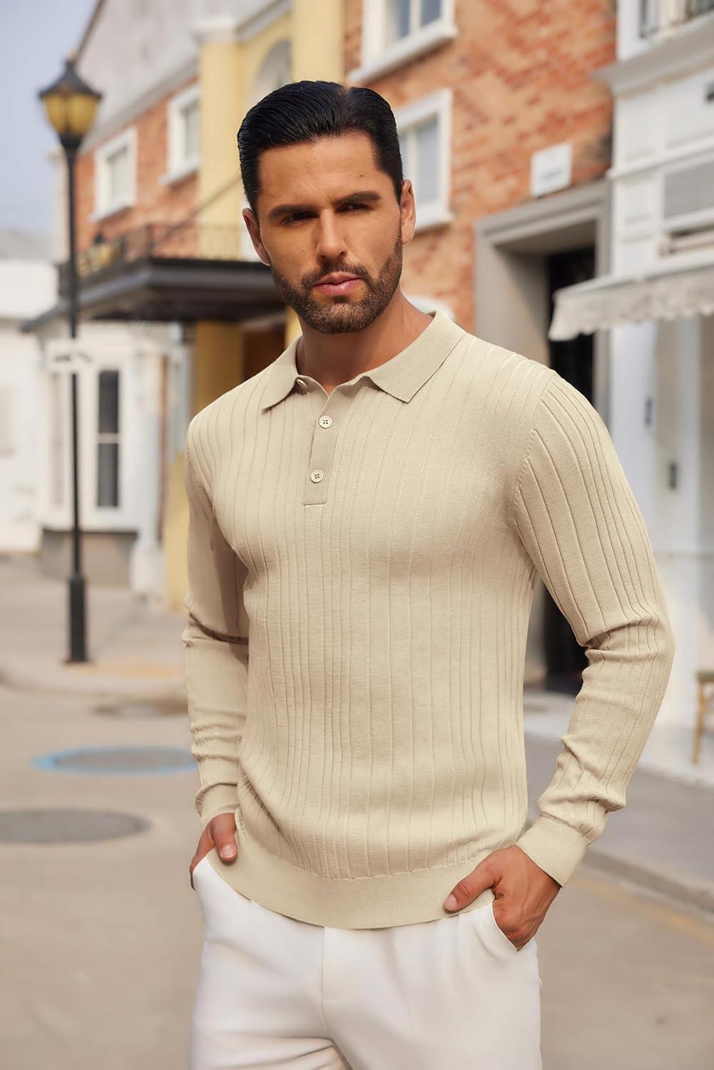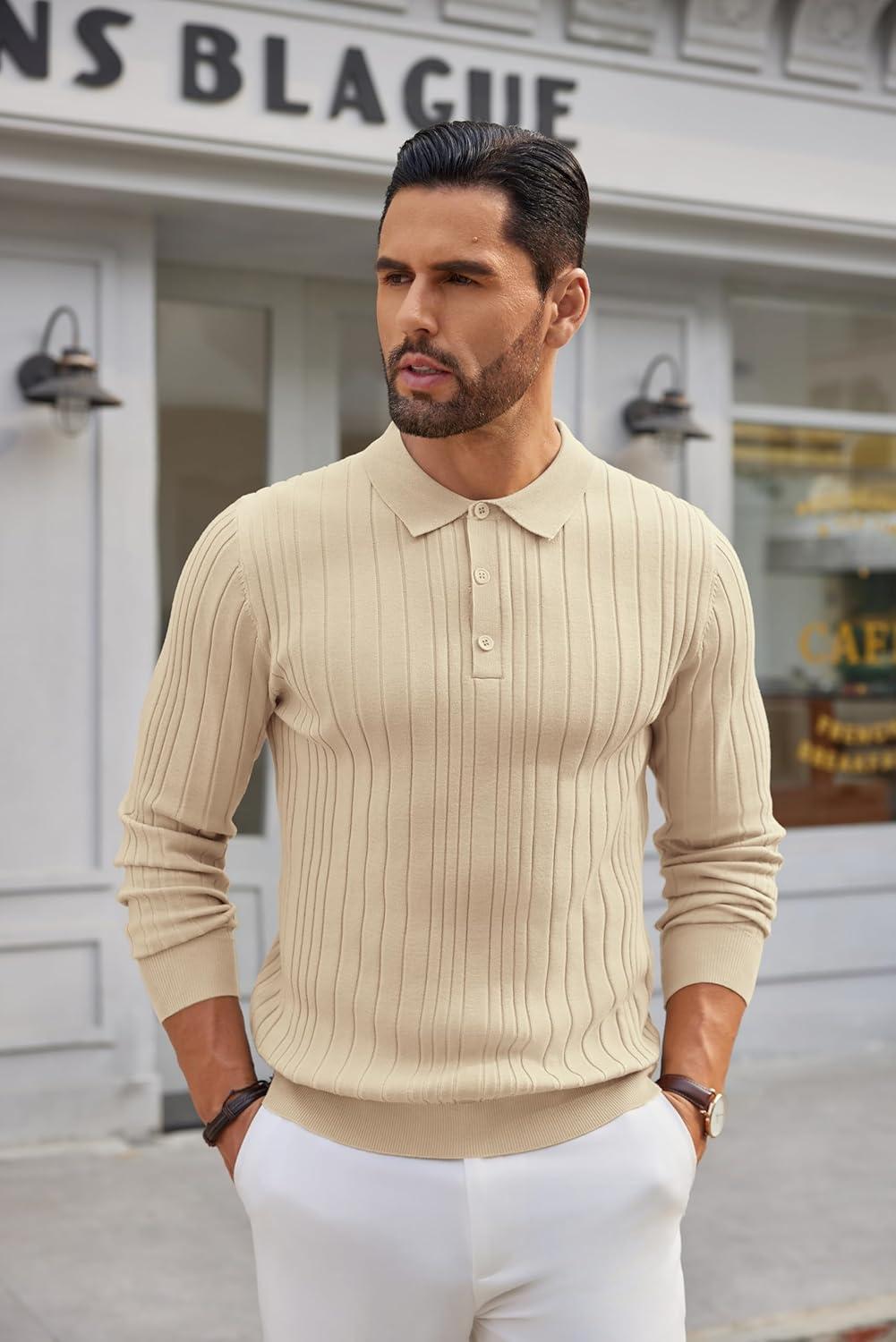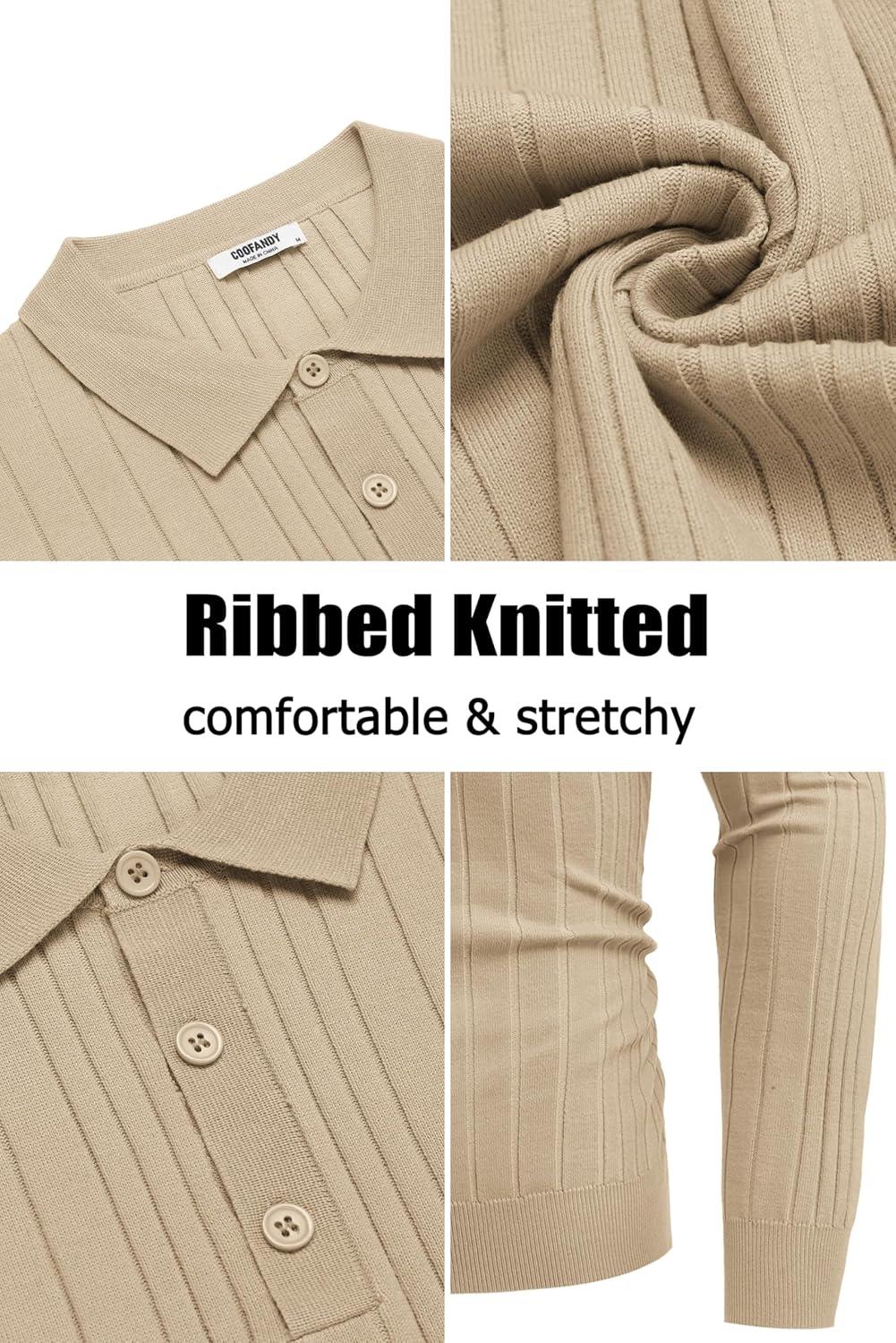 COOFANDY Men’s Knit Polo Shirts Long Sleeve Casual Button Down Ribbed Polo Shirt Fashion Golf Shirts(Light Khaki)