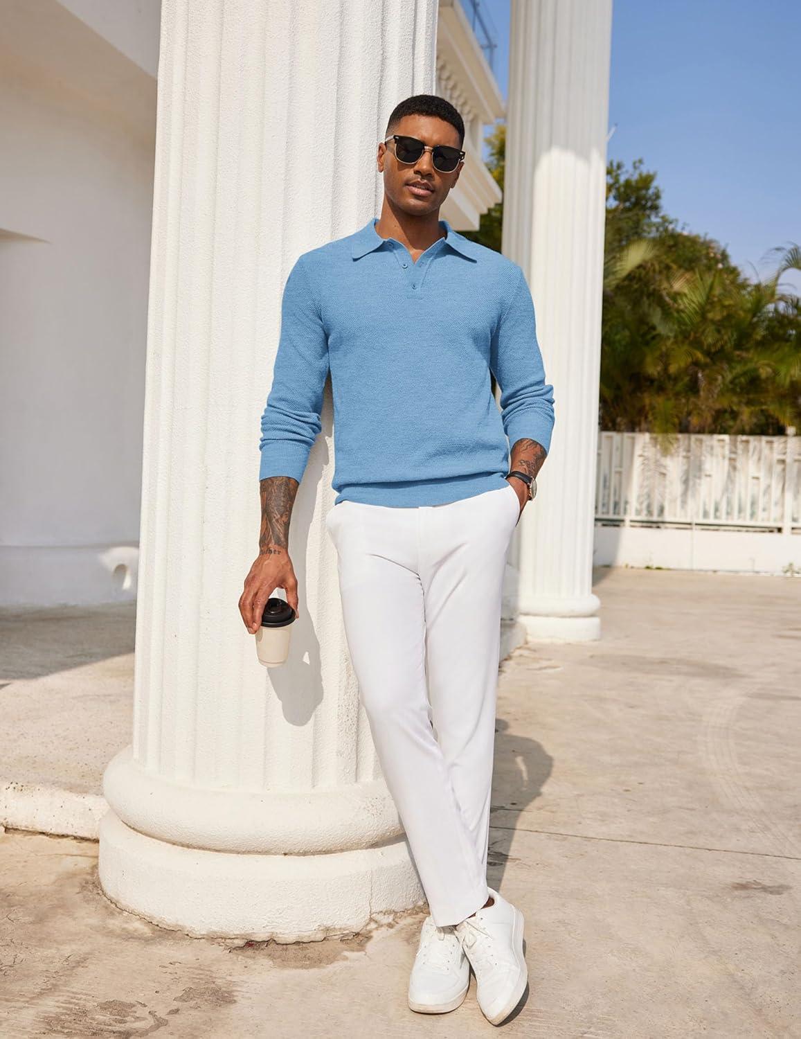 COOFANDY Mens Knit Polo Shirts Long Sleeve Casual Polo Sweaters Shirt Waffle Textured Collared Sweater(Light Blue)