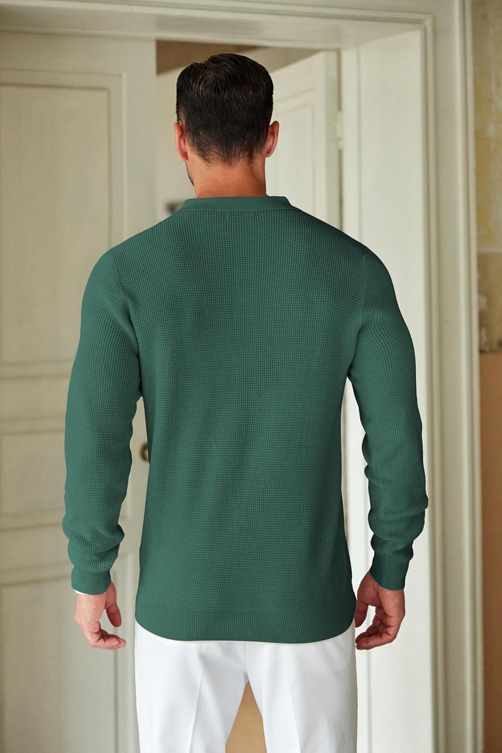 COOFANDY Mens Knit Polo Shirts Long Sleeve Sweater Casual Polo Shirts Lightweight Collared T Shirts(Drak Green)