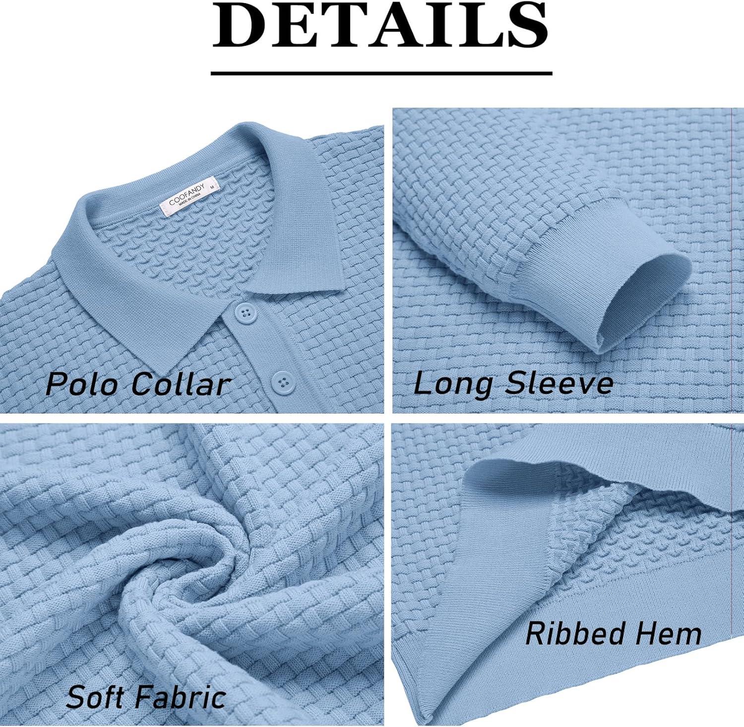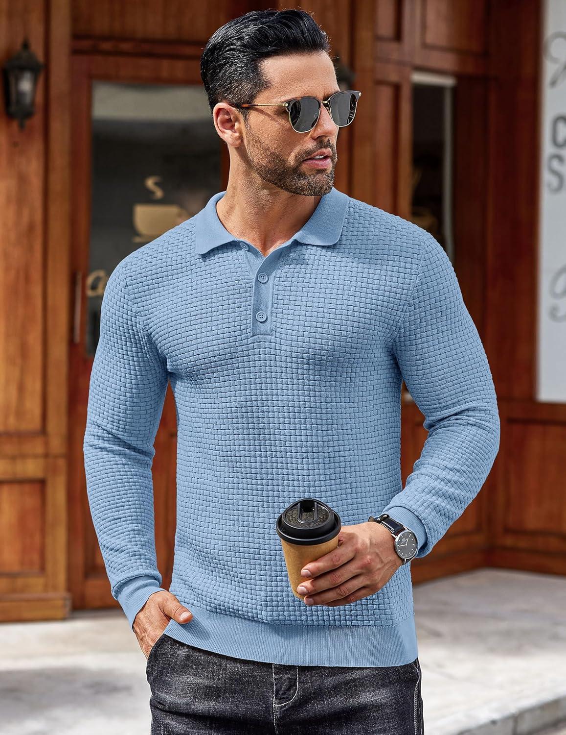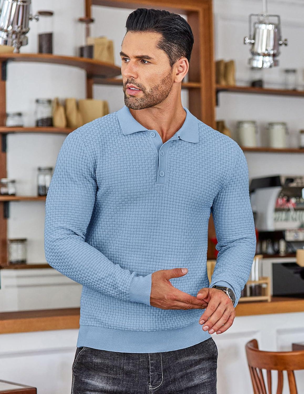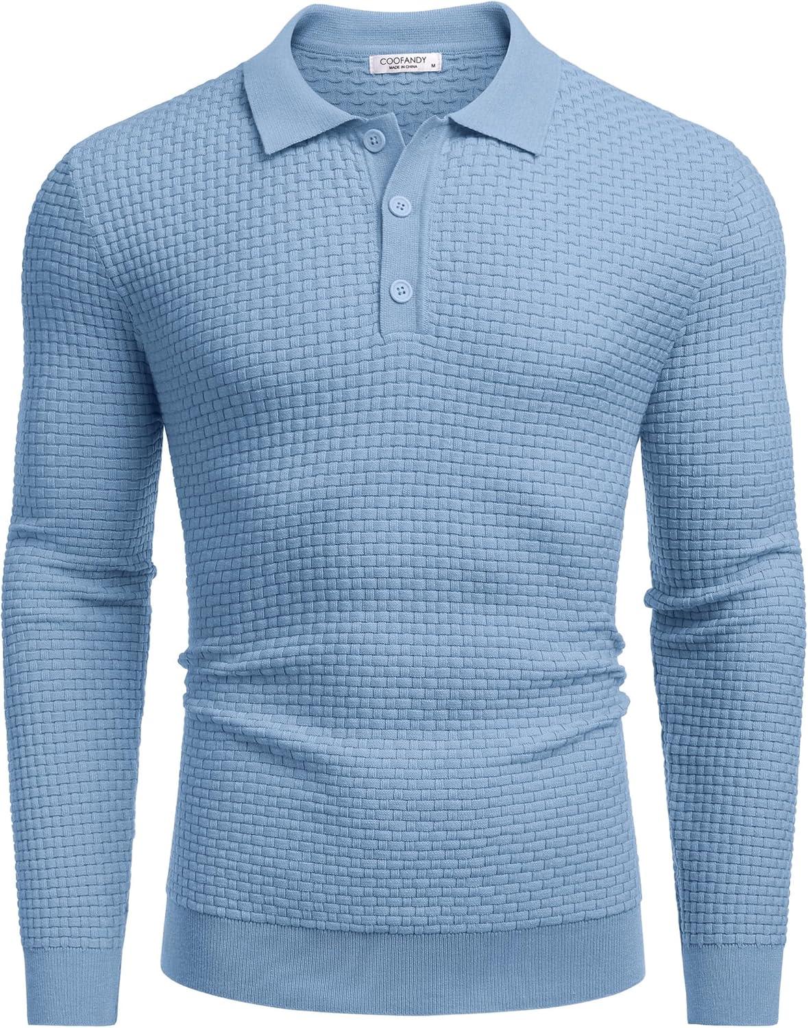 COOFANDY Men’s Knit Polo Shirts Long Sleeve Sweater Polo Lightweight Fashion Casual Collared Shirts(Airy Blue)