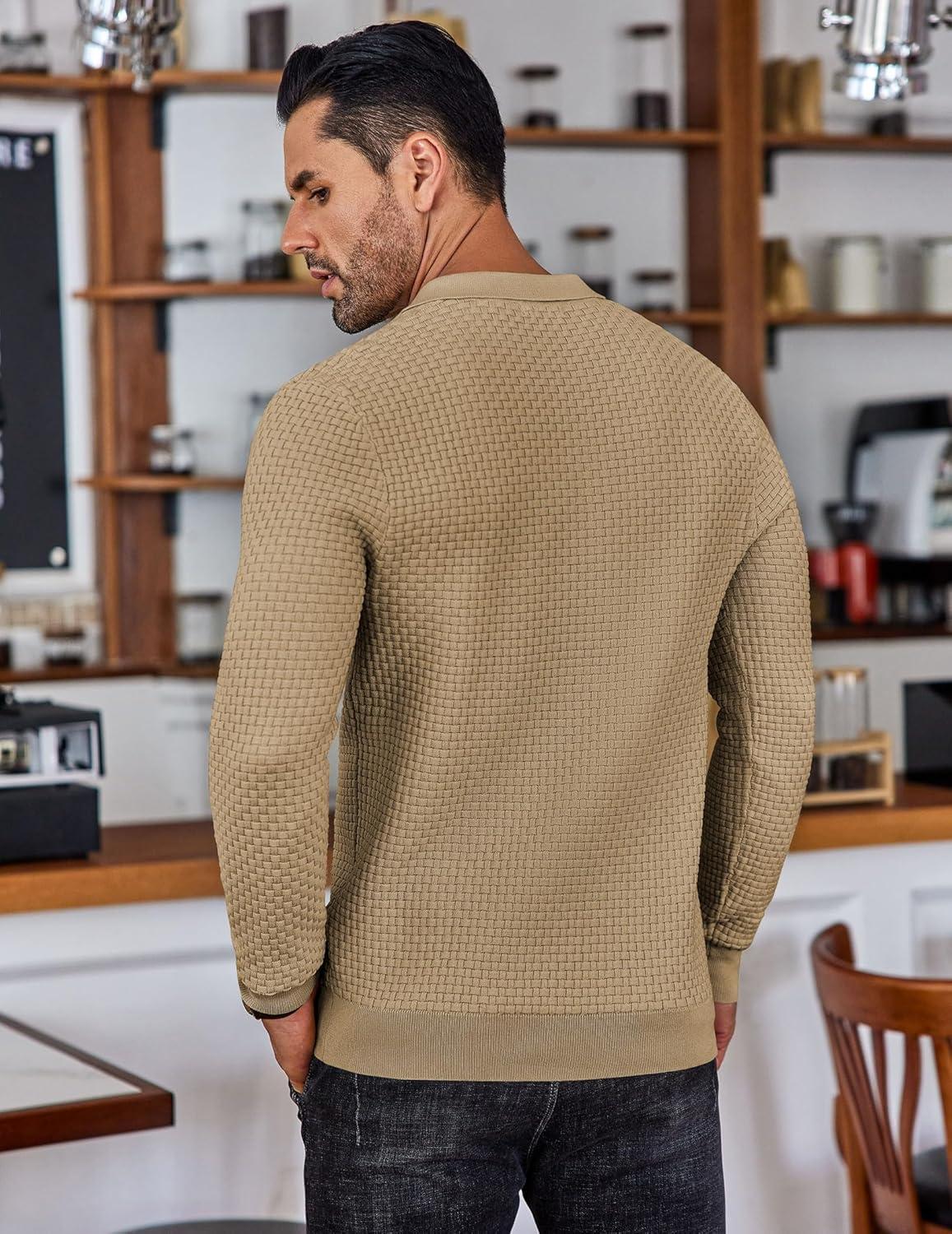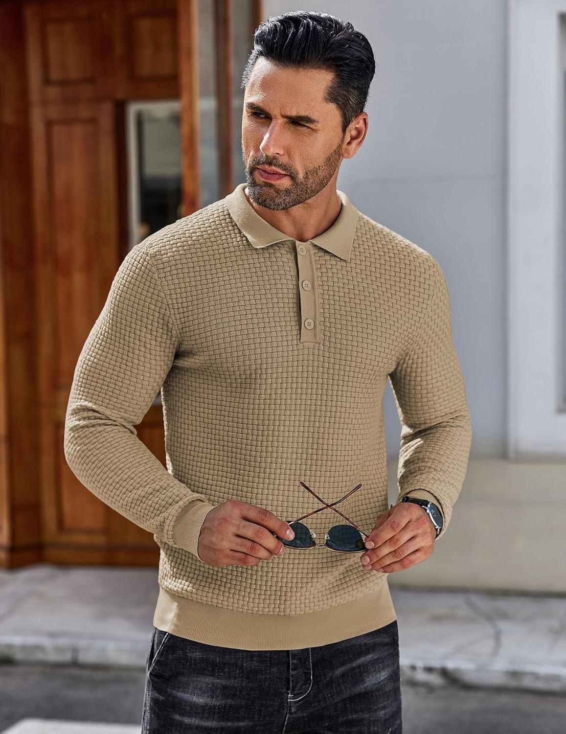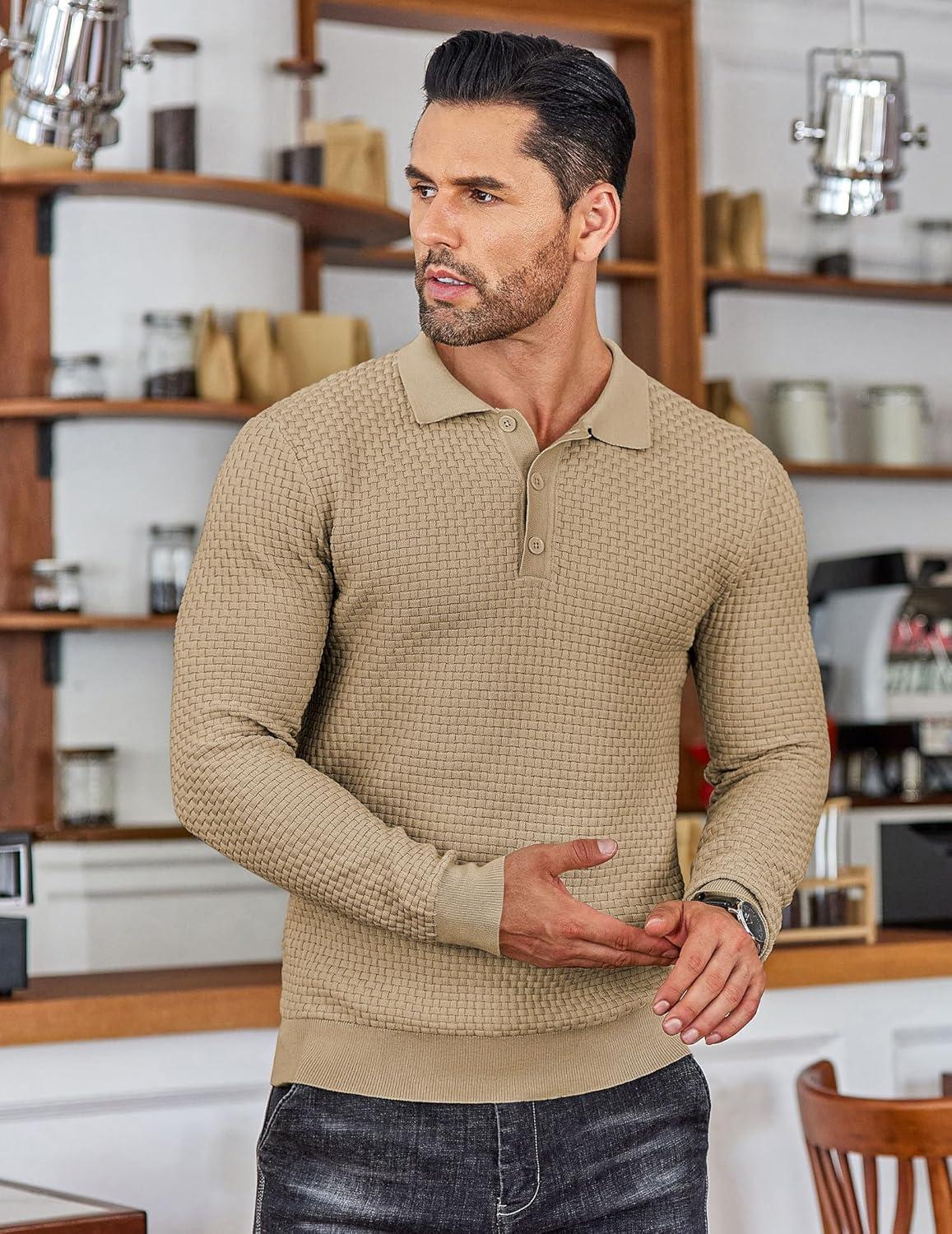 COOFANDY Men's Knit Polo Shirts Long Sleeve Sweater Polo Lightweight Fashion Casual Collared Shirts(Khaki)