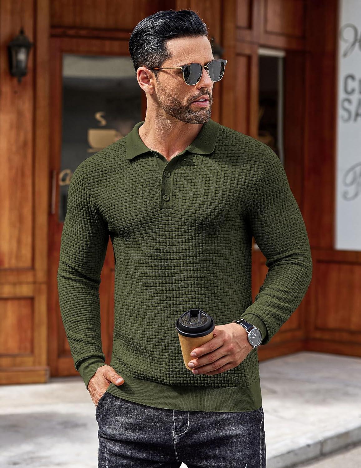 COOFANDY Men’s Knit Polo Shirts Long Sleeve Sweater Polo Lightweight Fashion Casual Collared T Shirts(Army Green)