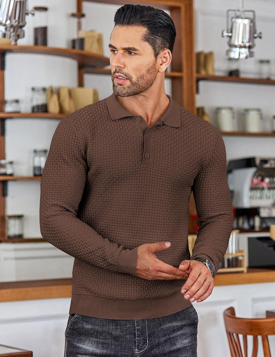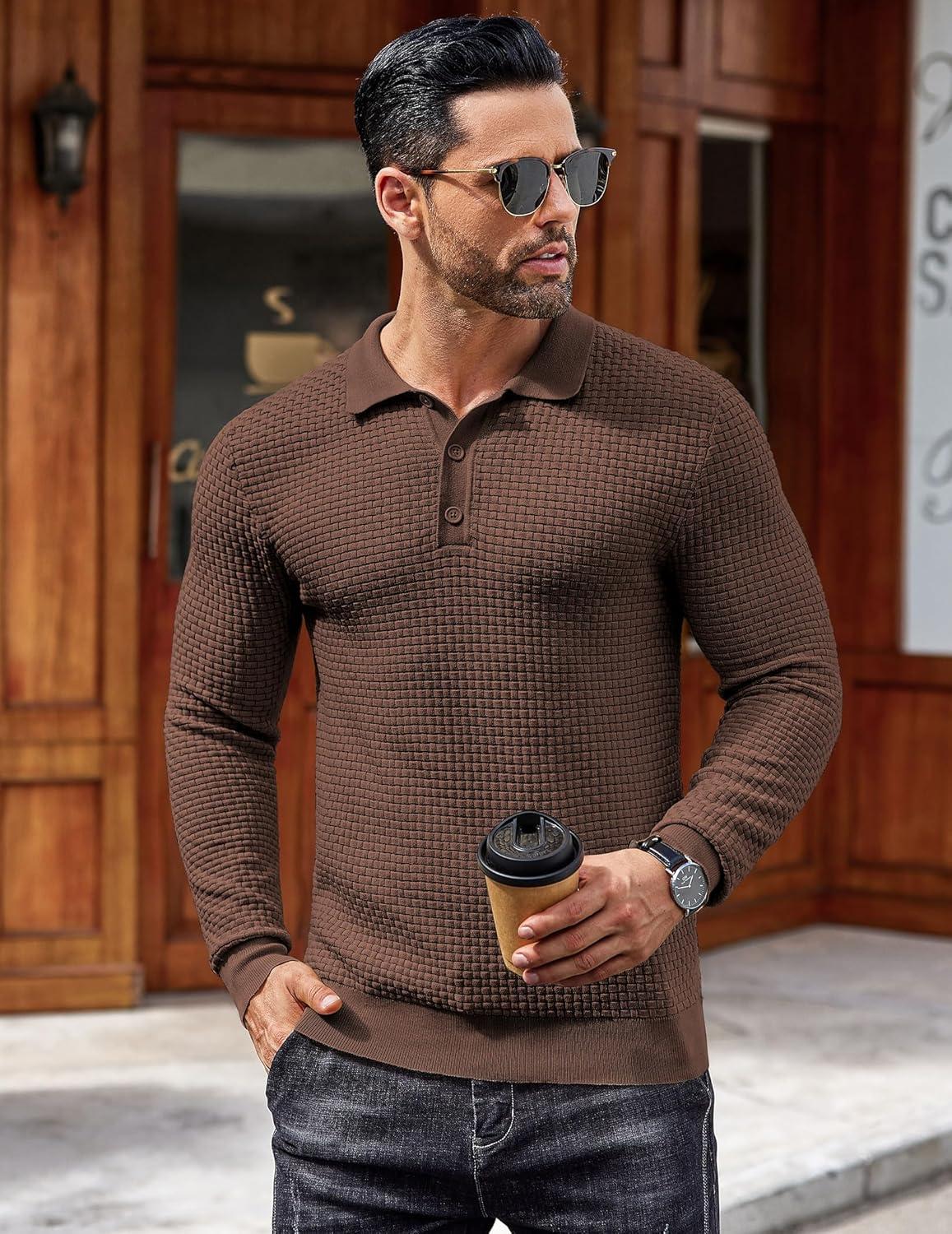 COOFANDY Men’s Knit Polo Shirts Long Sleeve Sweater Polo Lightweight Fashion Casual Collared T Shirts(Brown)